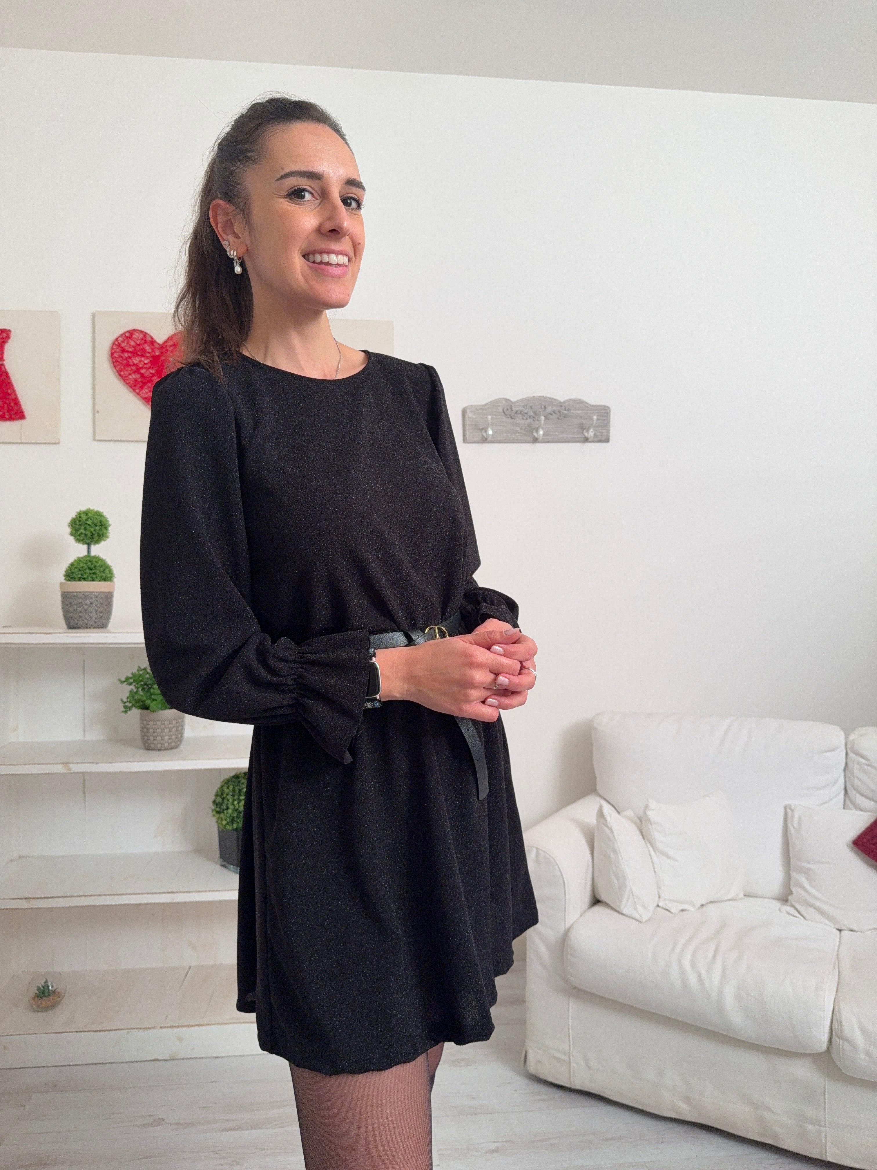 Descrizione: Abitino in lurex con scollo tondo e manica lunga con elastico nei polsini. Cintura in ecopelle rimovibile.