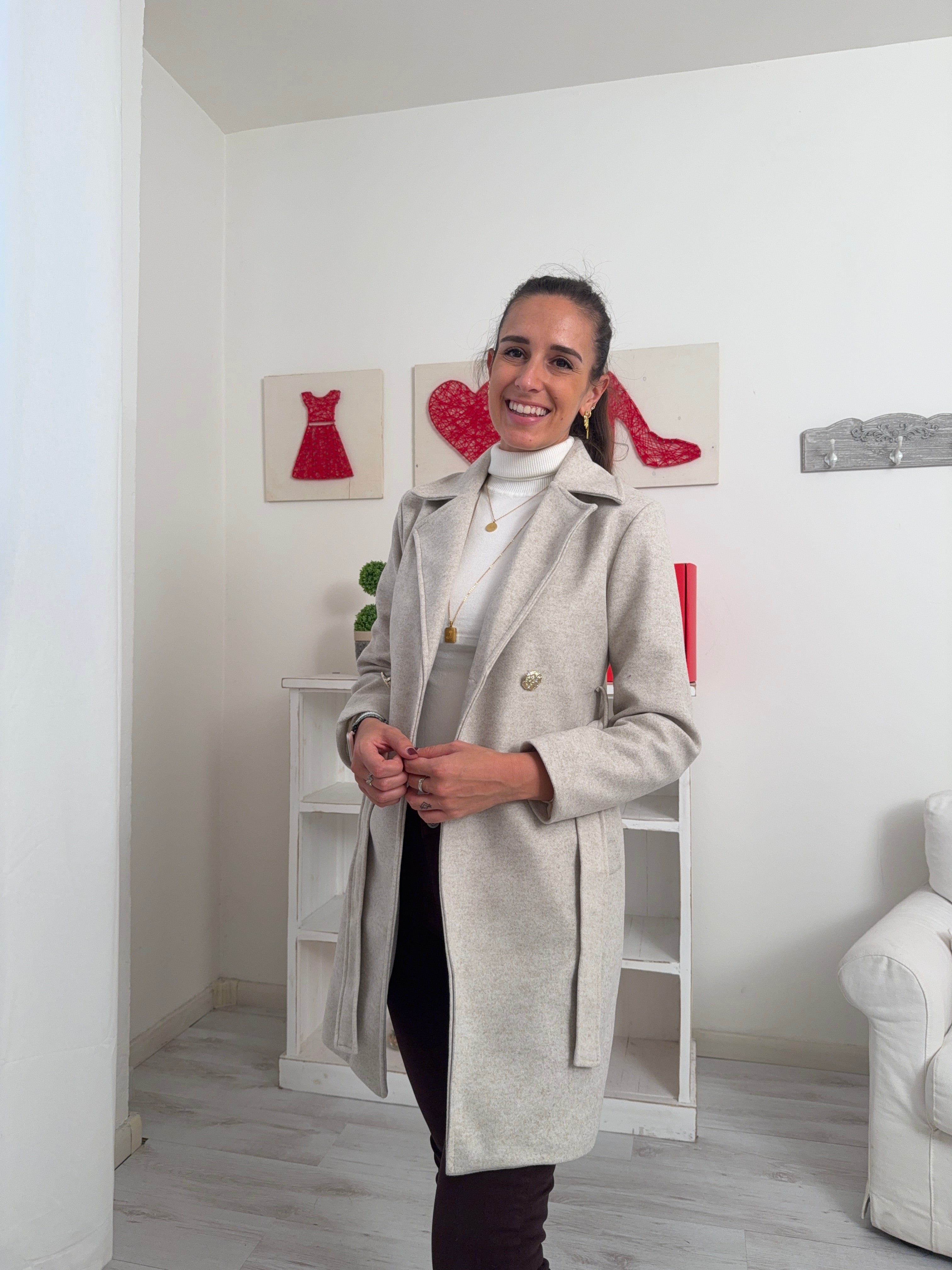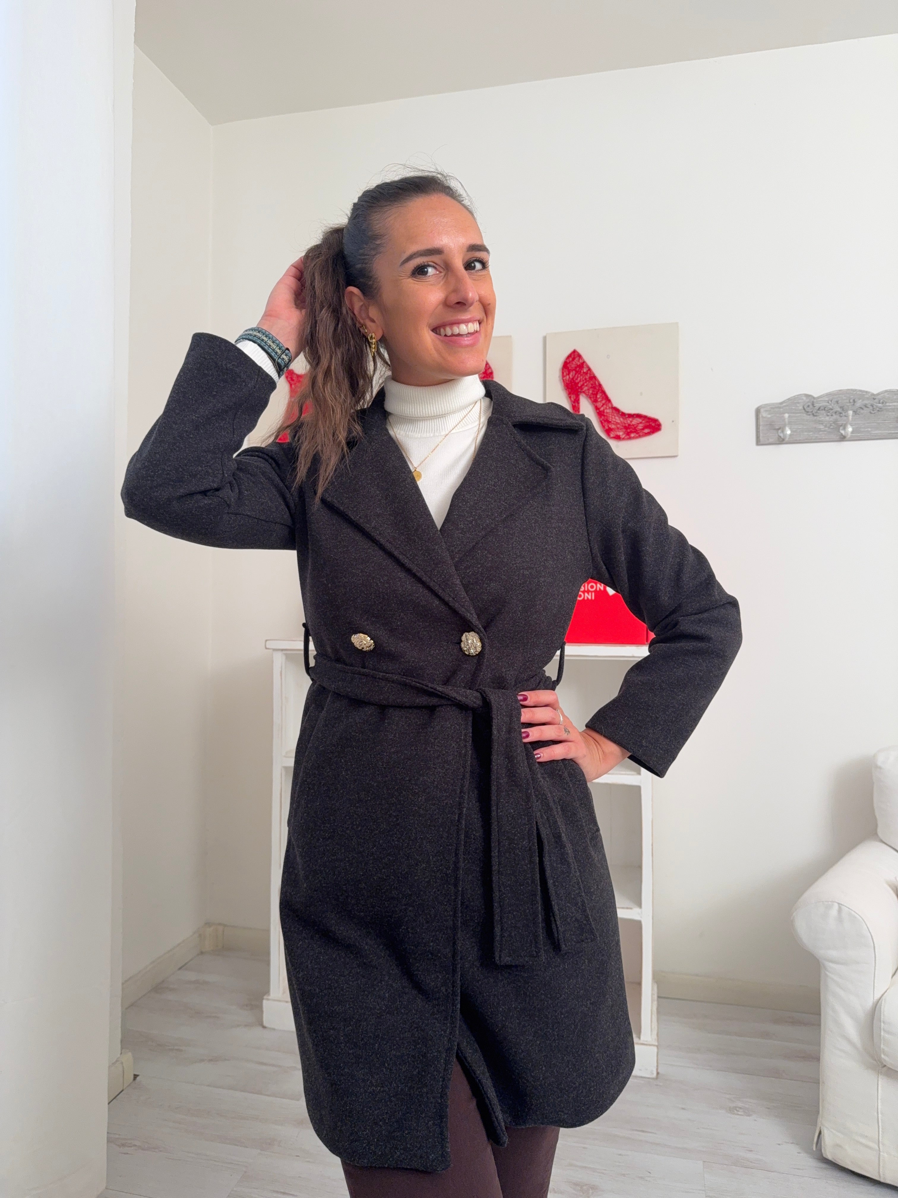 Descrizione: Trench con fodera interna, spalline imbottite 2 taschini laterali e chiusura con bottone gioiello e laccio.