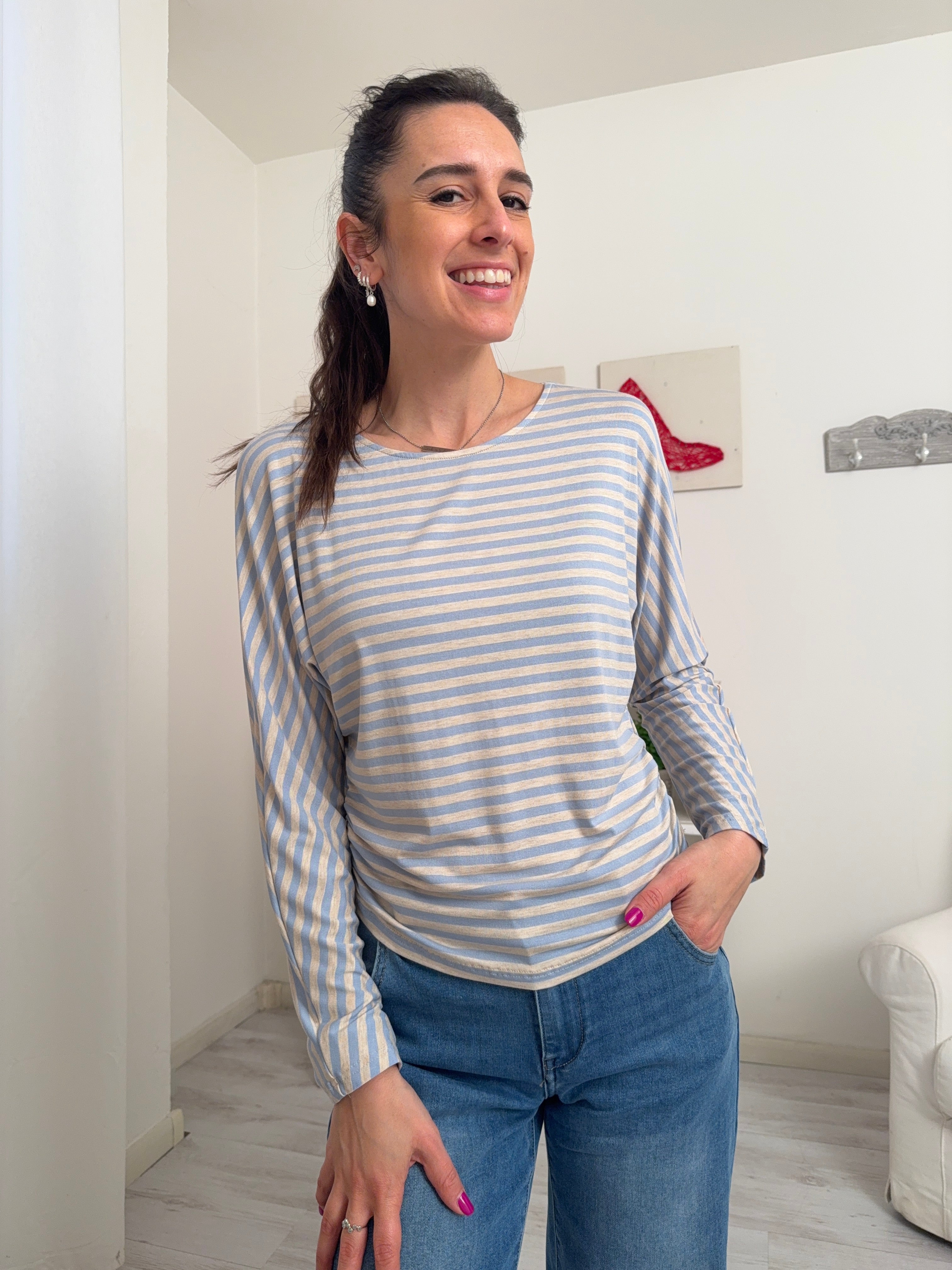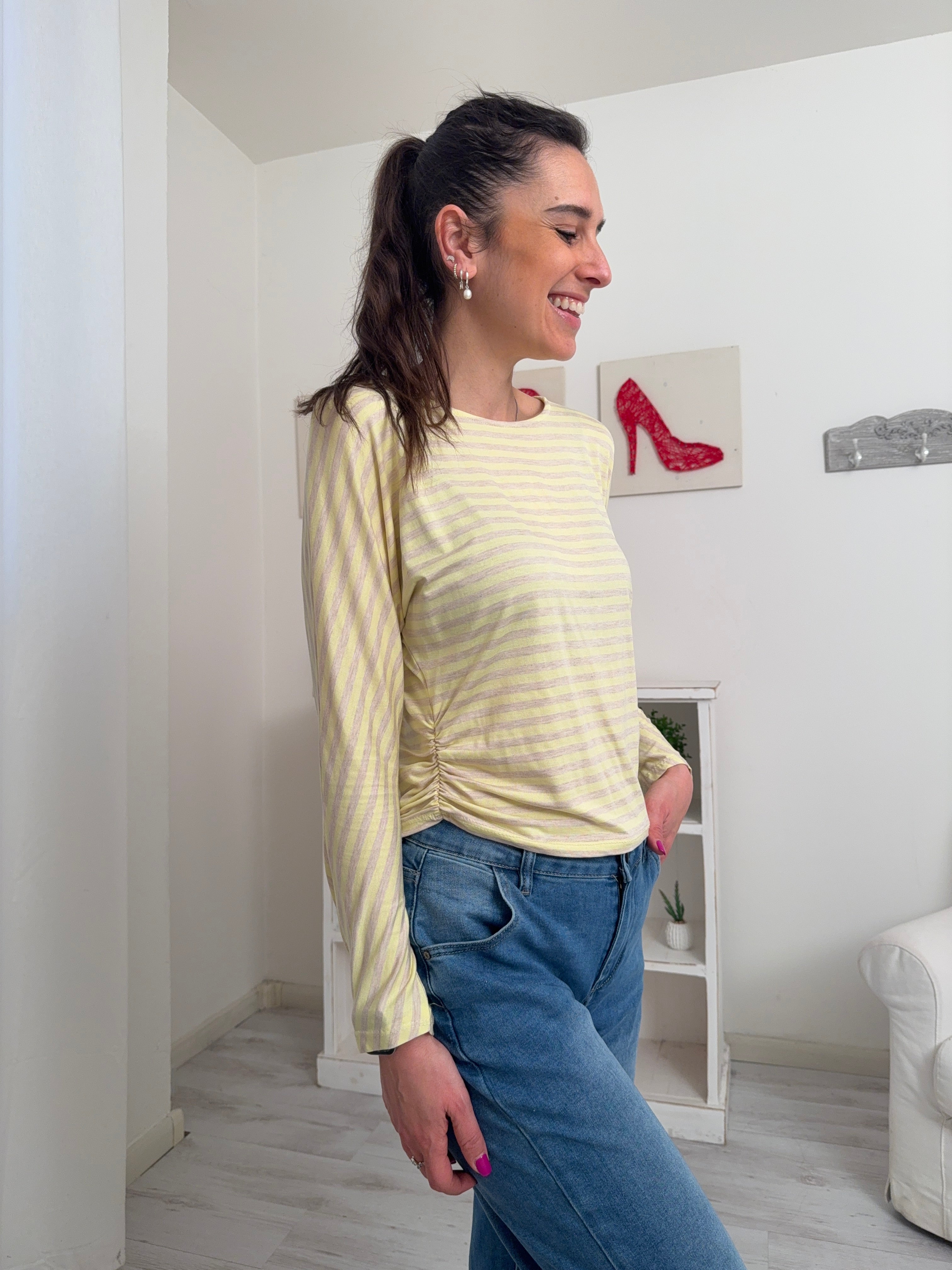Descrizione: Blusa leggera con scollo tondo, manica lunga ed arriccio sui fianchi.