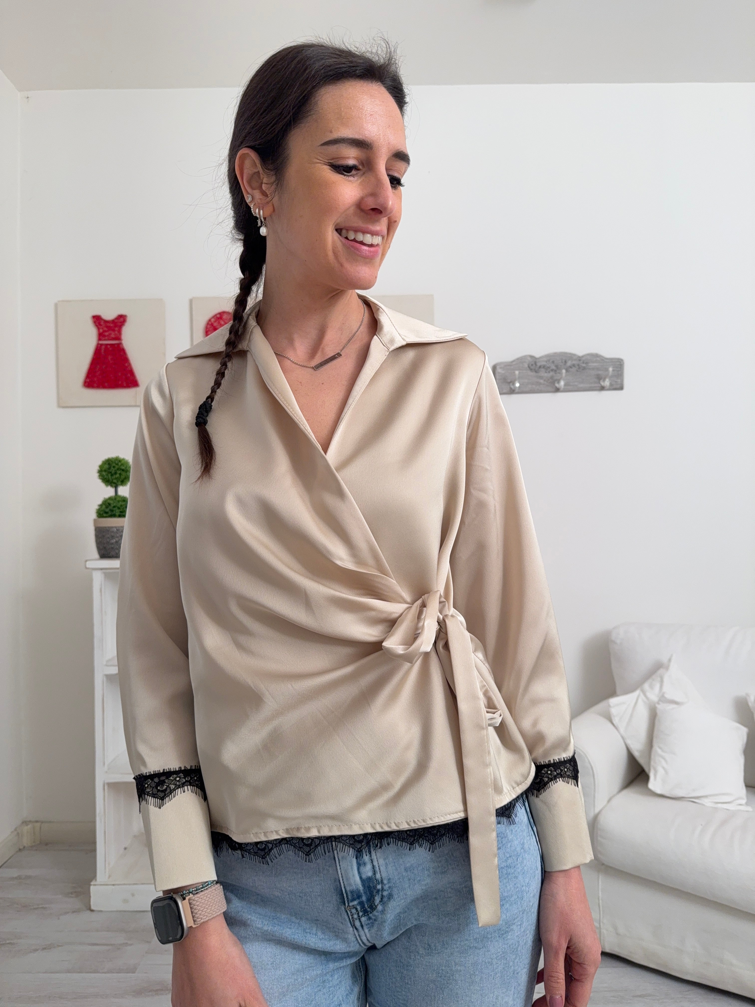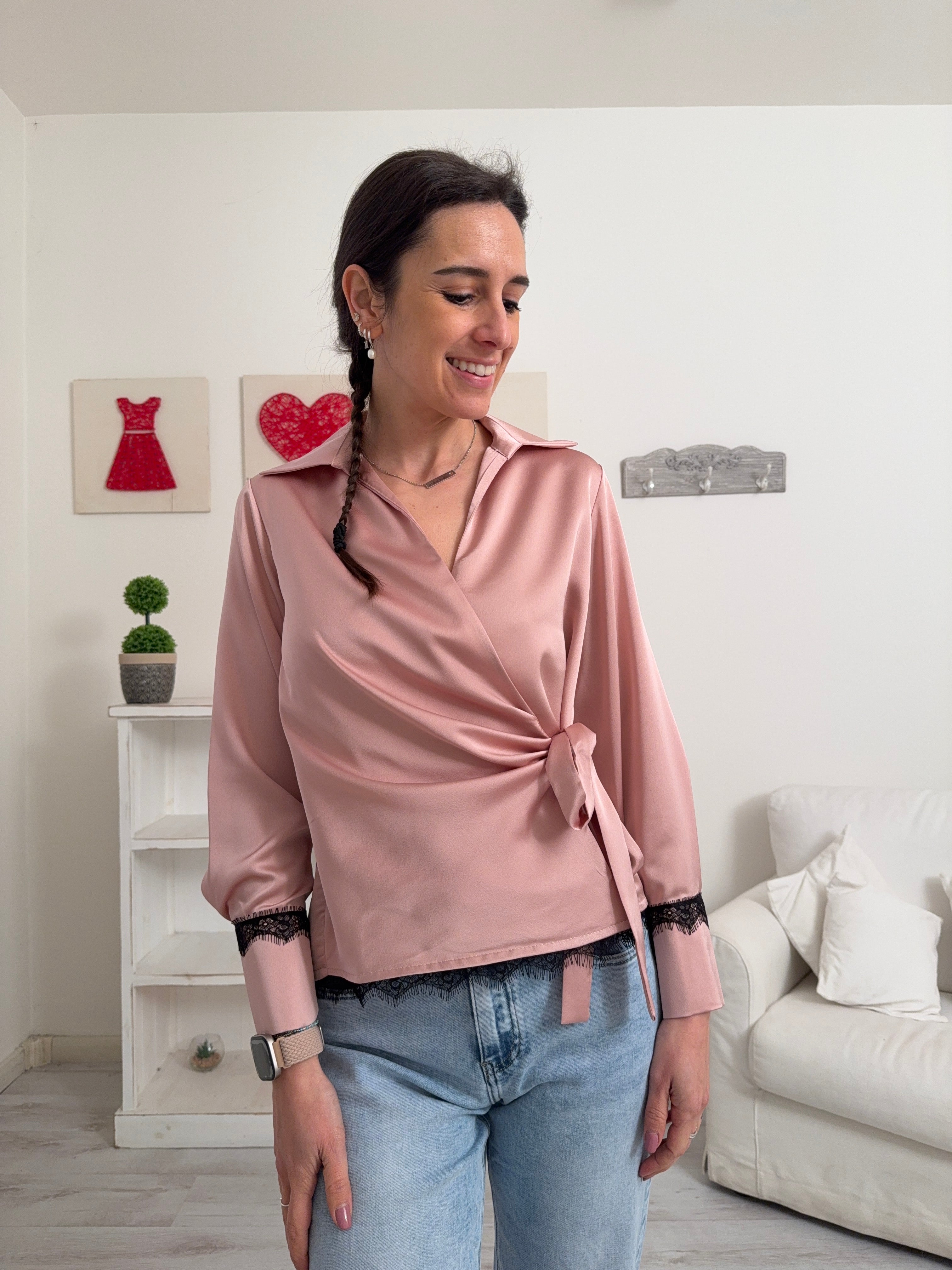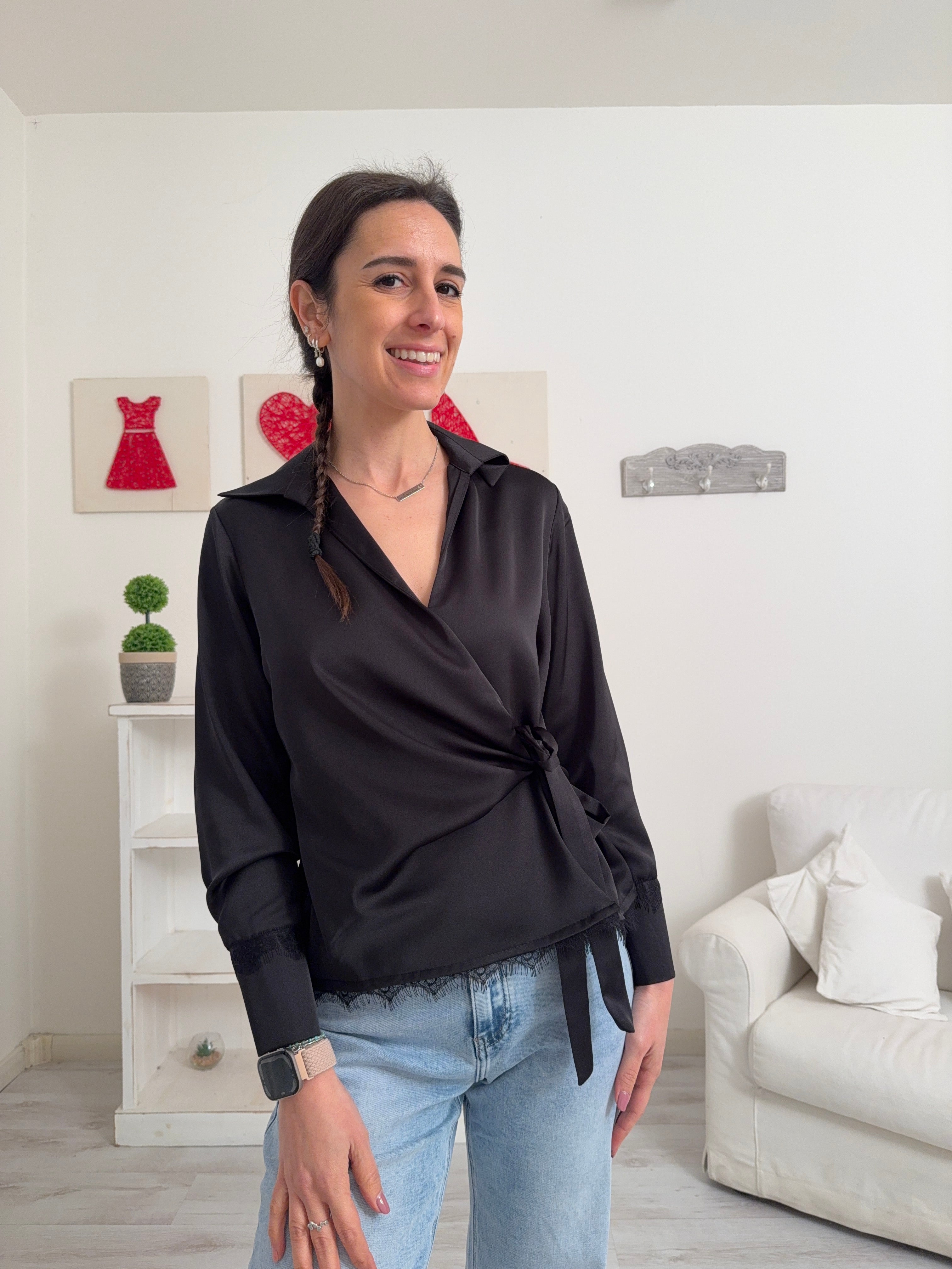 Descrizione: Blusa in tessuto tipo raso con colletto da camicia e pizzo nero nel polsino e nella parte inferiore. Chiusura a kimono con laccetto e bottone interno.