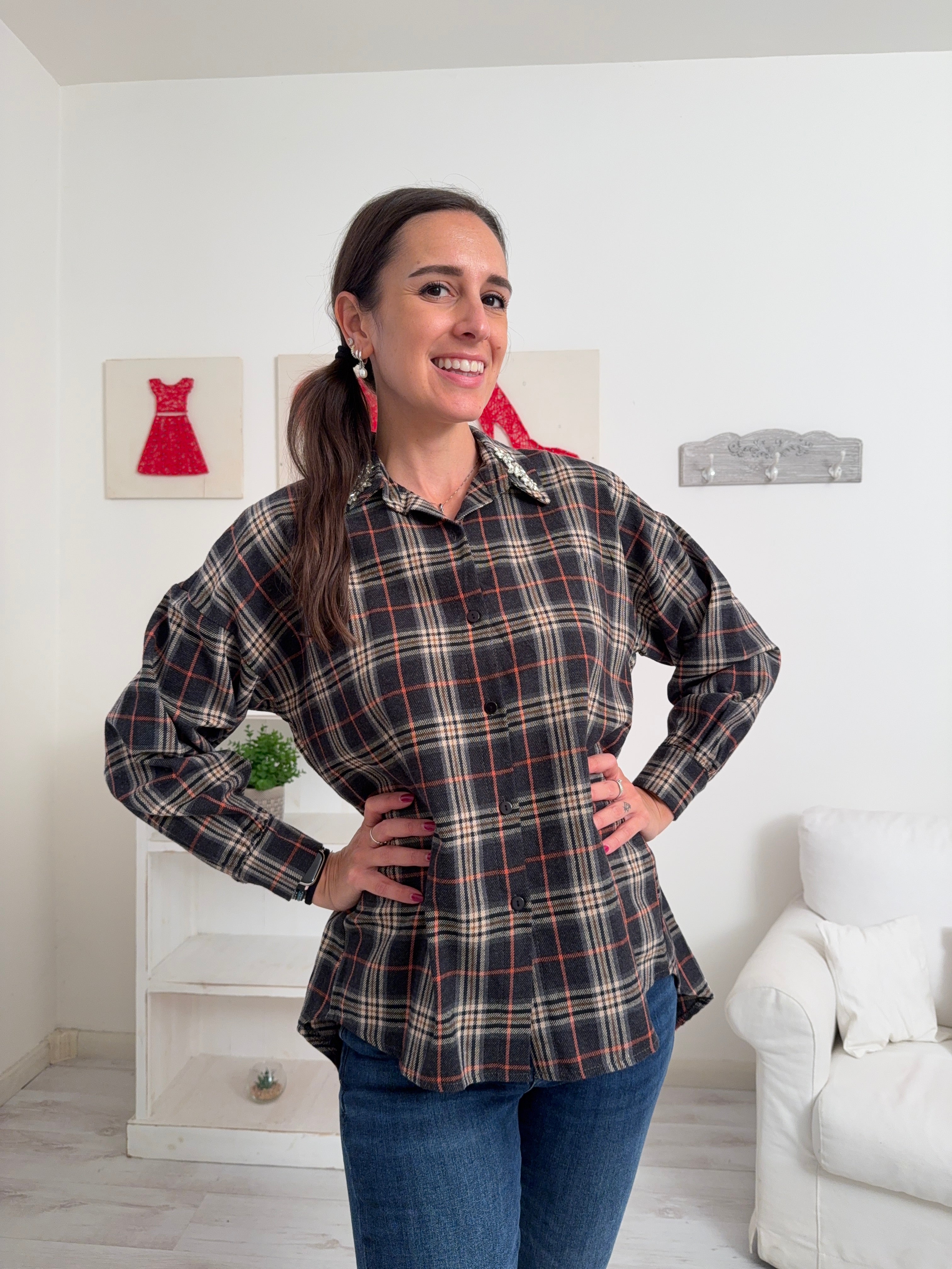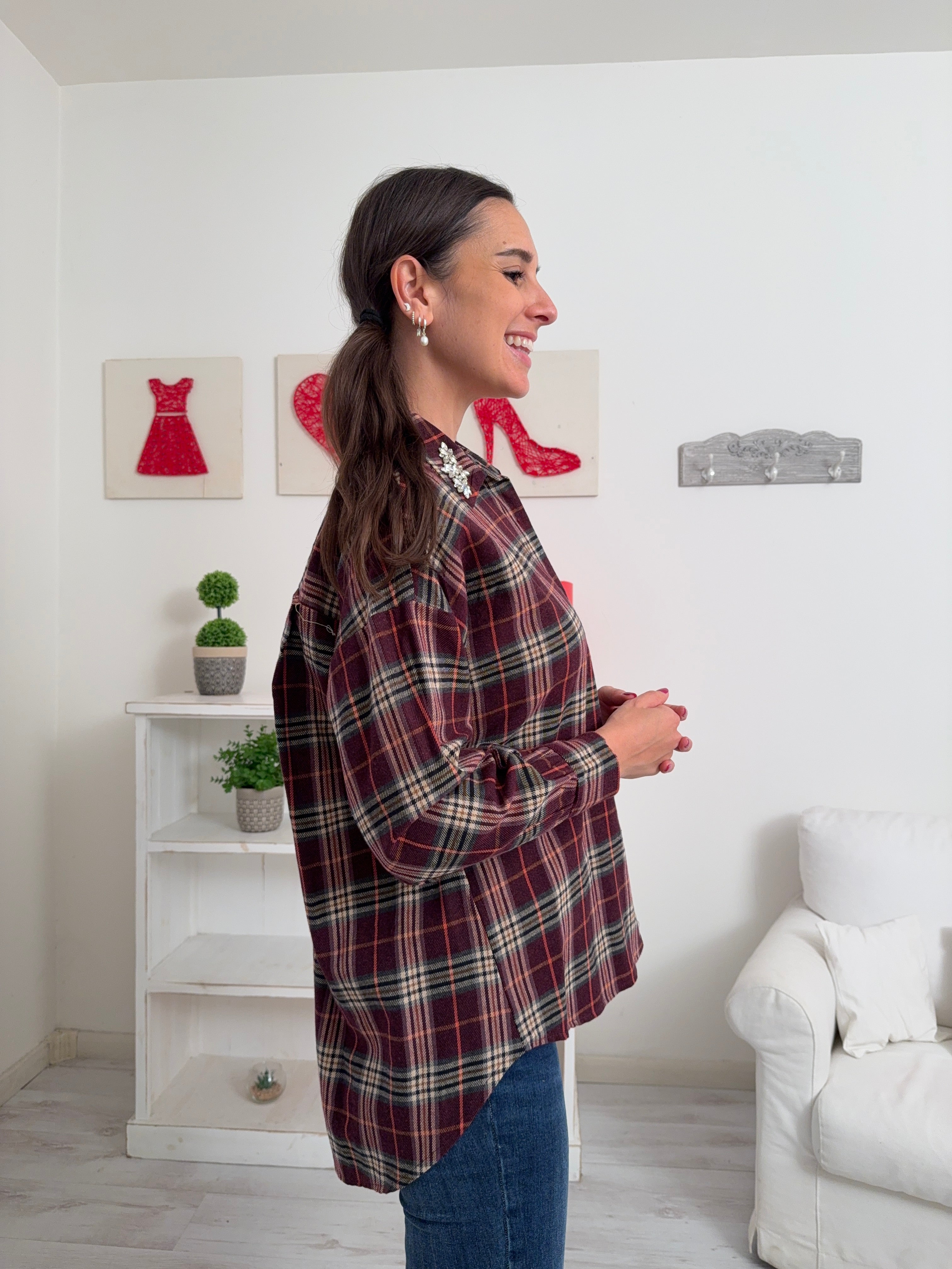 Descrizione: Camicia classica over in cotone pesante con bottoni su tutta la lunghezza e maniche lunghe. Applicazione di pietrine nel colletto e leggermente più lunga dietro.