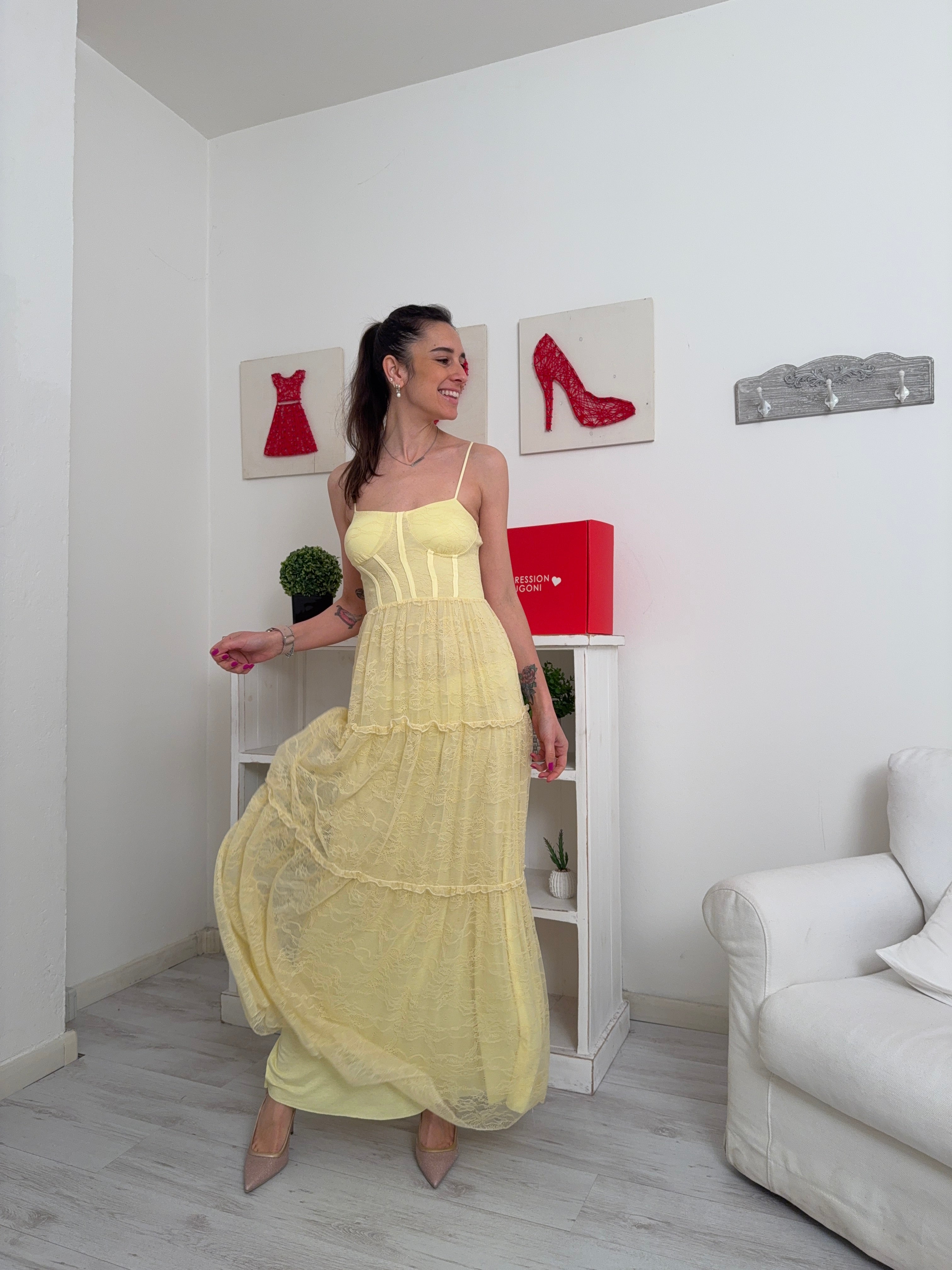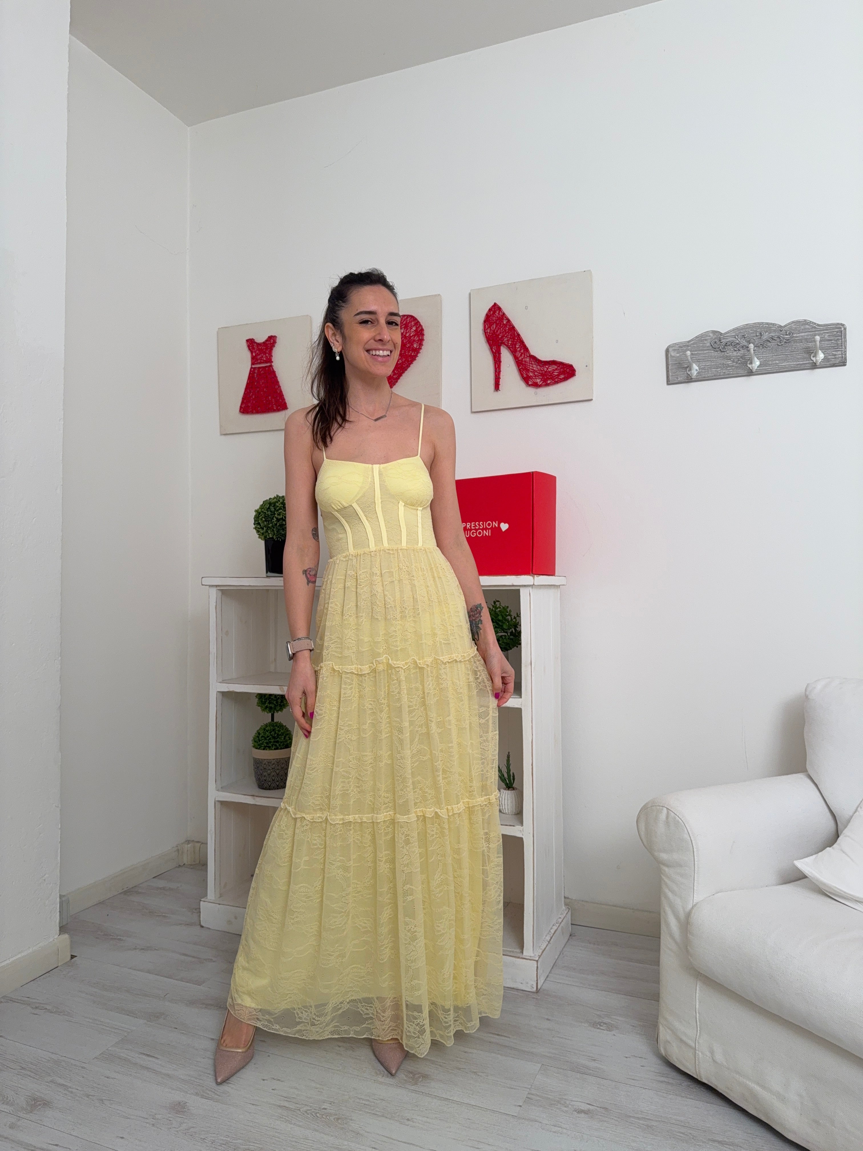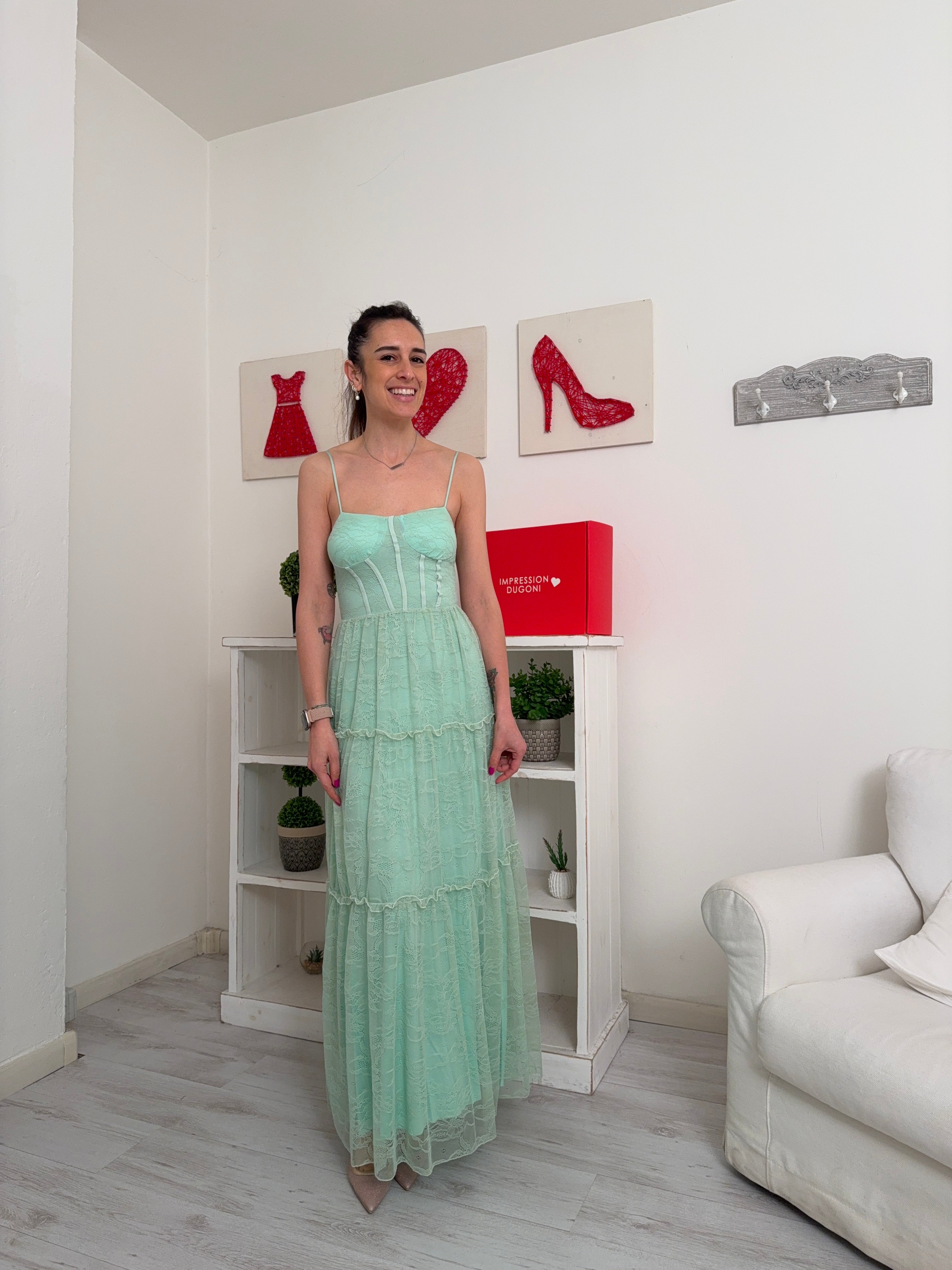 Descrizione: Abito lungo in pizzo a canotta con sottoveste, spalline regolabili, seno imbottito ed elastico dietro nel torace.