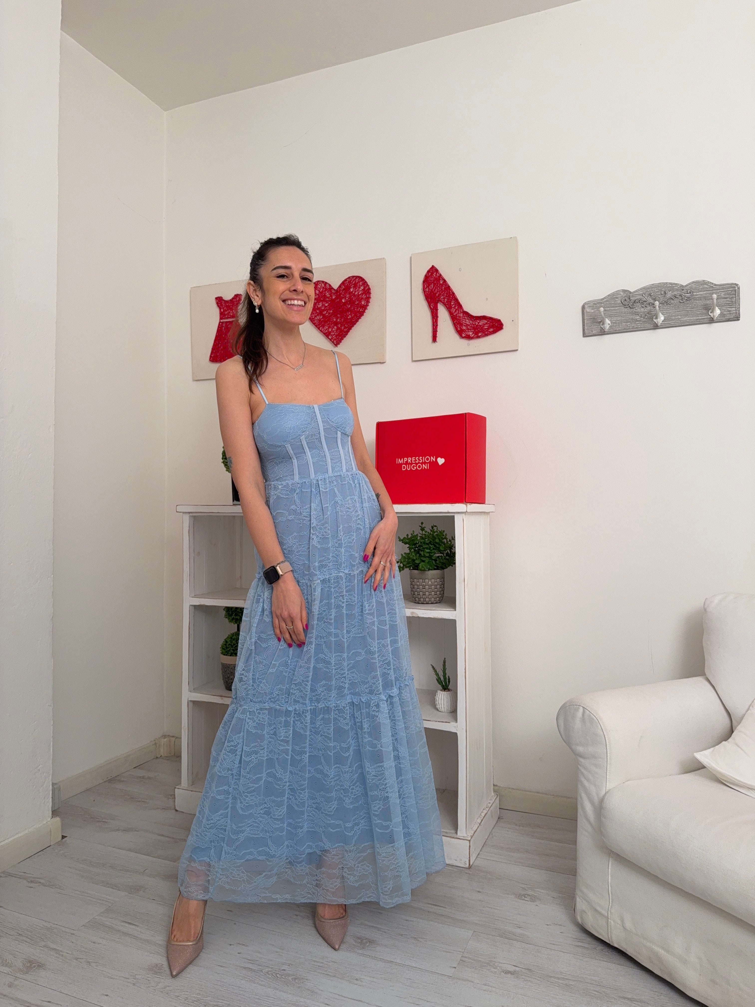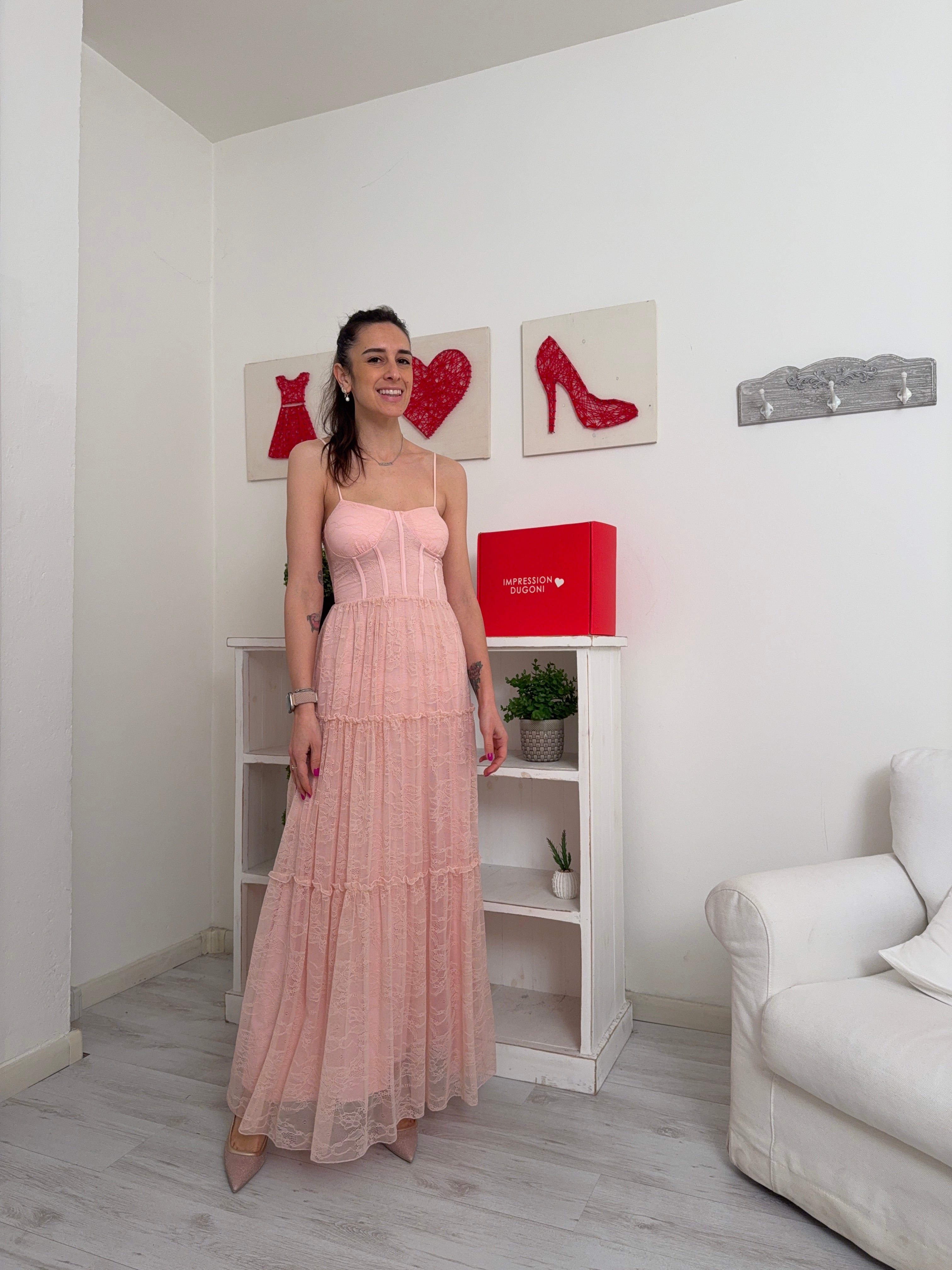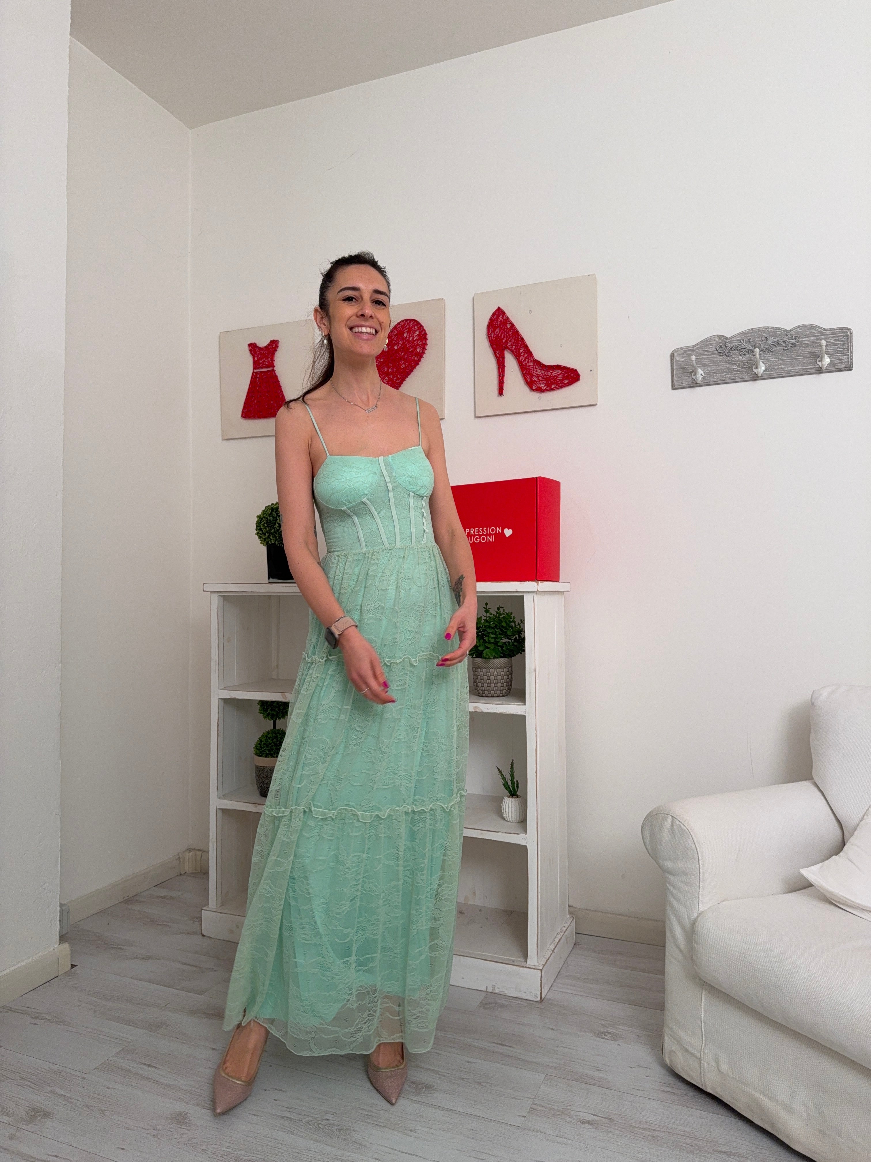 Descrizione: Abito lungo in pizzo a canotta con sottoveste, spalline regolabili, seno imbottito ed elastico dietro nel torace.