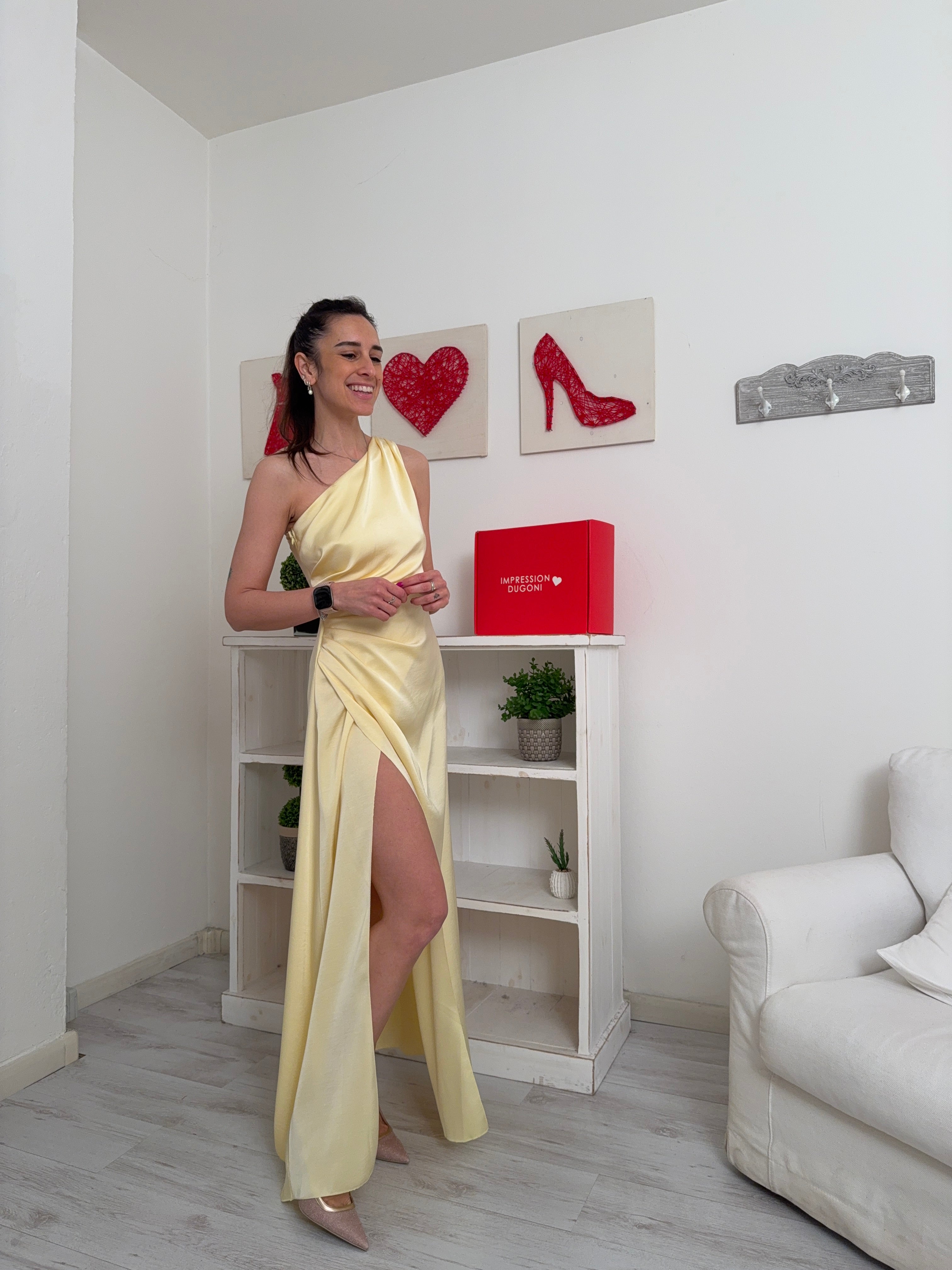 Descrizione: Abito monospalla tipo raso con arriccio su un fianco e spacco nella gonna fino in vita. Cerniera a scomparsa sul fianco.
