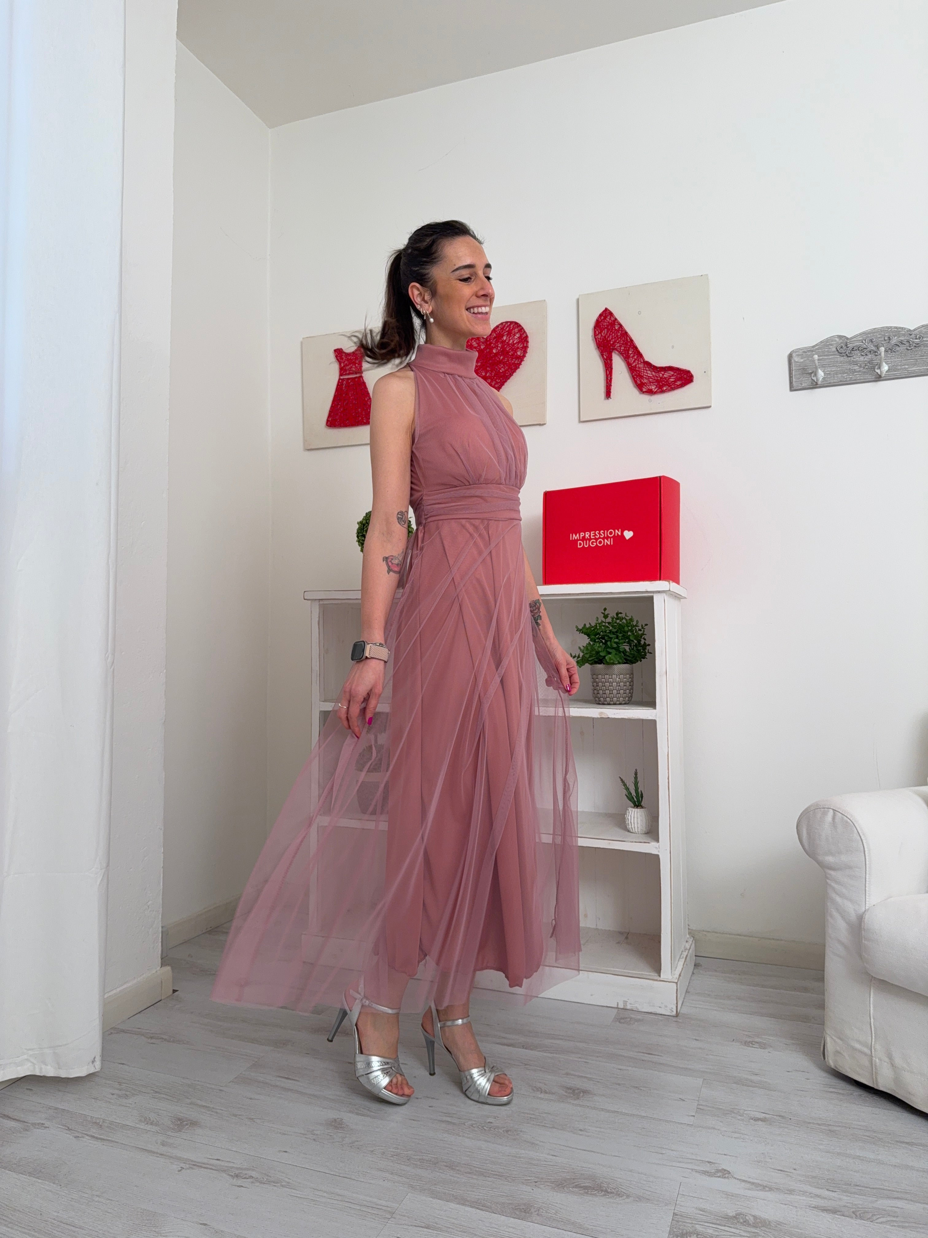 Descrizione: Abito in tulle con sottoveste, senza maniche con collo all'americana. Seno imbottito, fiocco dietro e bottoncini nel collo con spacco nella schiena.