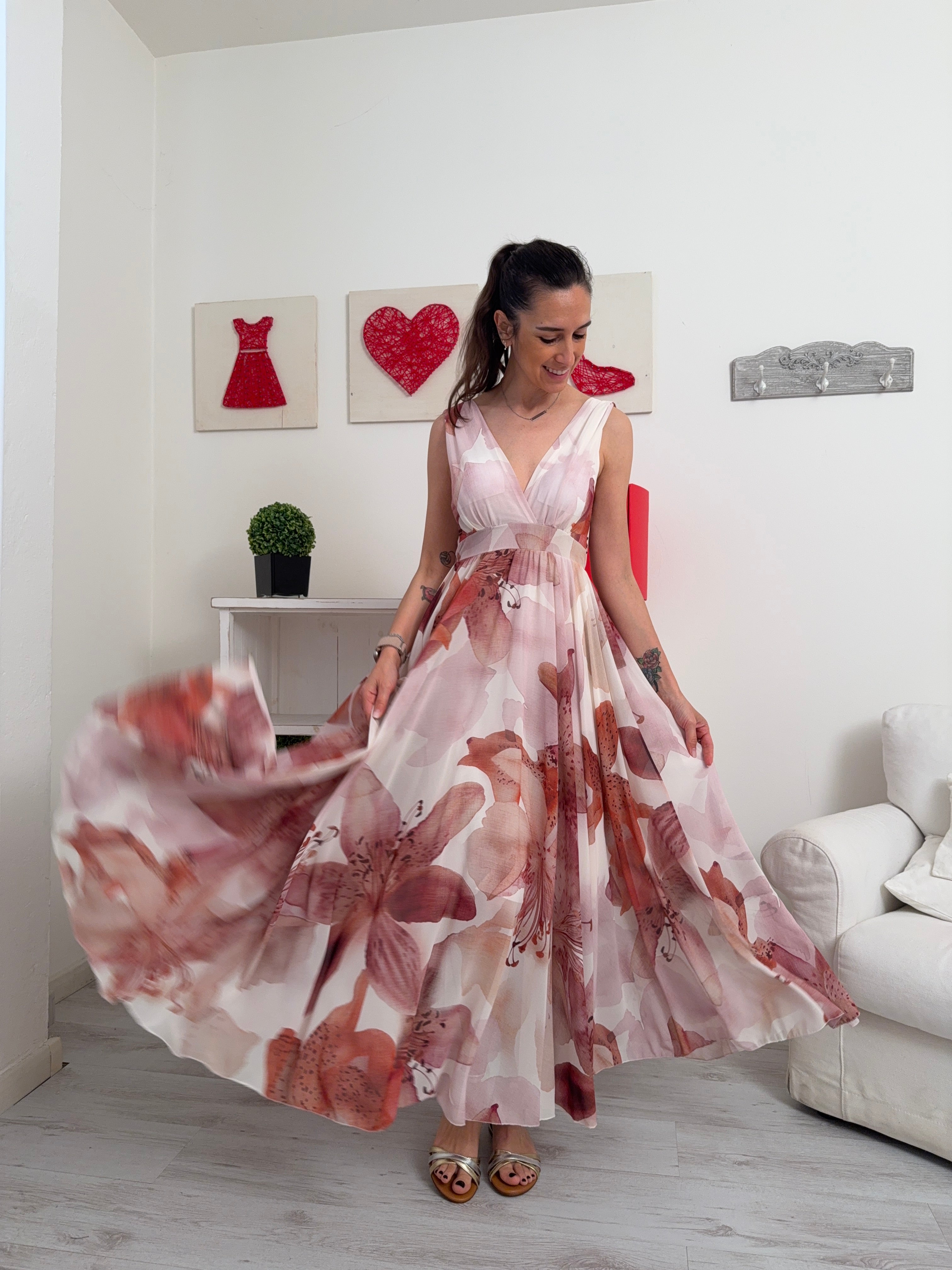 Descrizione: Abito senza maniche con scollo a V, seno imbottito ed elastico sotto il seno. Sottoveste nella gonna e davanti.