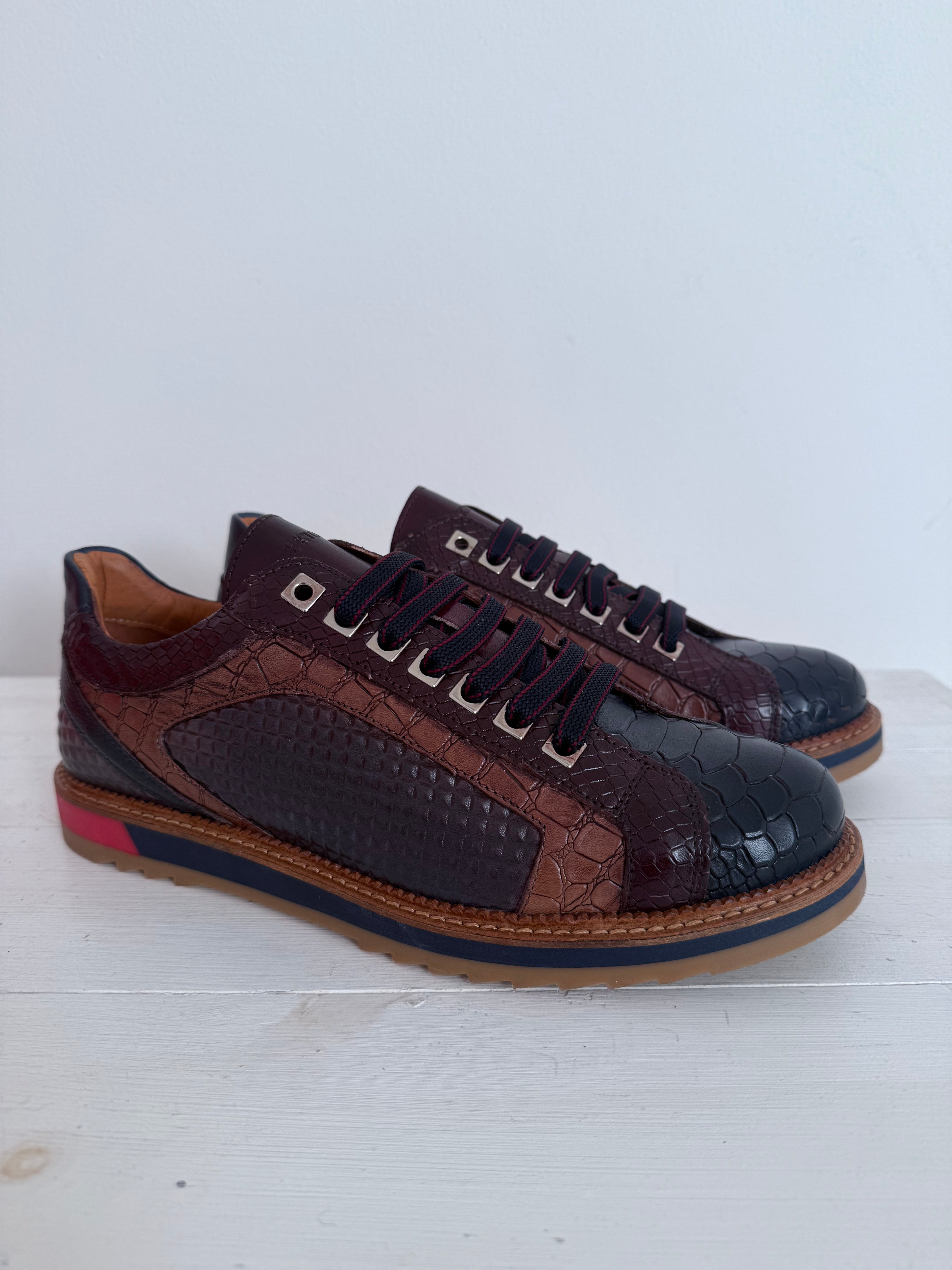 Sneaker dal design esclusivo che unisce artigianalità e modernità. Realizzata in vitello stampato con texture marine, si distingue per il mix di tonalità legno, marrone e dettagli blu che conferiscono profondità e carattere. La lavorazione della pelle mette in risalto i contrasti materici, mentre la suola in gomma garantisce comfort e resistenza. Una calzatura versatile e ricercata, perfetta per chi desidera distinguersi con uno stile unico.