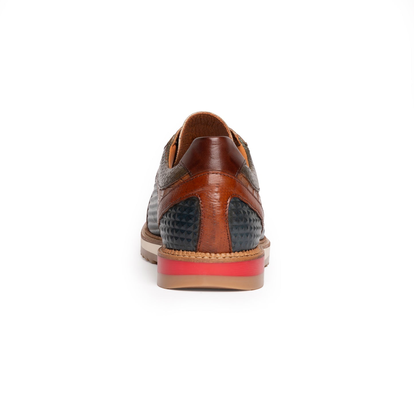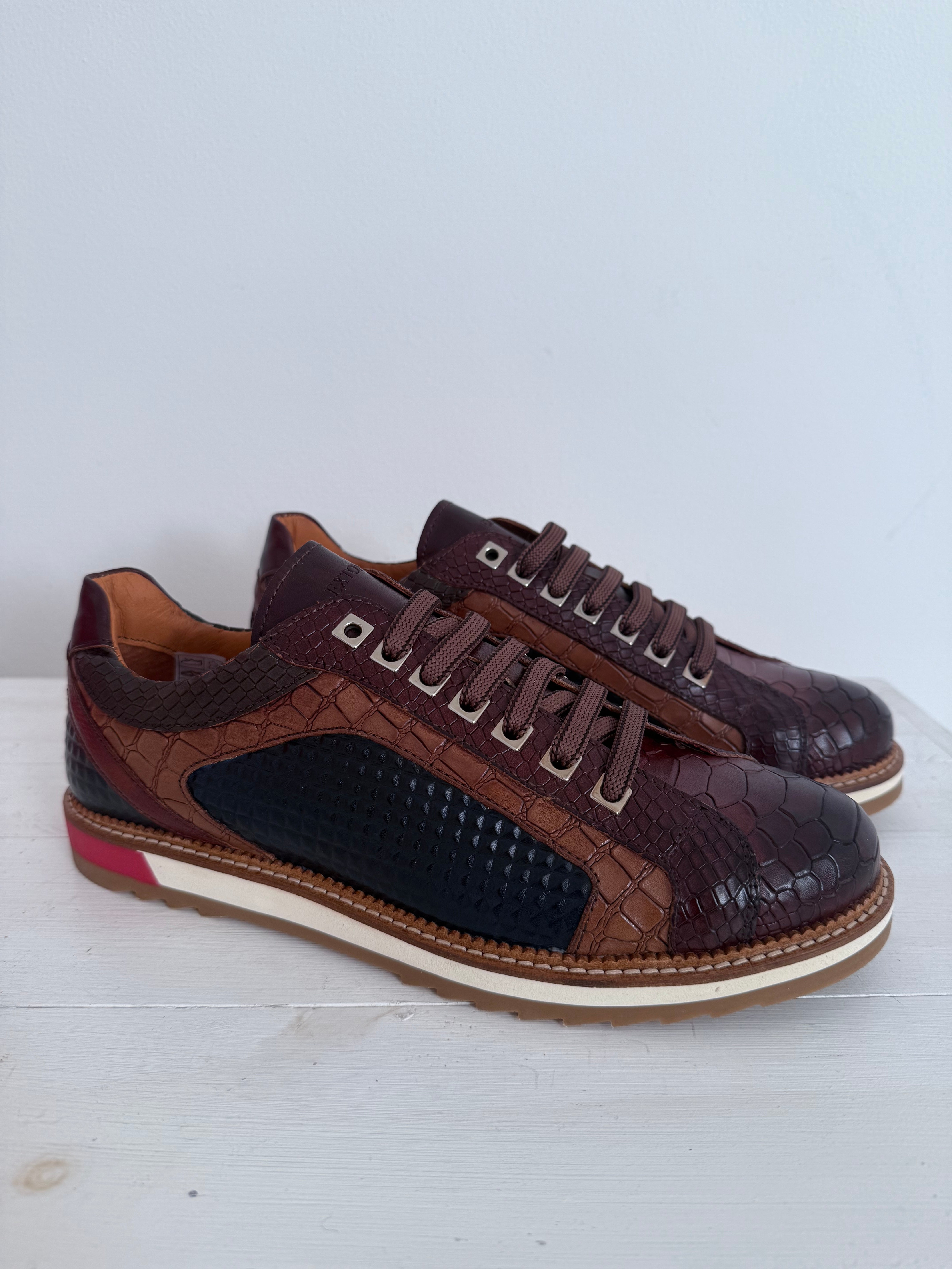 Sneaker dal design esclusivo che unisce artigianalità e modernità. Realizzata in vitello stampato con texture marine, si distingue per il mix di tonalità legno, marrone e dettagli blu che conferiscono profondità e carattere. La lavorazione della pelle mette in risalto i contrasti materici, mentre la suola in gomma garantisce comfort e resistenza. Una calzatura versatile e ricercata, perfetta per chi desidera distinguersi con uno stile unico.