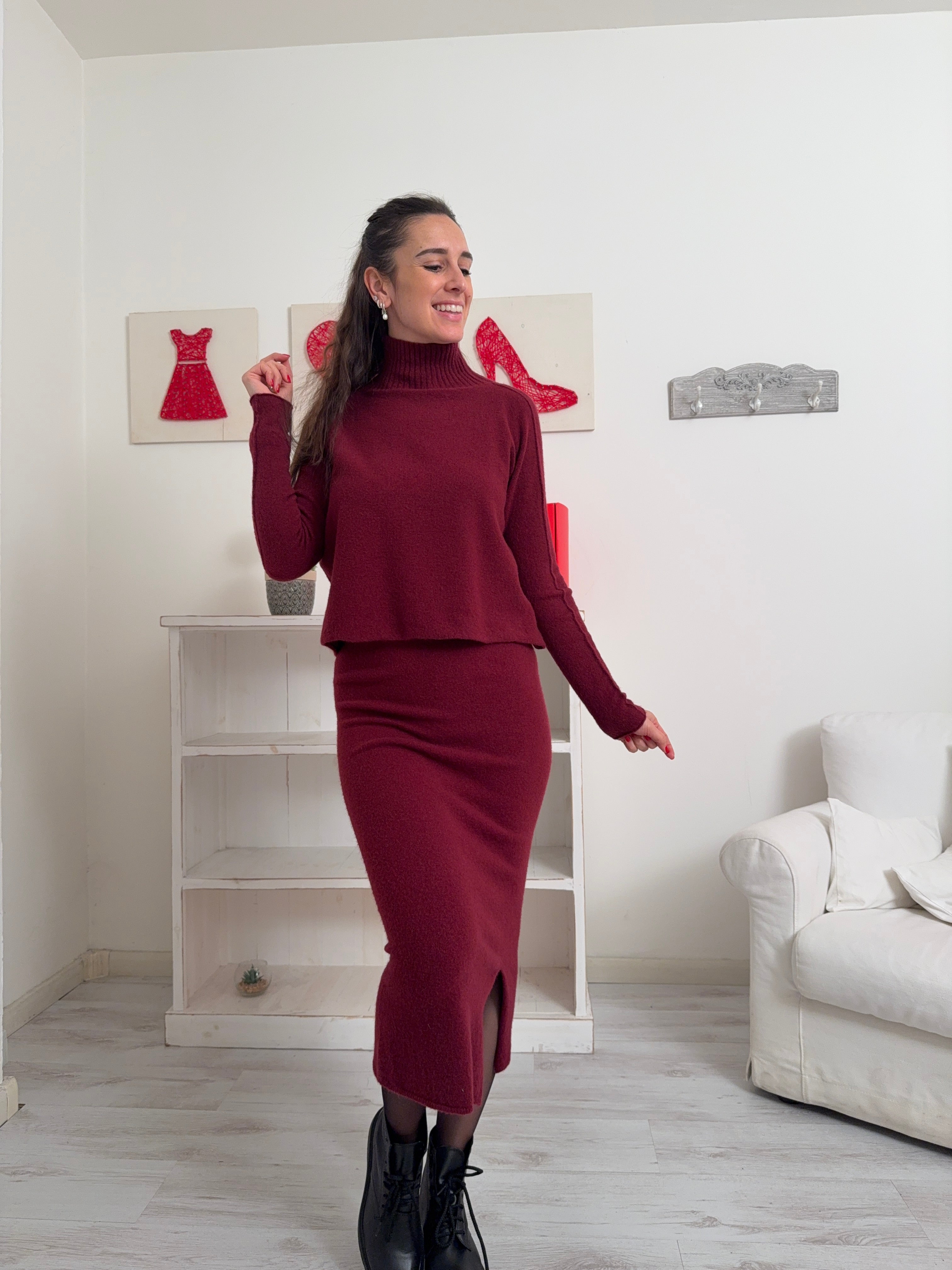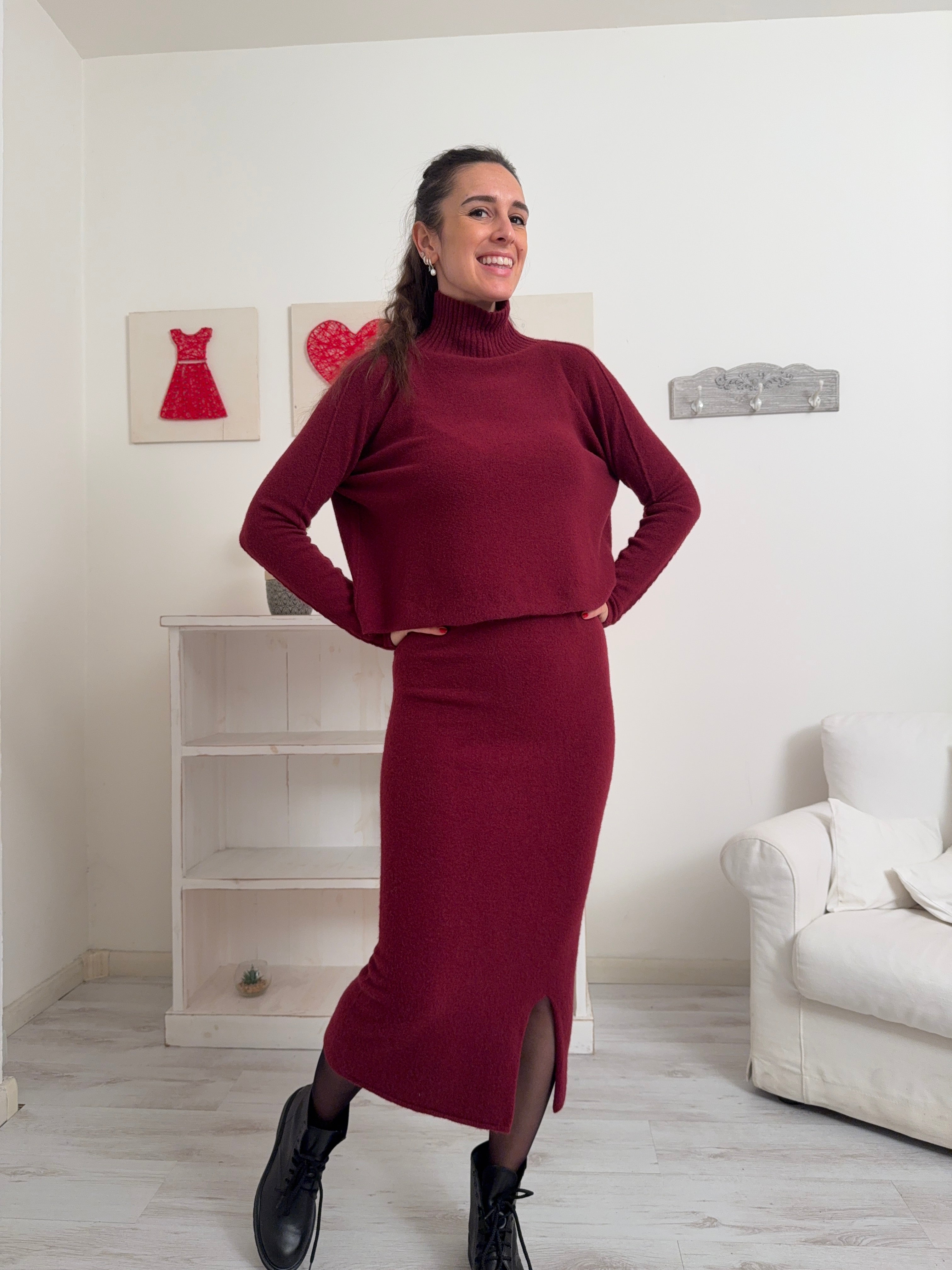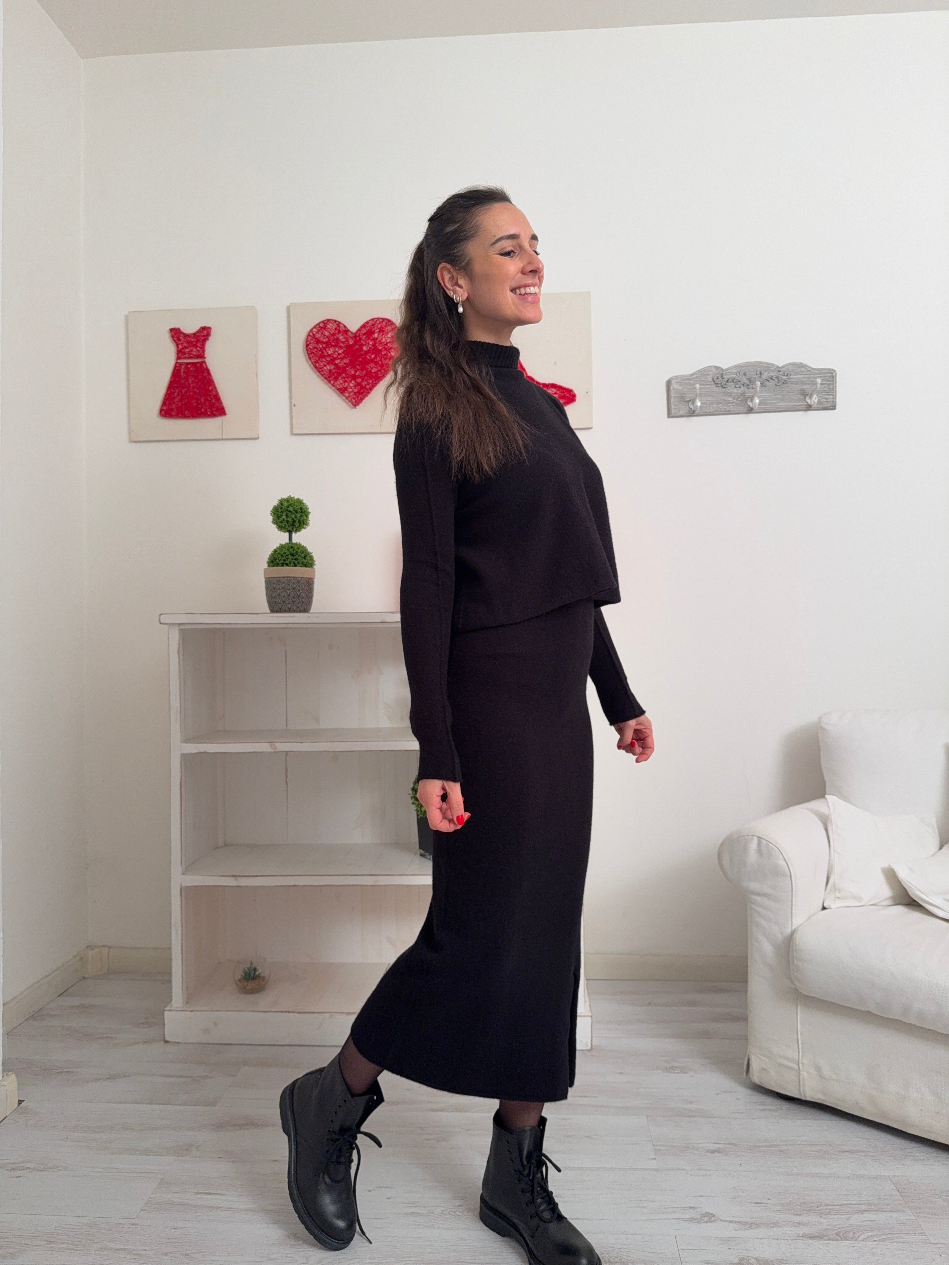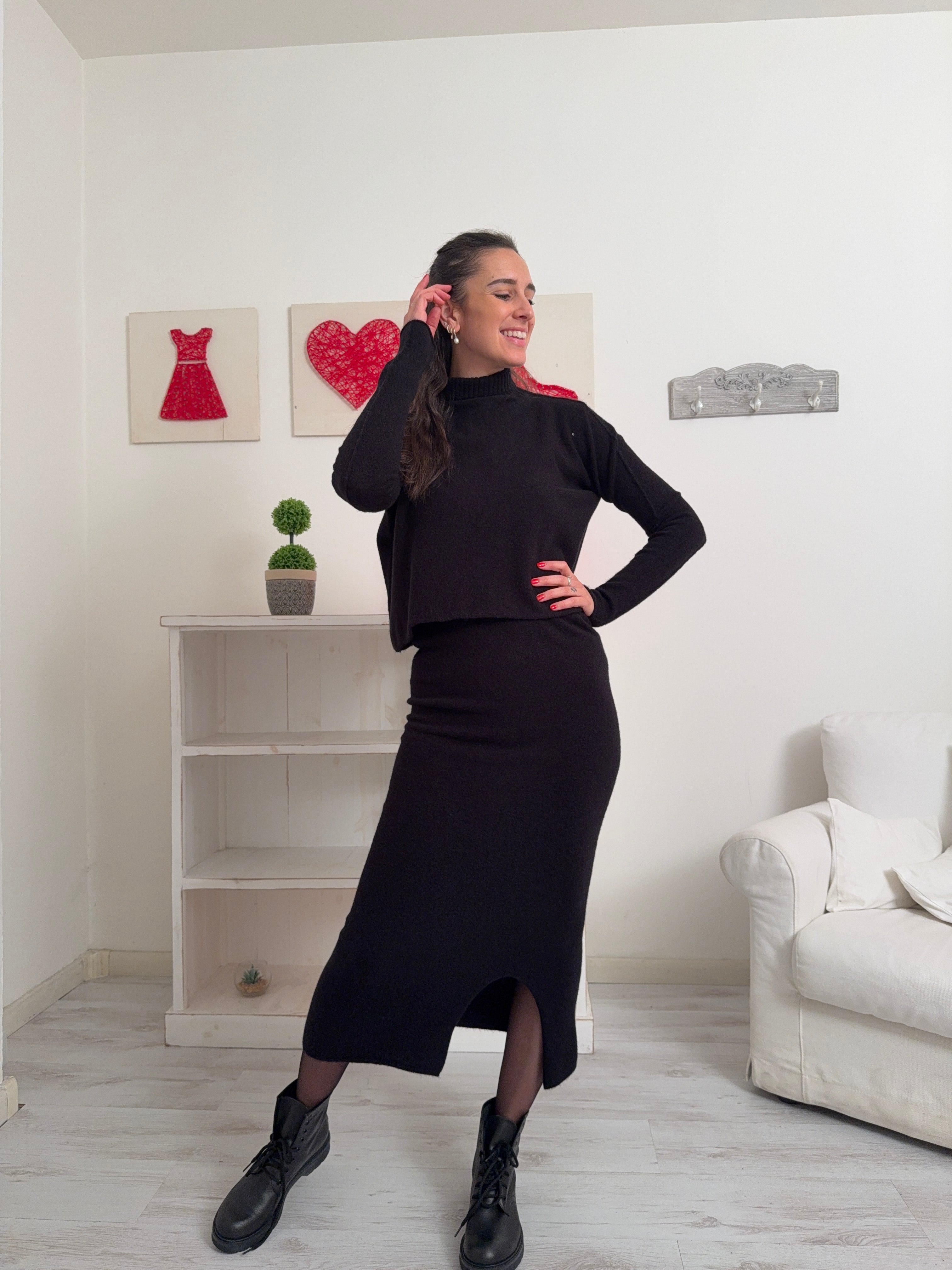 Descrizione: Completo in maglia composto da maglioncino leggermente crop a maniche lunghe e collo alto, e gonna lunga con elastico in vita e spacchetto su un fianco.