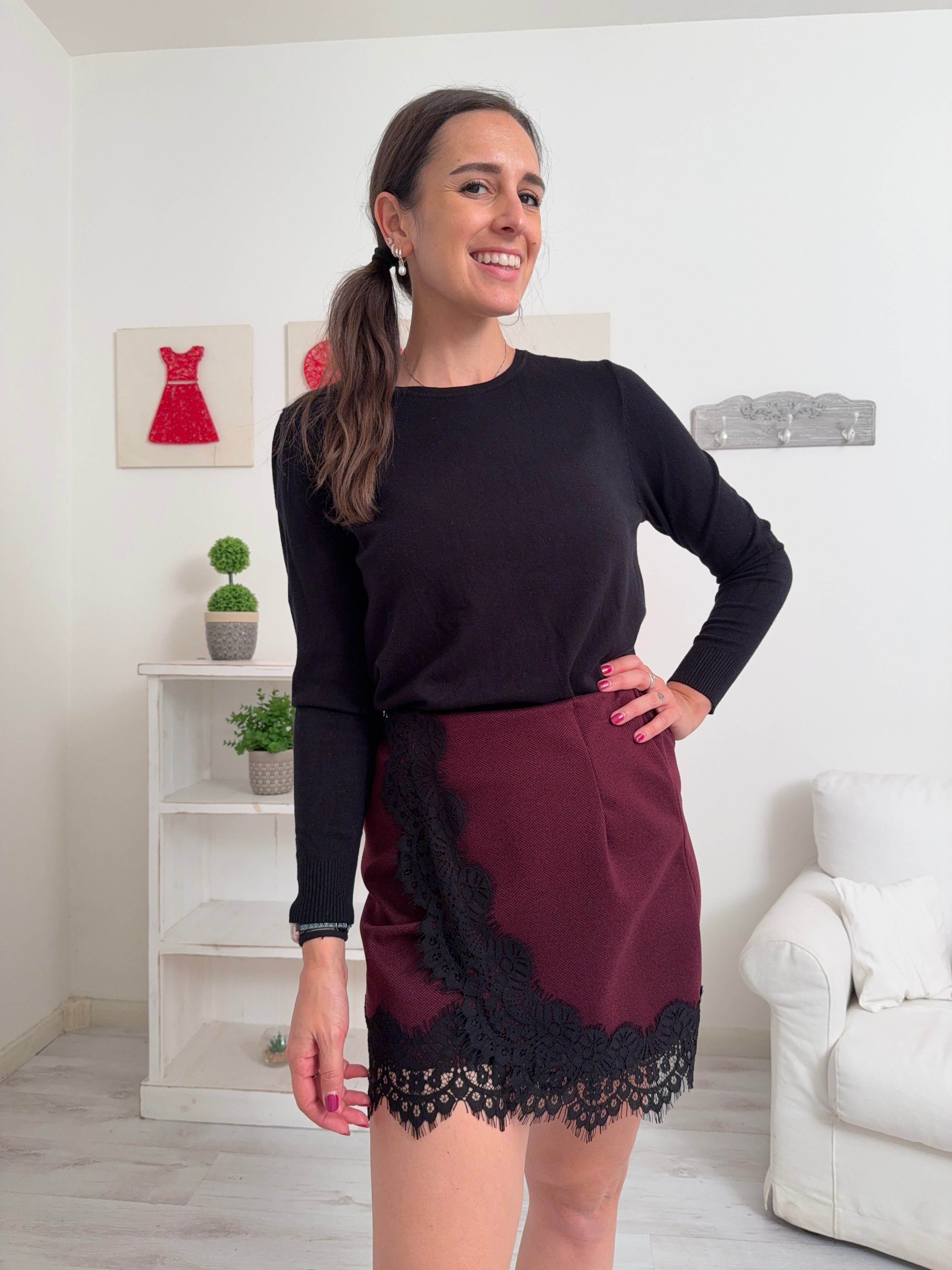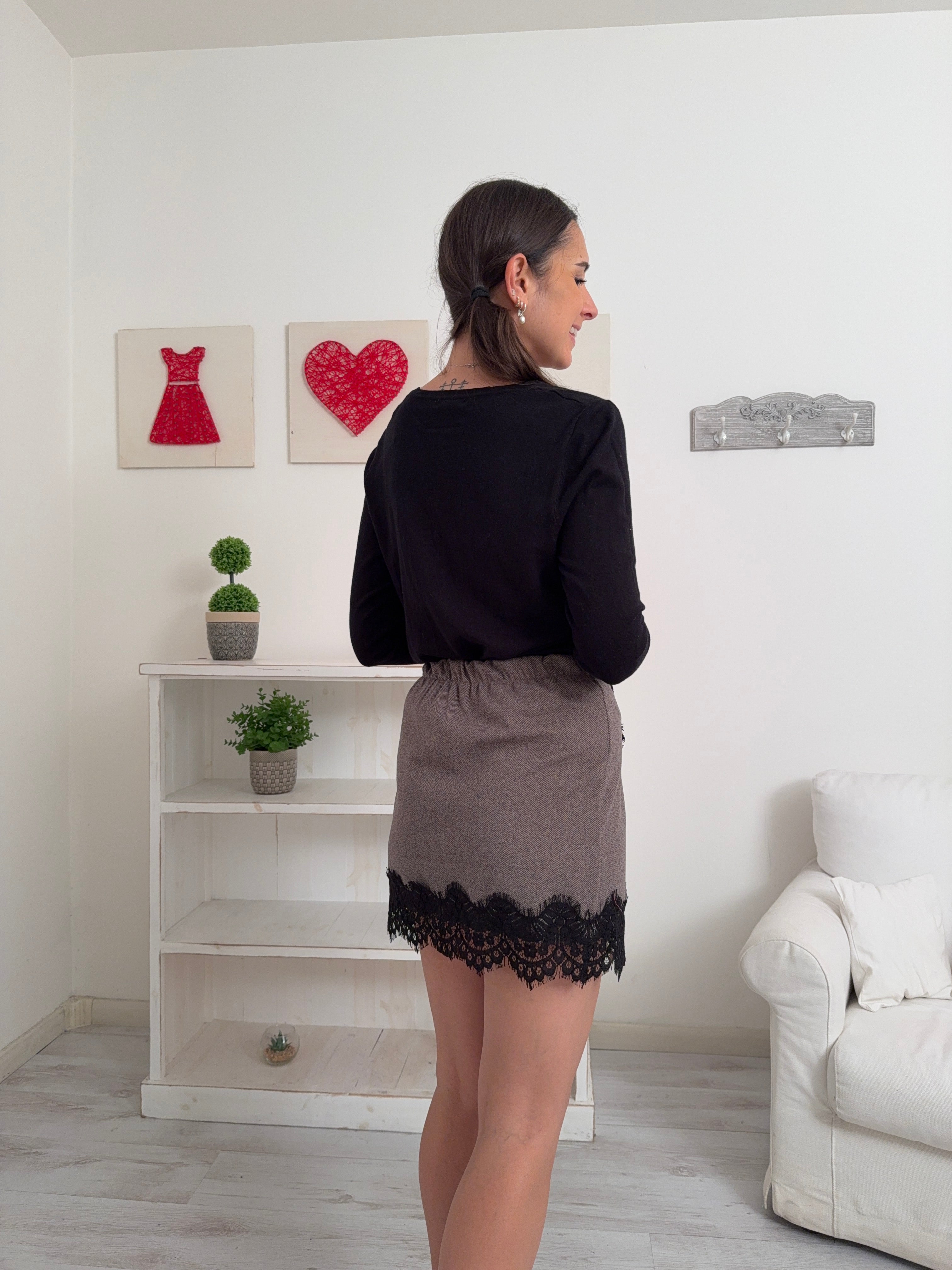 Descrizione: Gonna corta effetto portafoglio con pizzo ed elastico in vita.