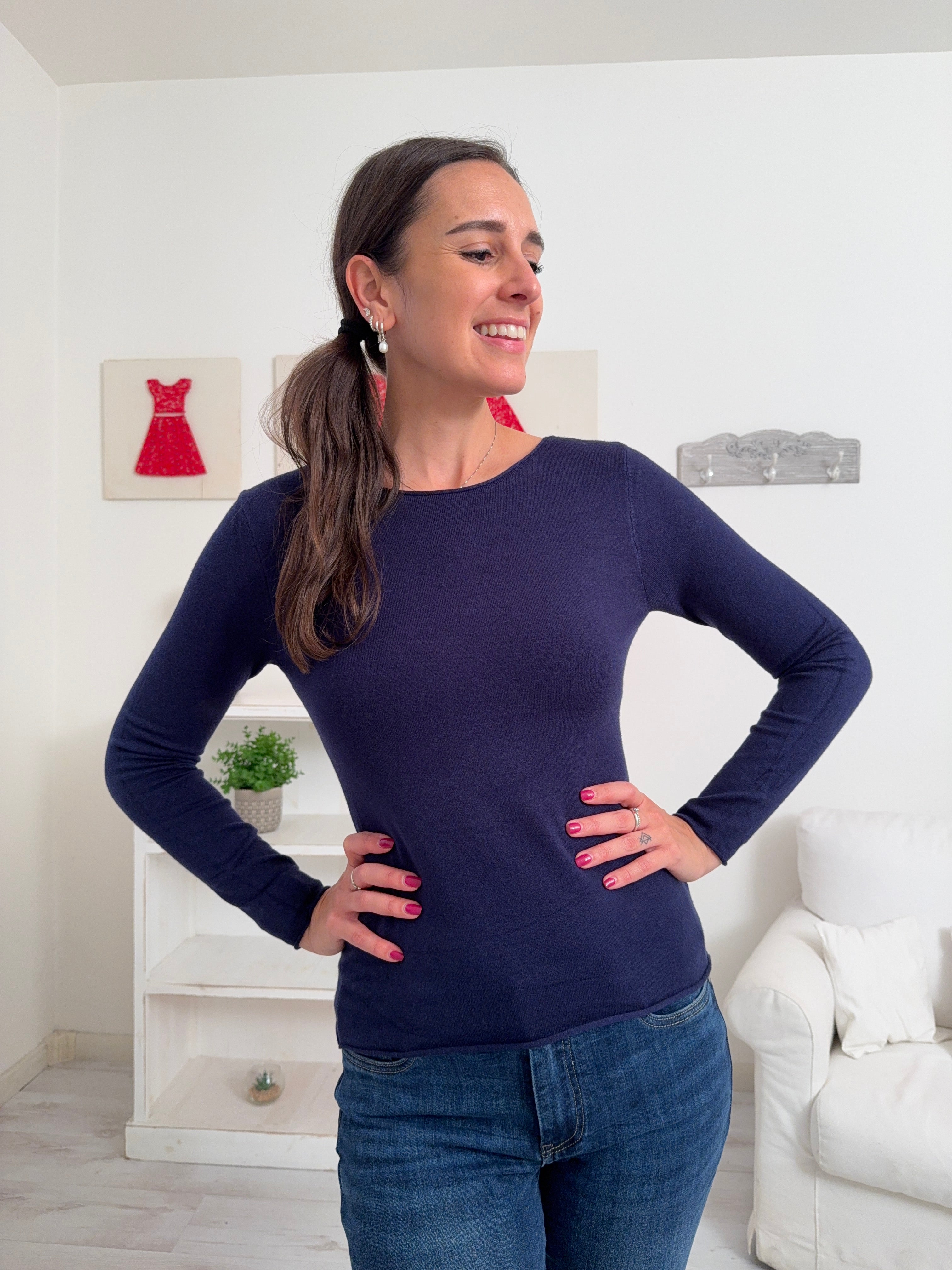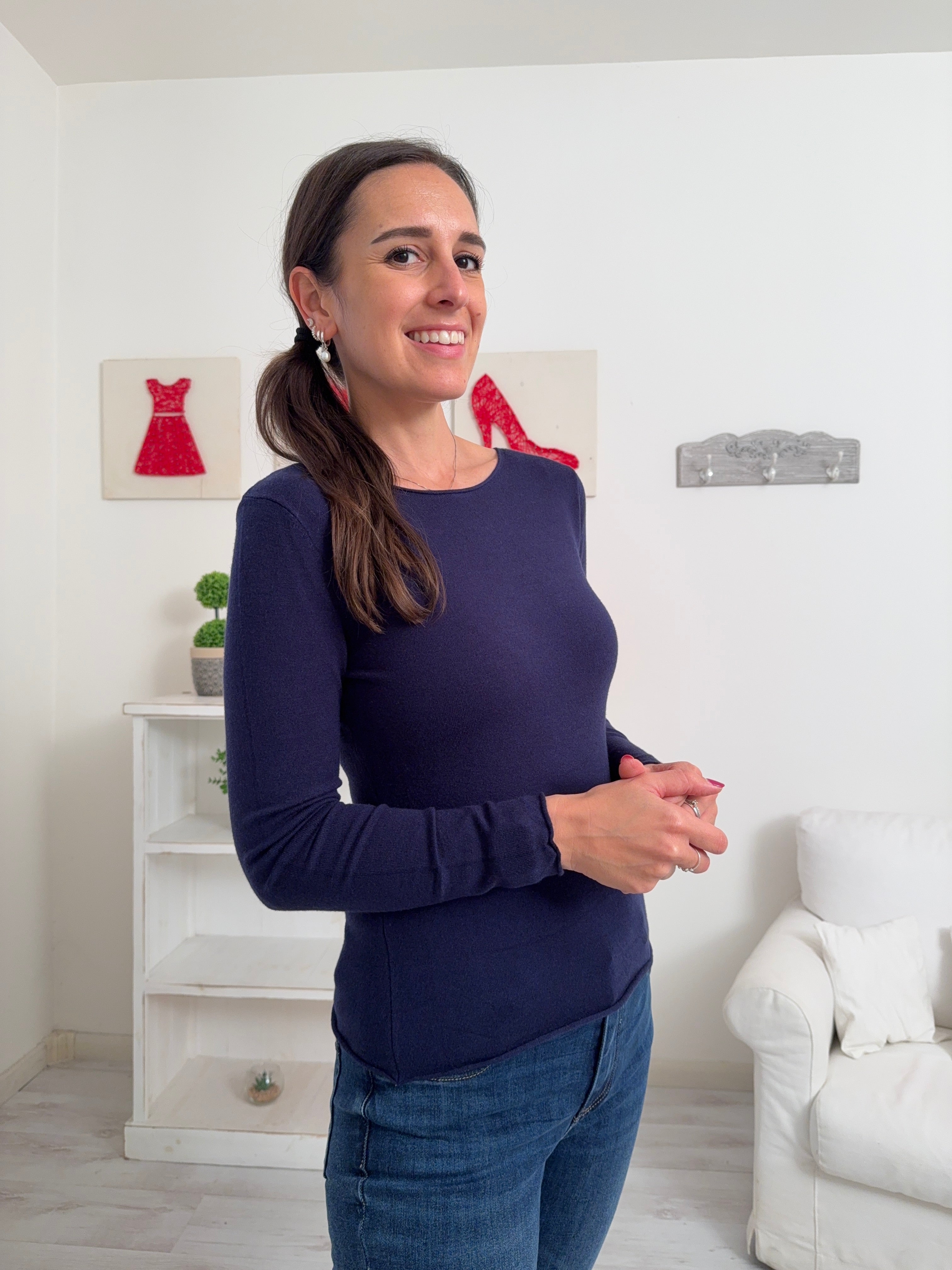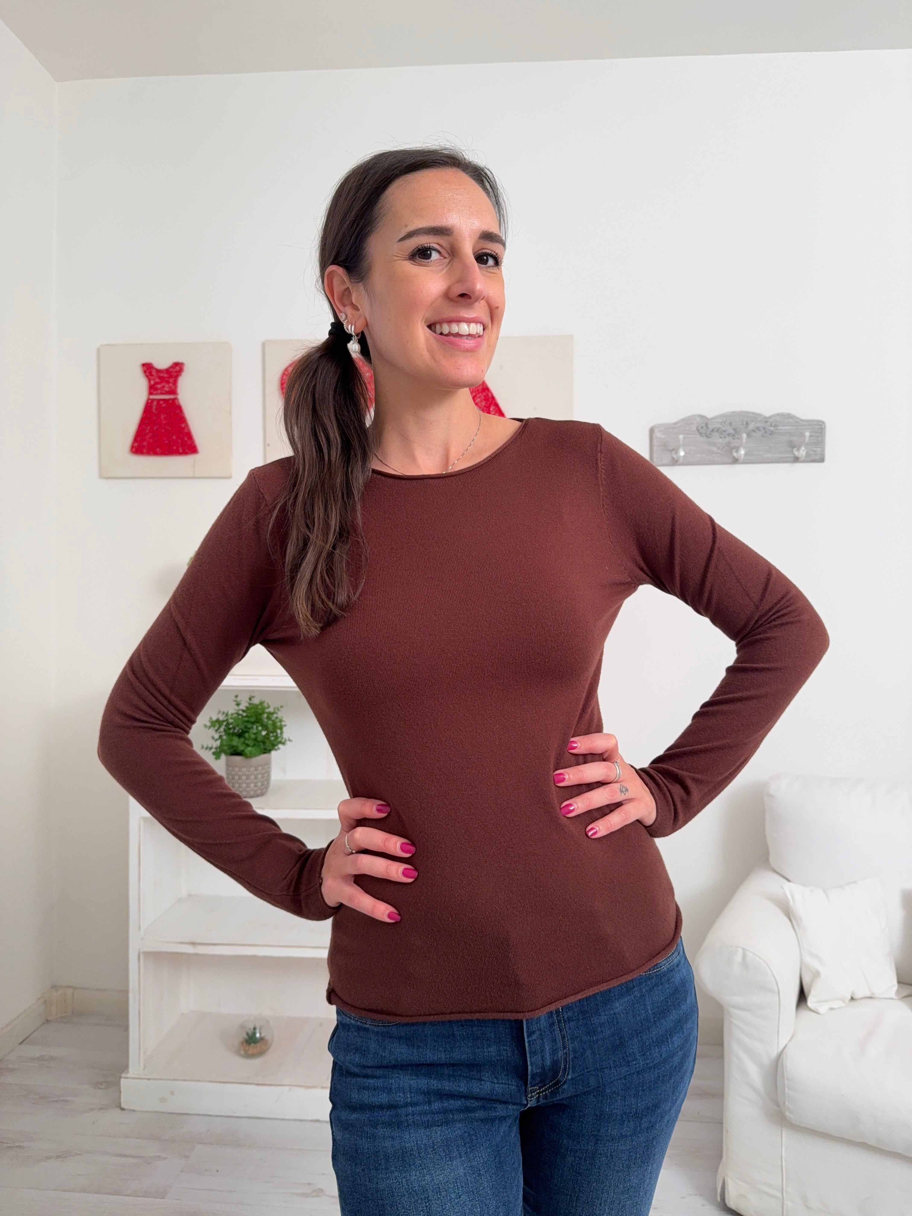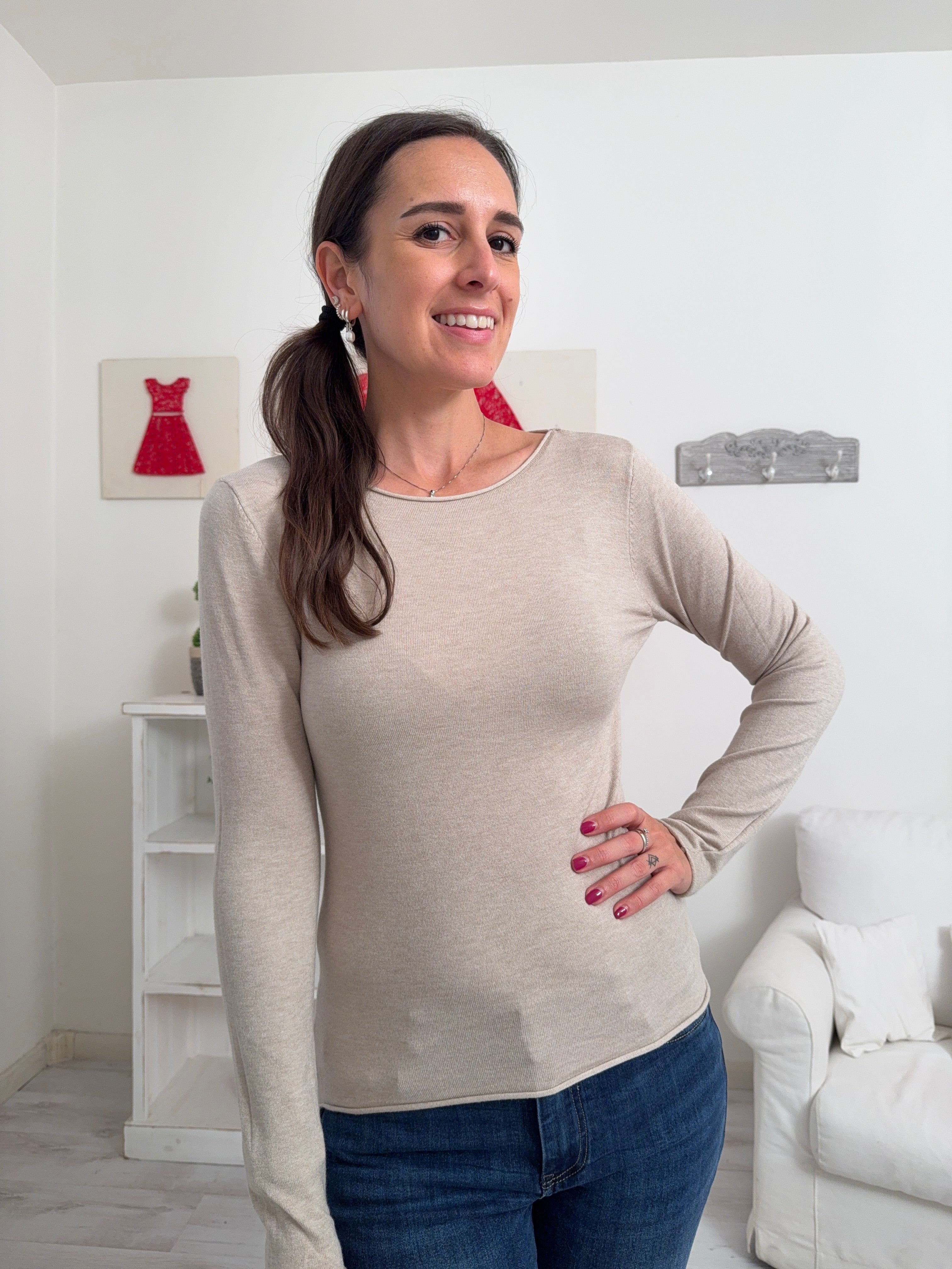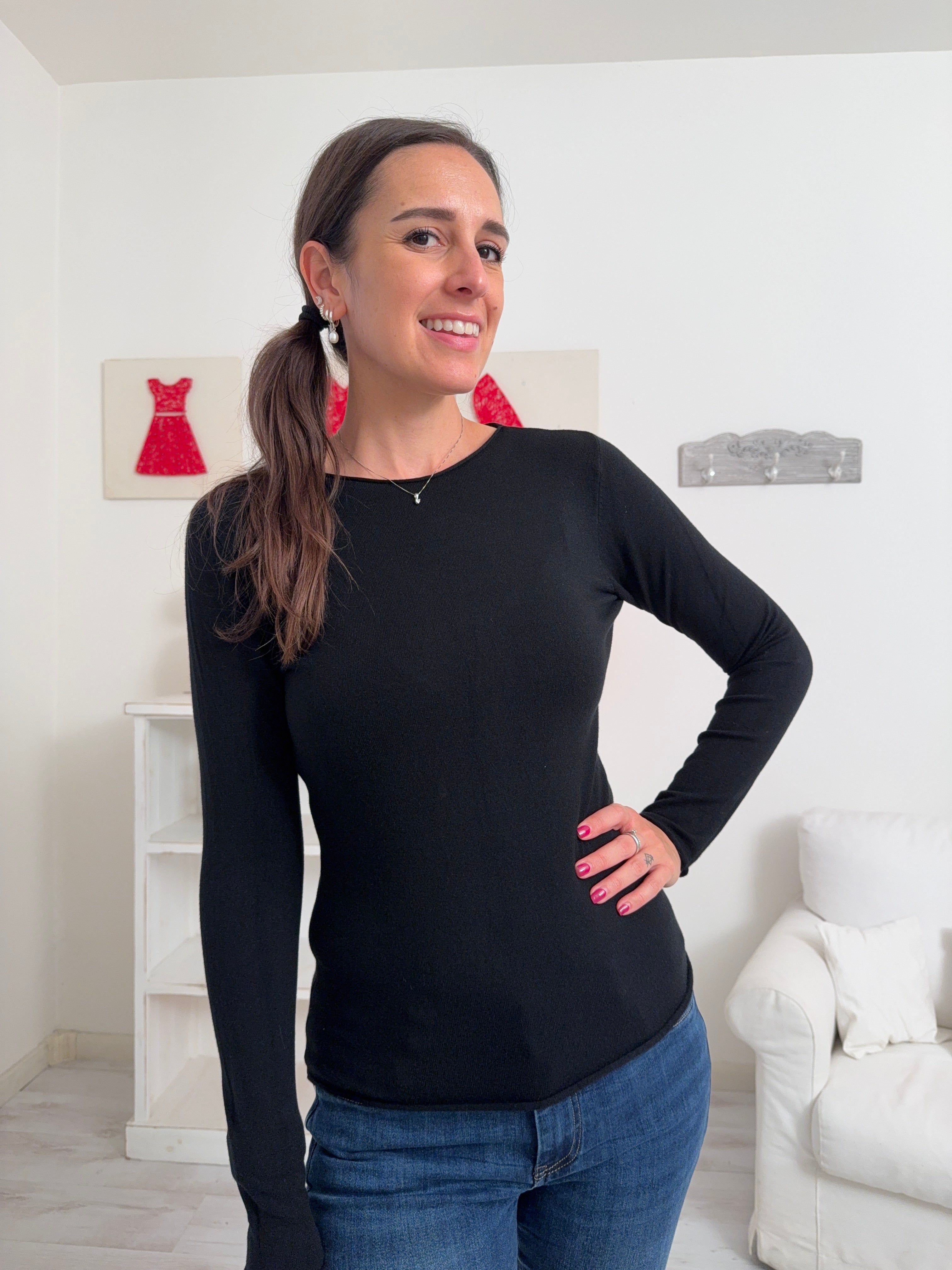 Descrizione: Maglioncino leggero con maniche lunghe e collo tondo a taglio vivo.