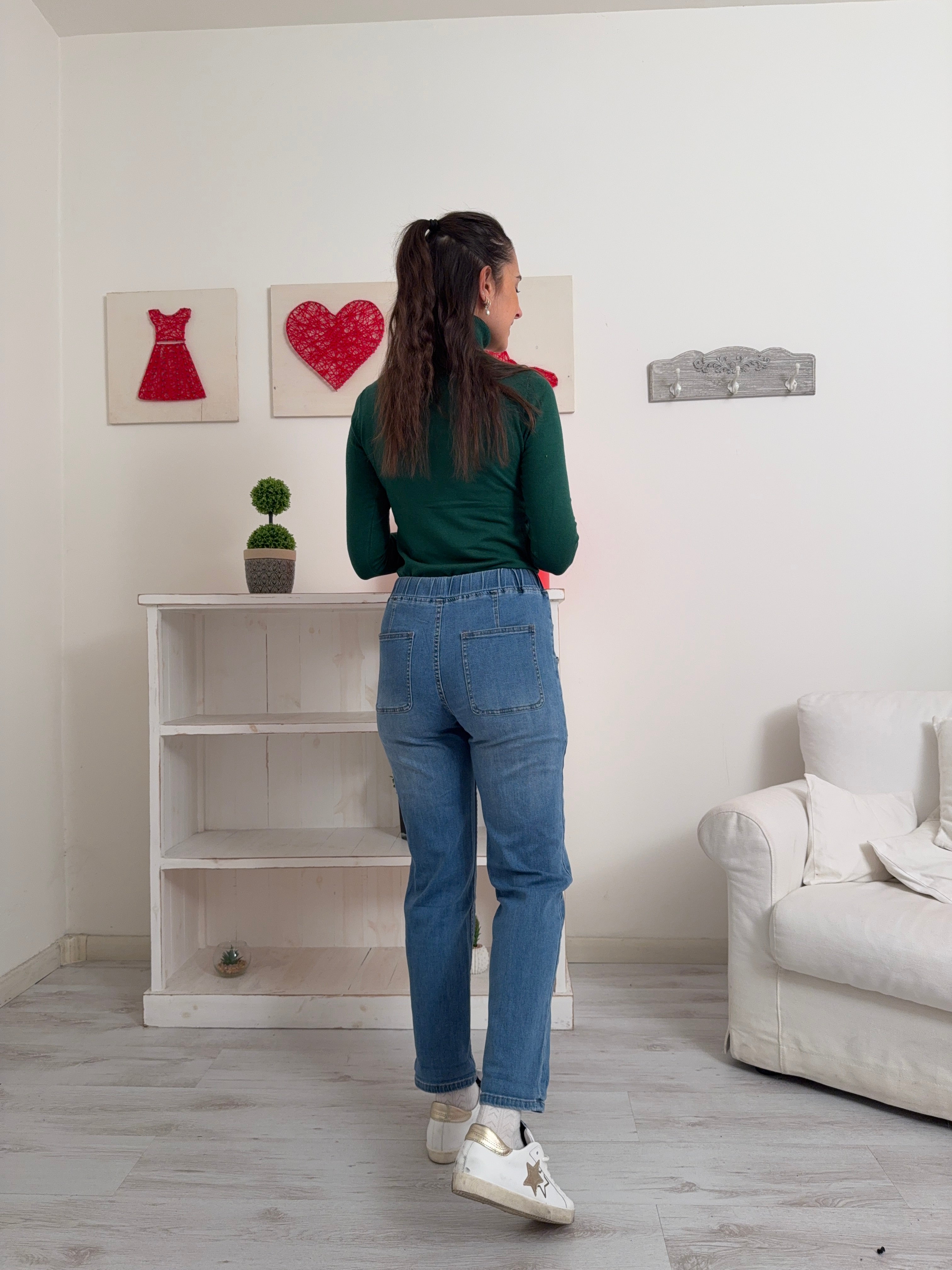 Descrizione: Jeans elasticizzato con elastico e coulisse in vita. Due tasche doppie davanti e due dietro.
