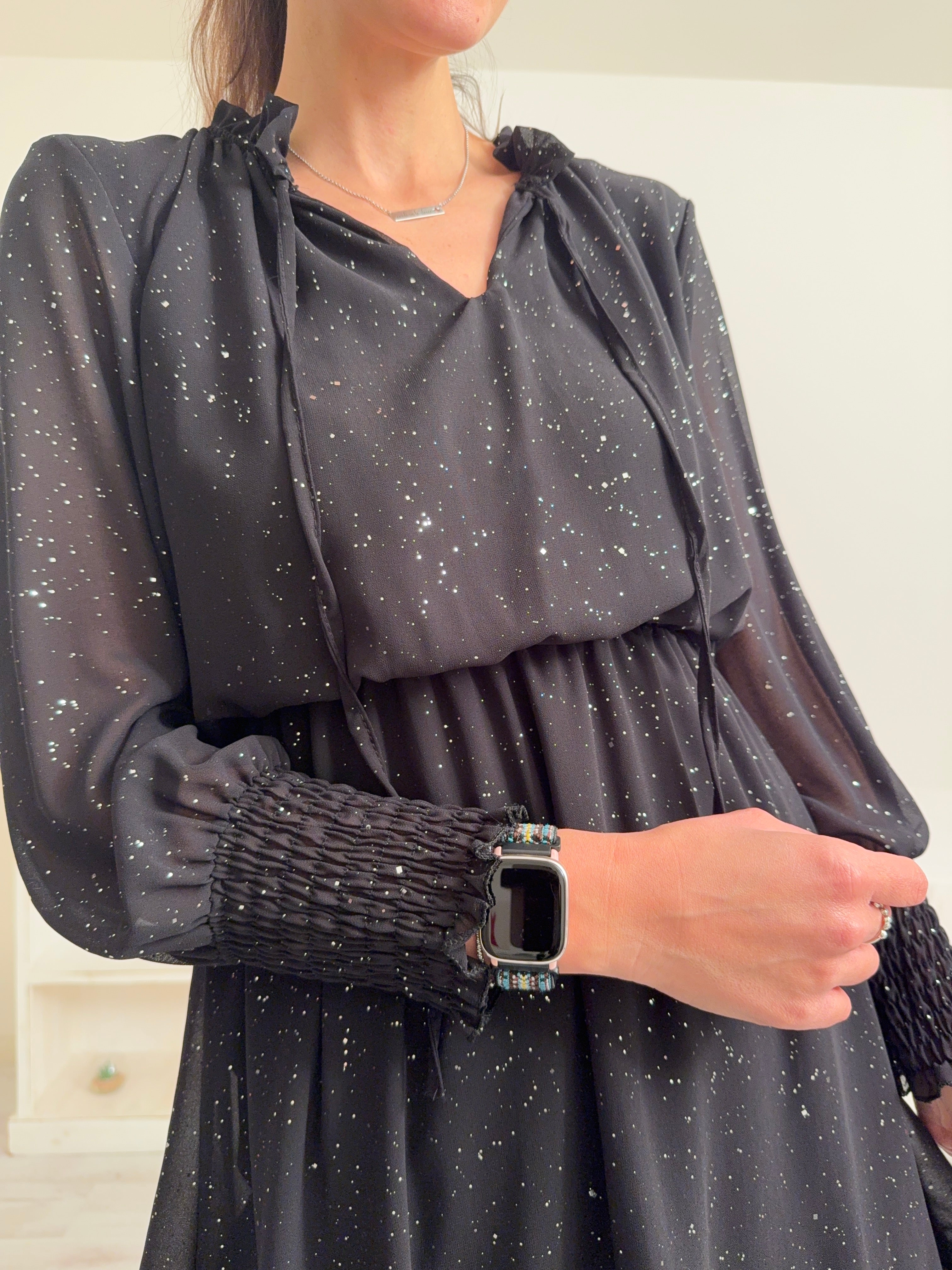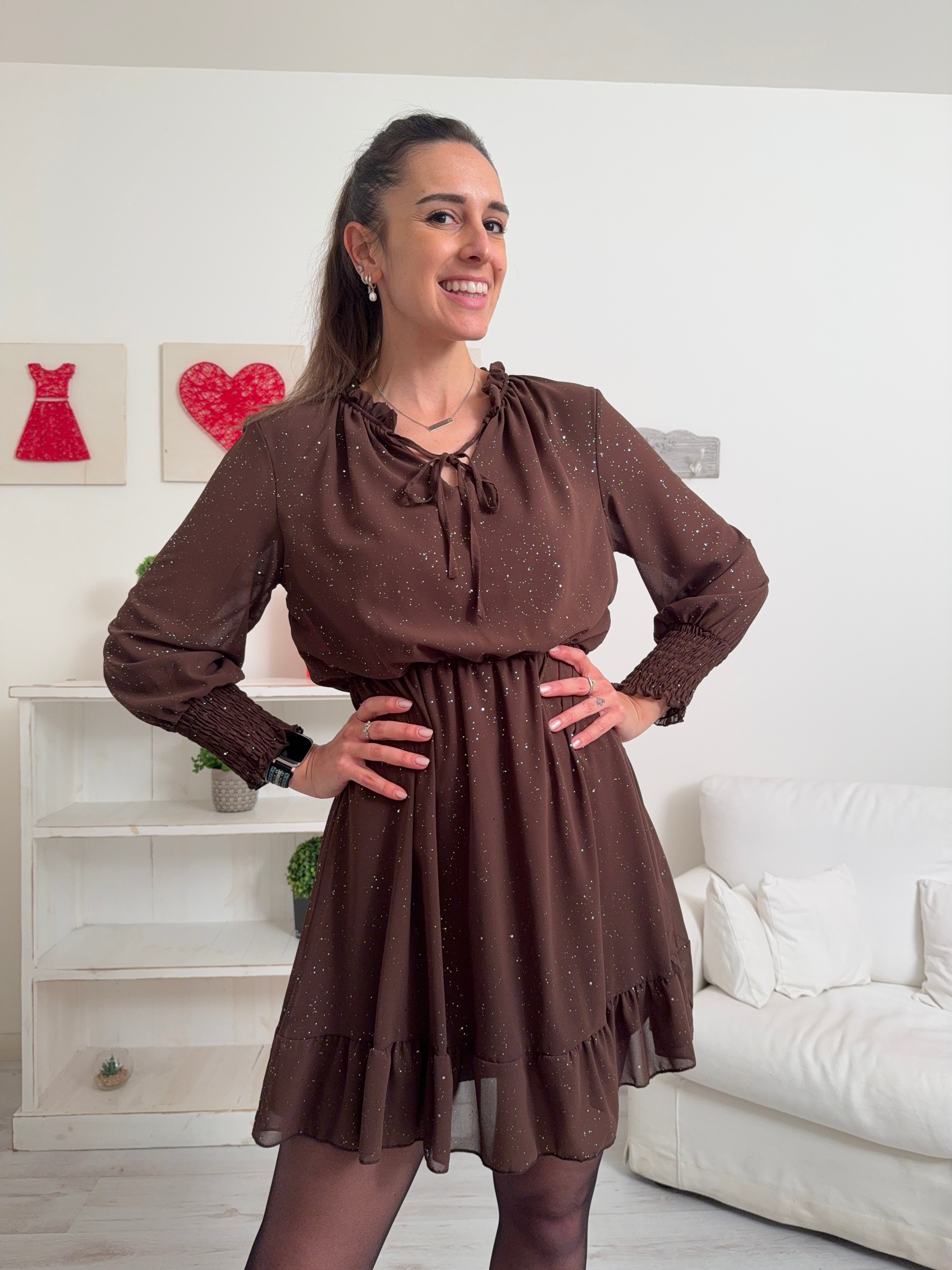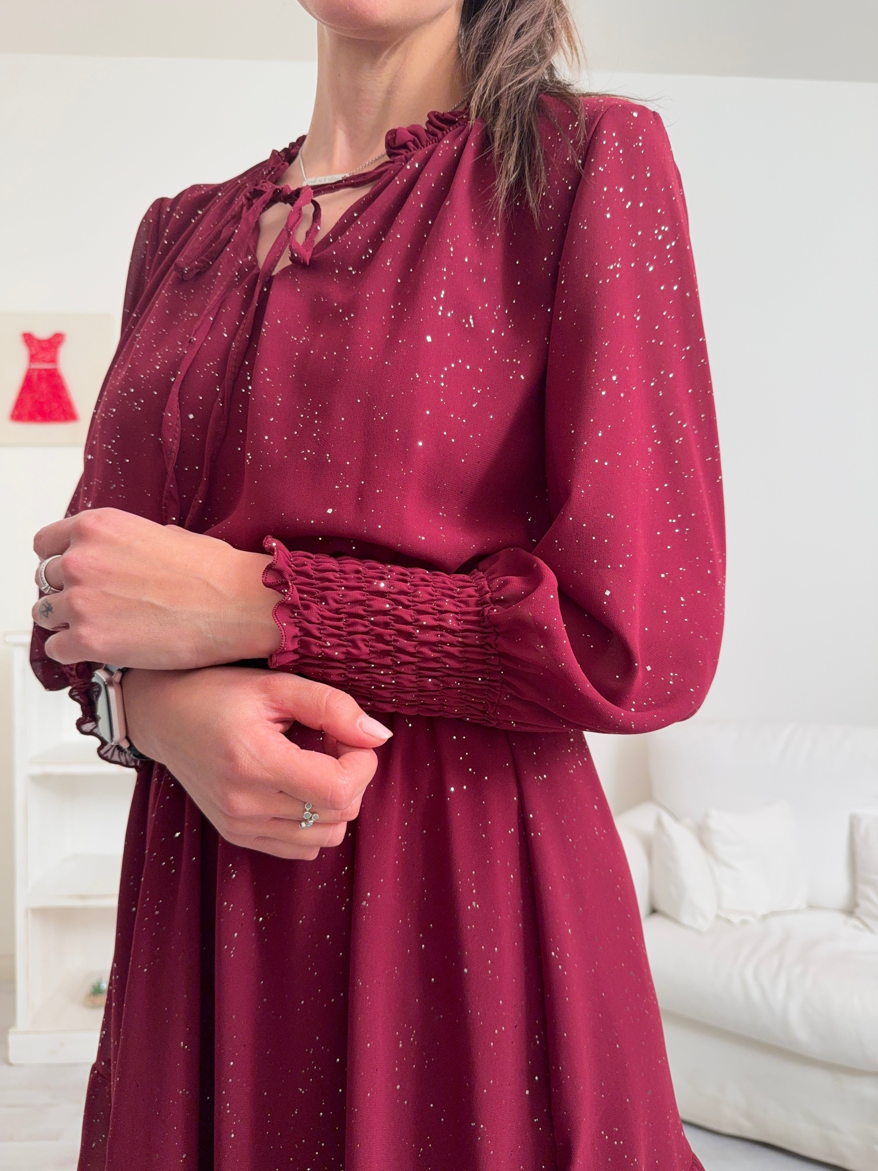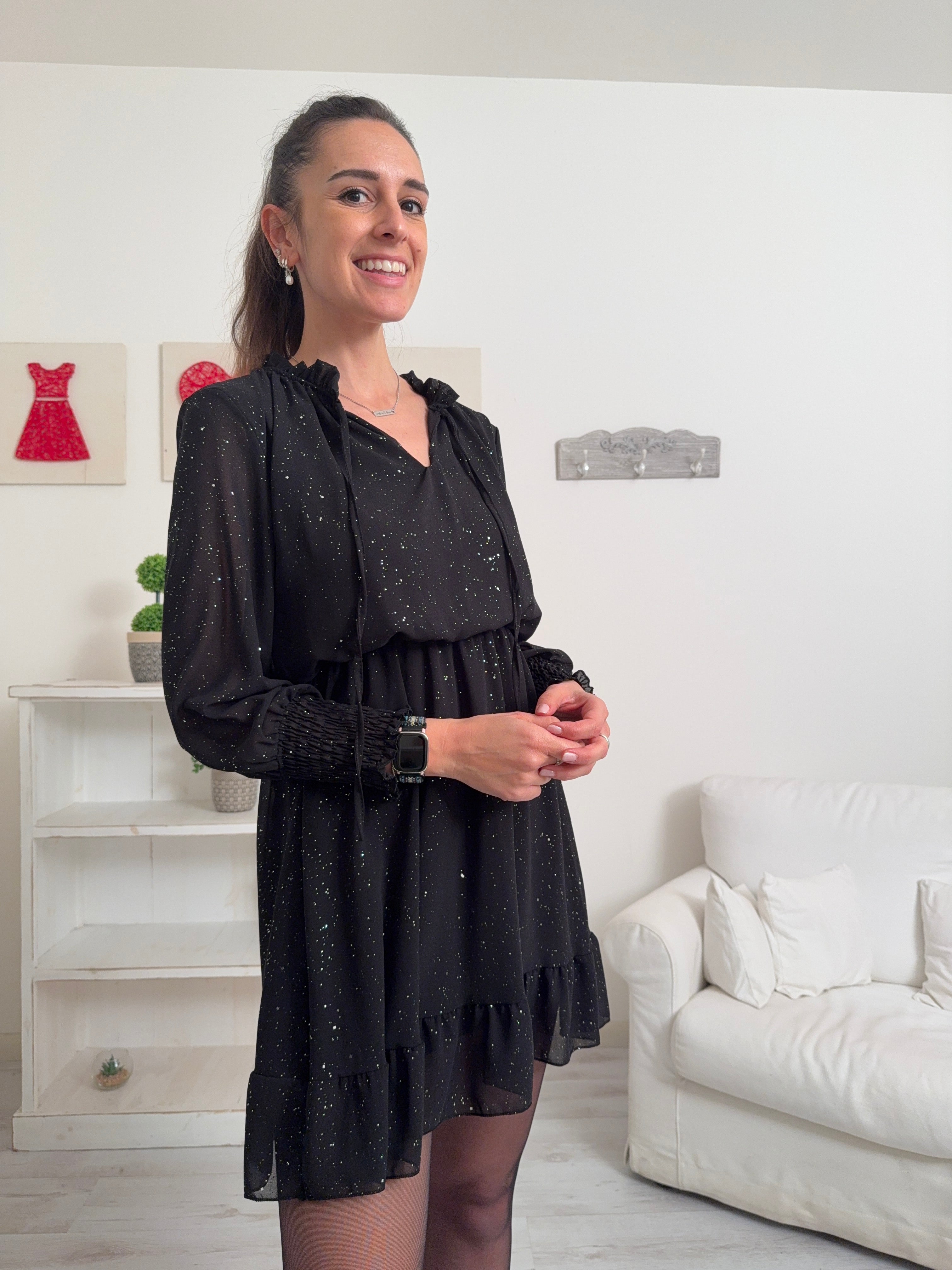 Descrizione: Abitino con strass, fodera interna e collo tondo con elastico, laccetto ,spacchetto e frappette. Maniche lunghe con elastico nei polsini, elastico anche in vita e balza nella gonna.