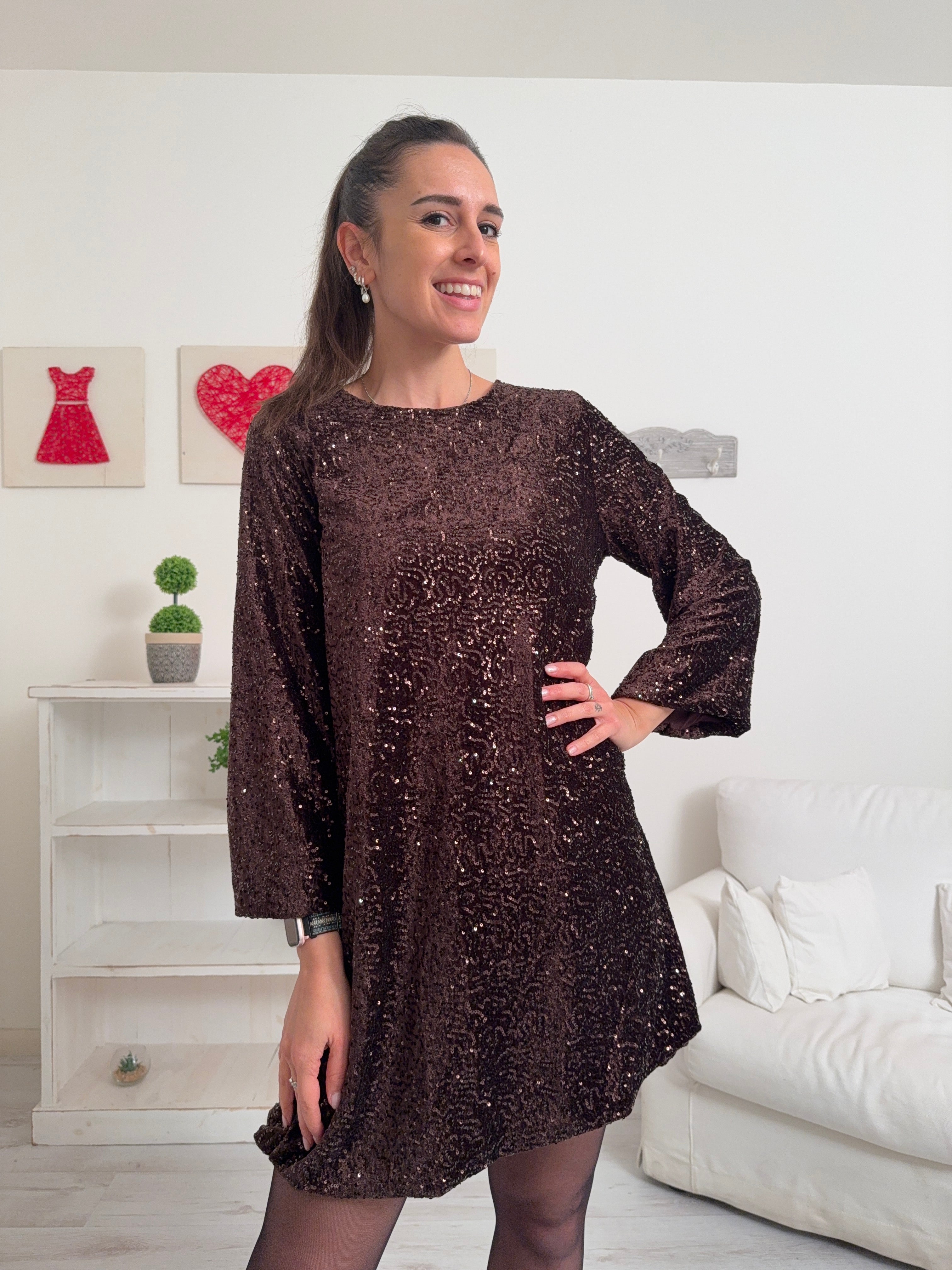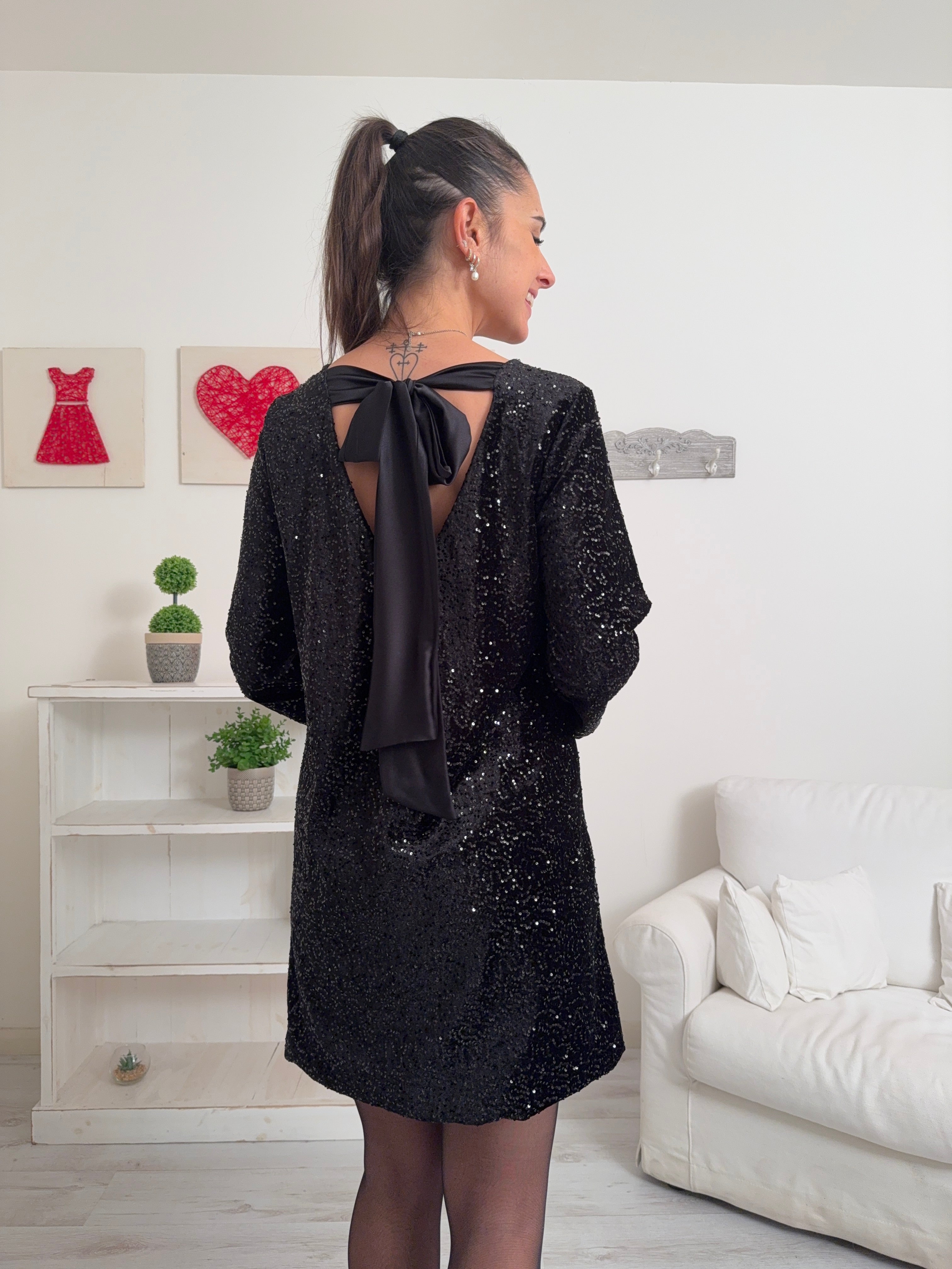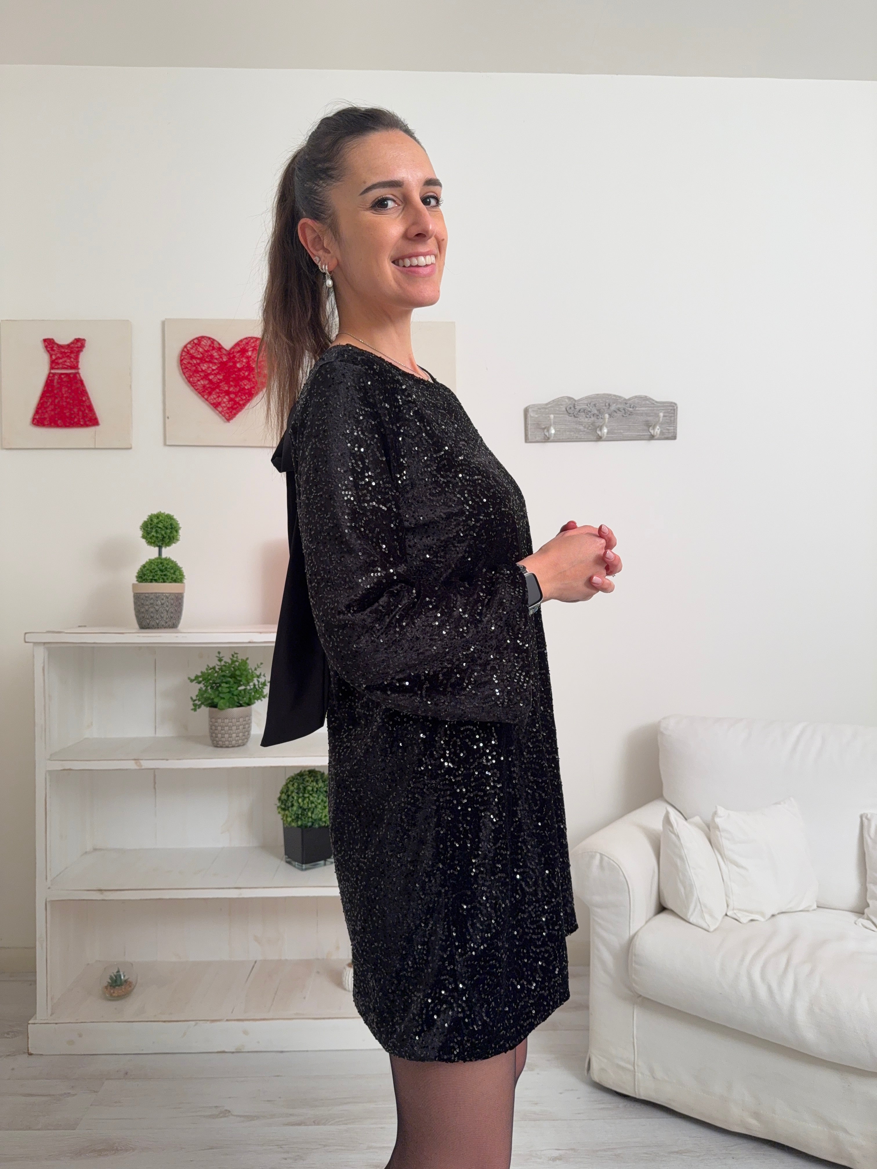 Descrizione: Abitino di paillettes con sottoveste, collo tondo, manica lunga e spacco con fiocco nella schiena.