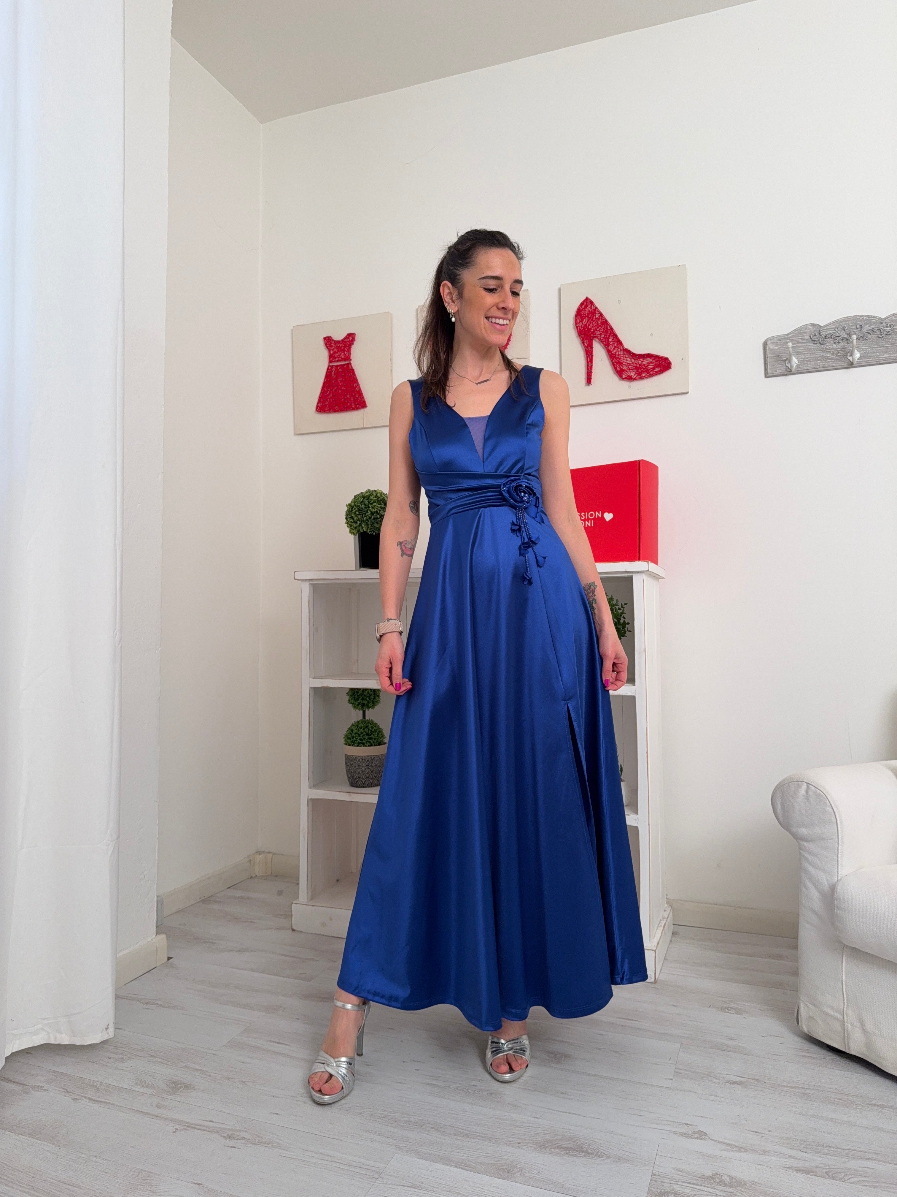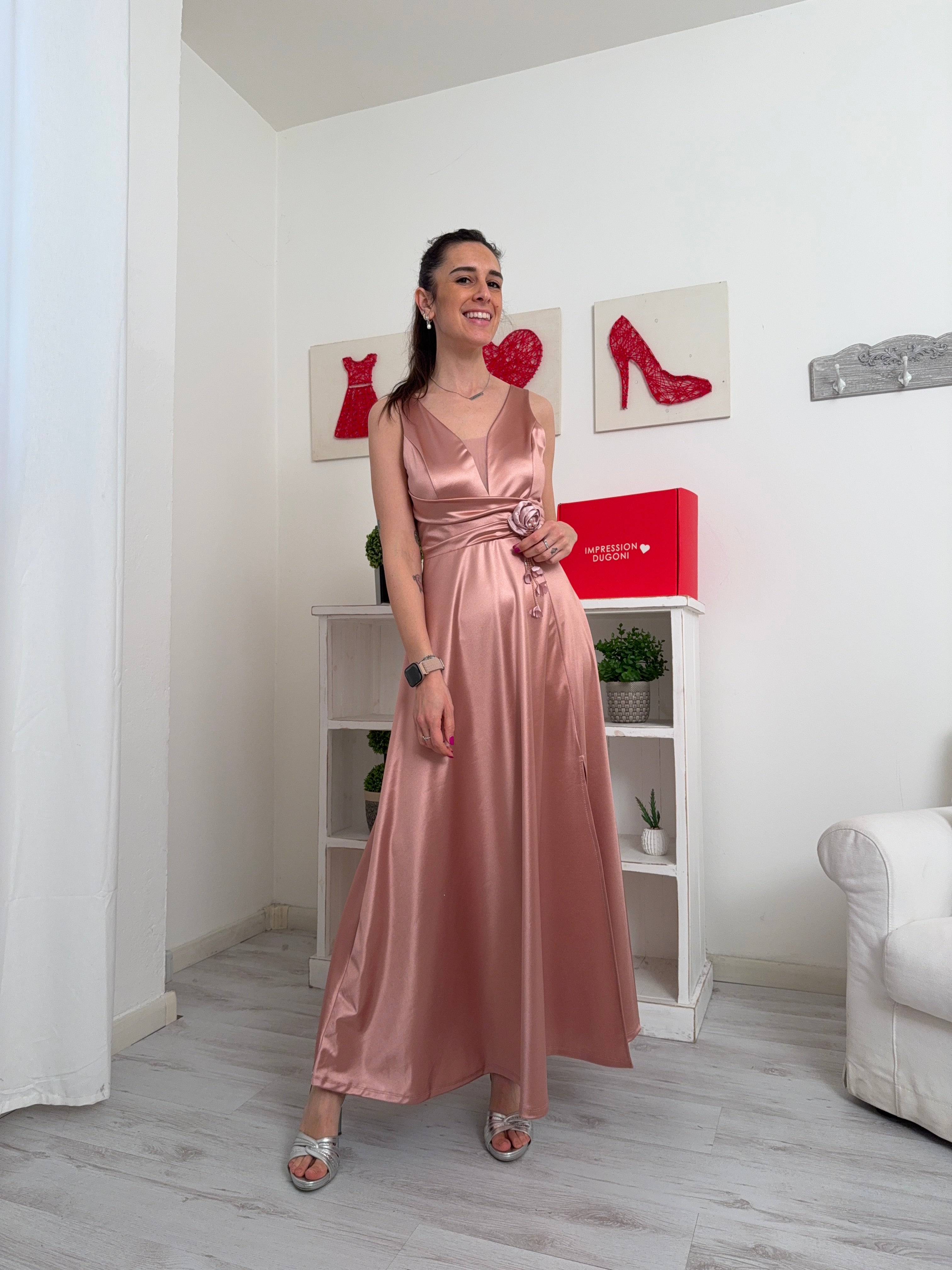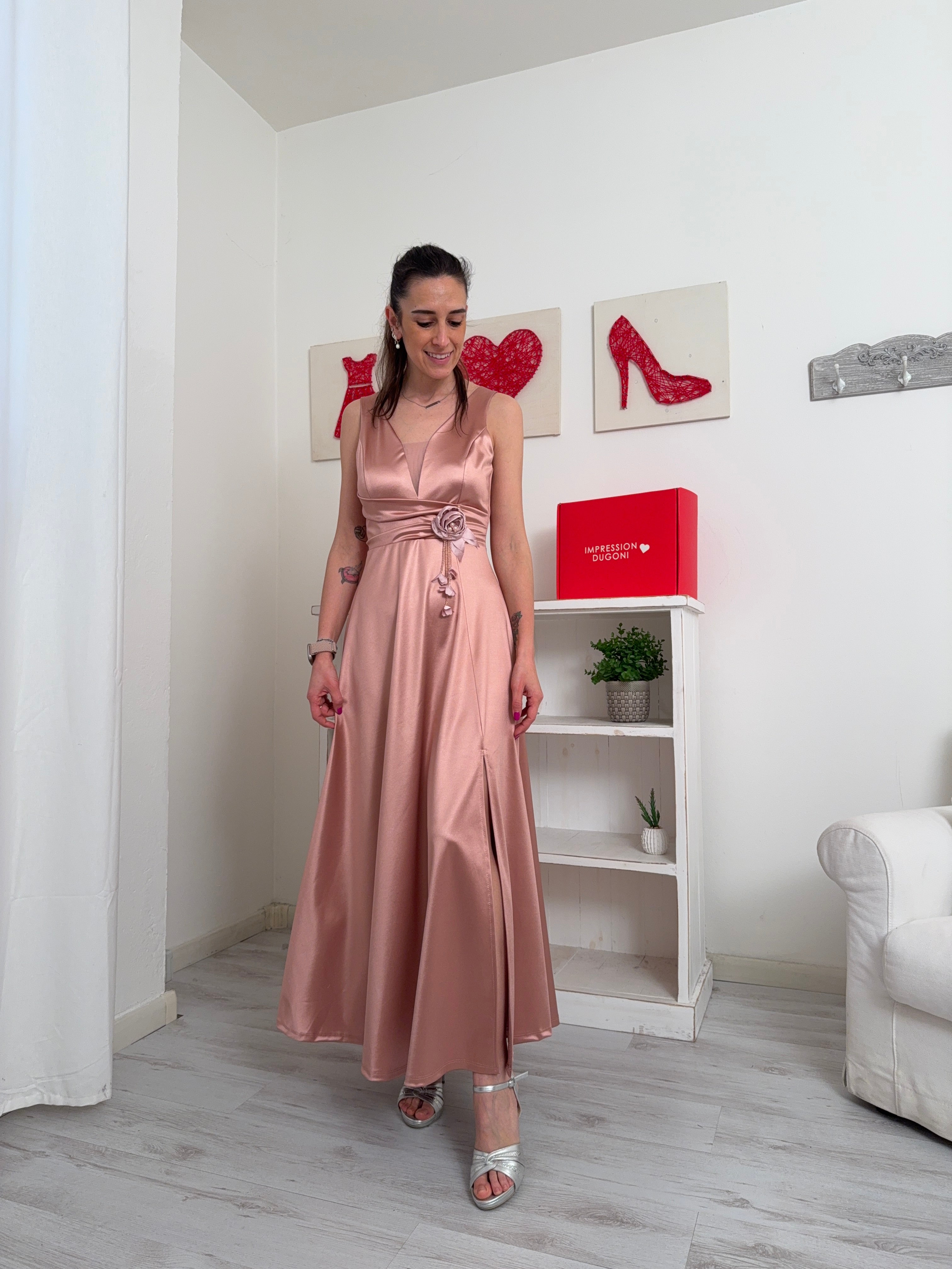 Descrizione: Abito tipo raso senza maniche con scollo a V, seno imbottito ed arriccio sotto il seno. Piccolo spacco nella gonna davanti, cerniera a scomparsa nella schiena e applicazione di fiorellino davanti.