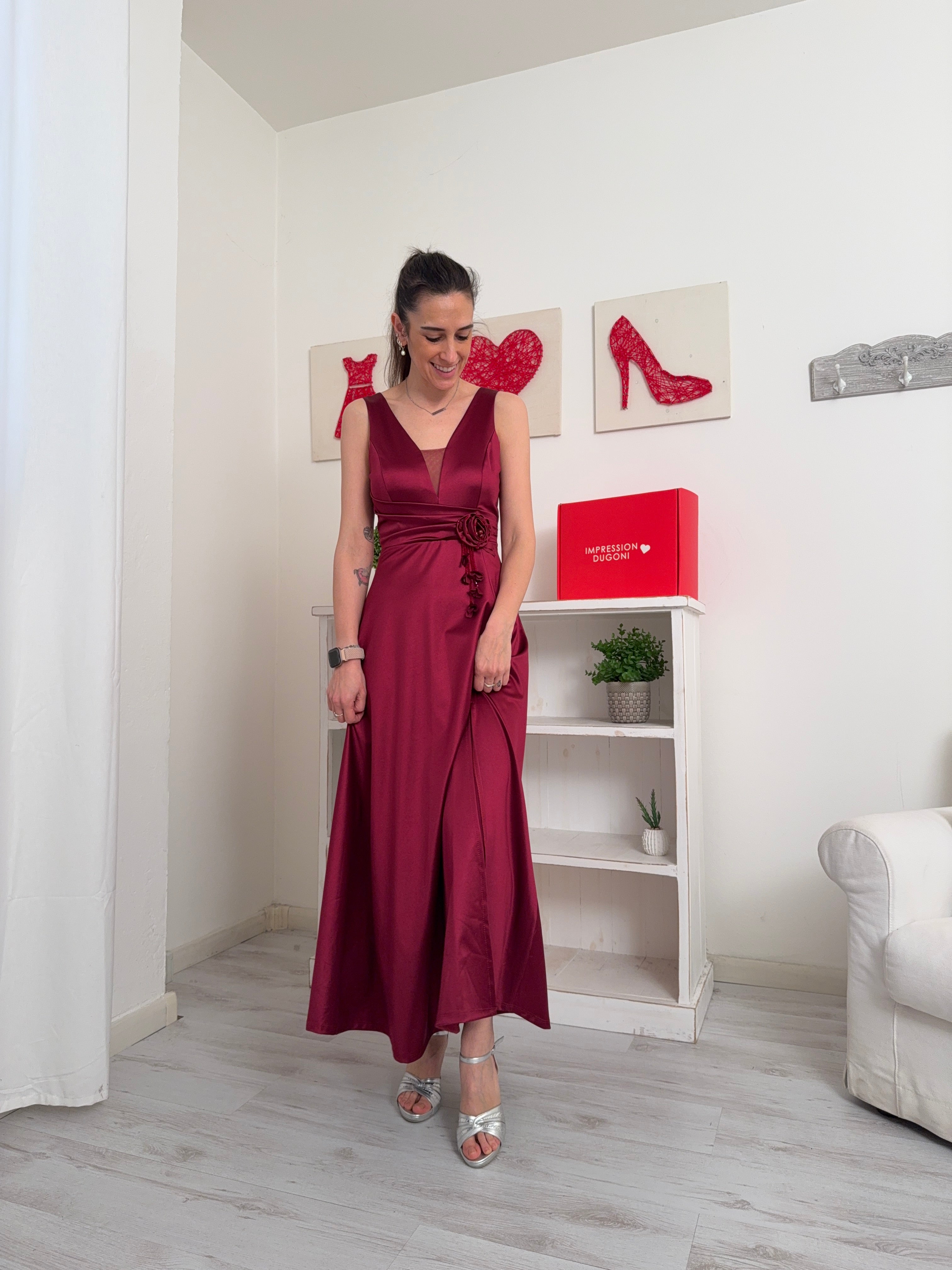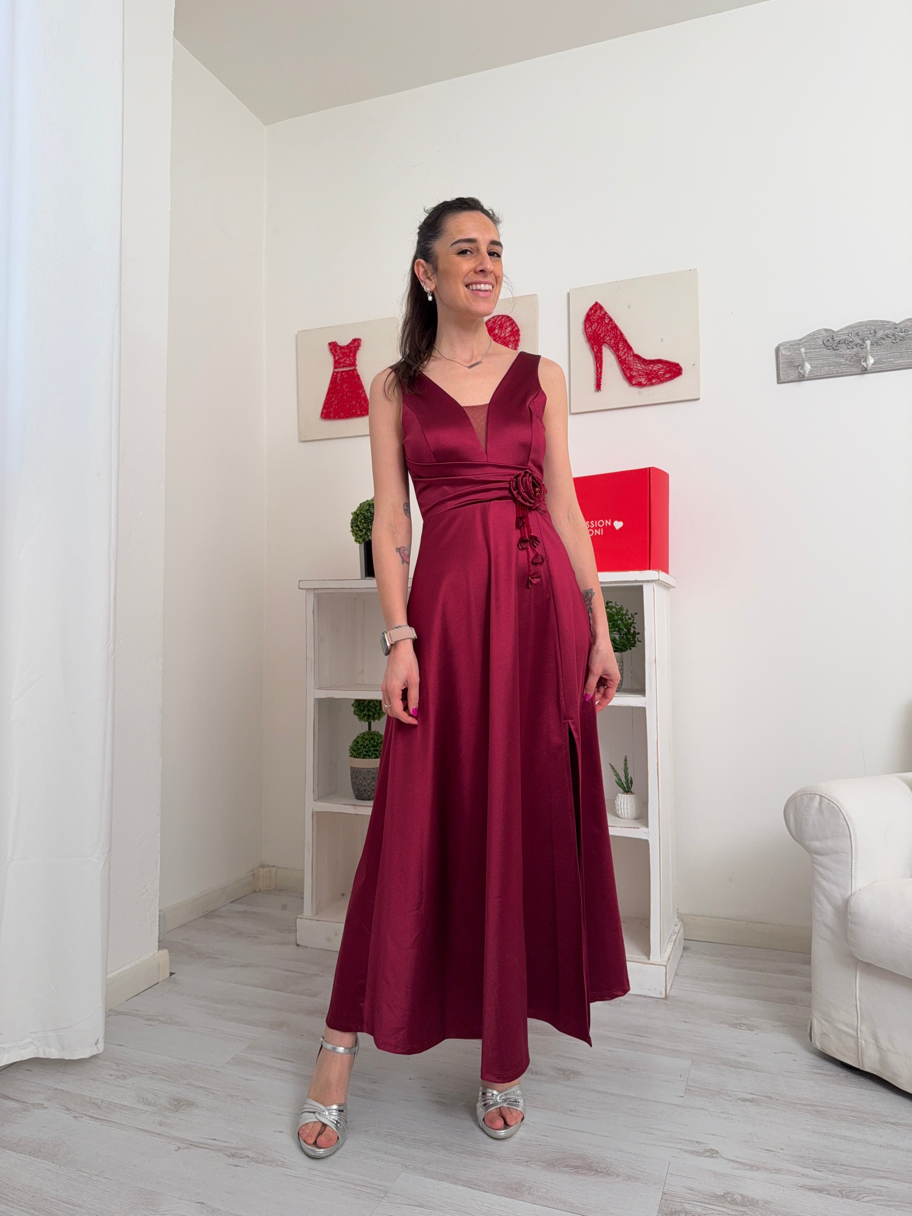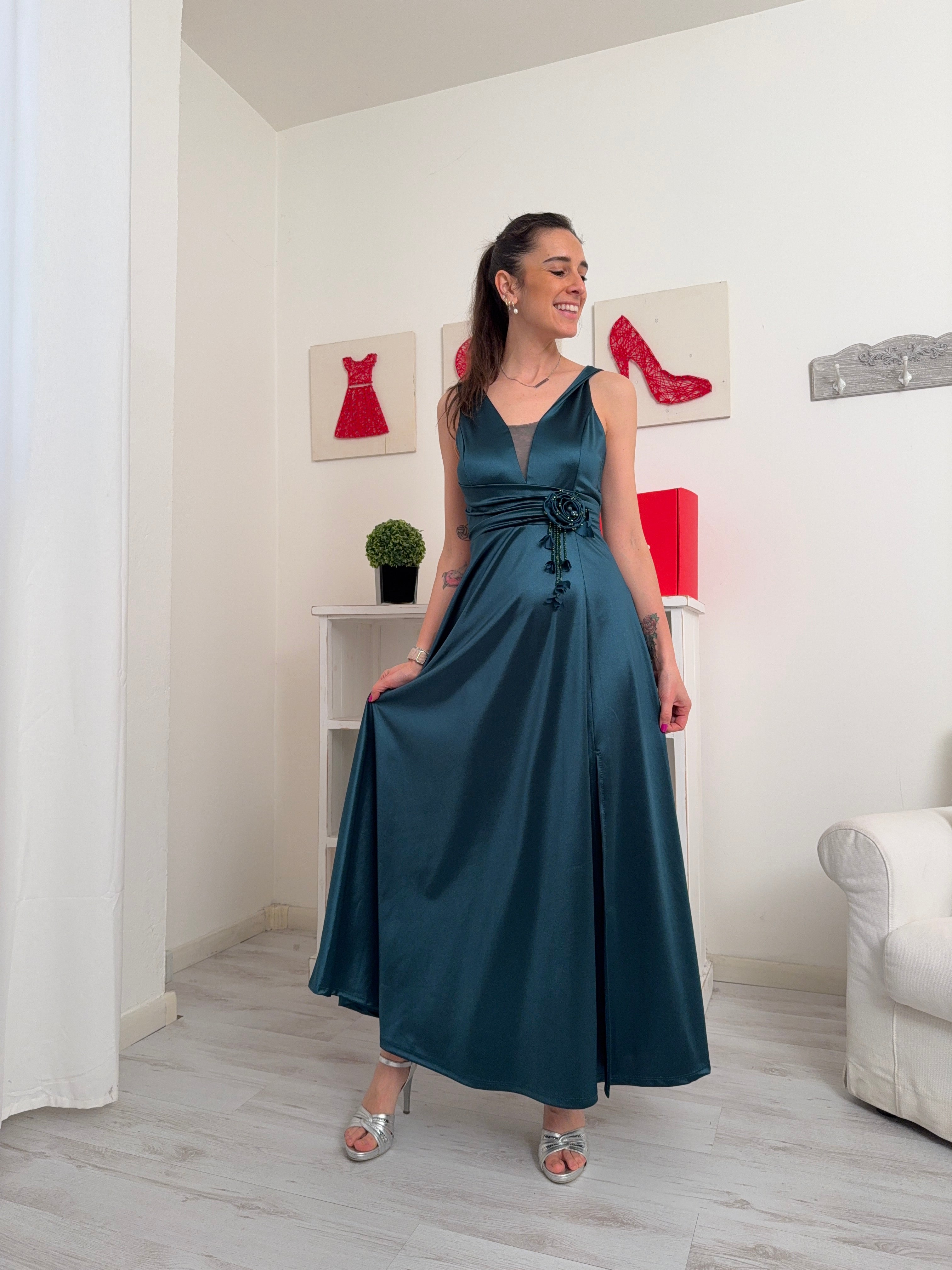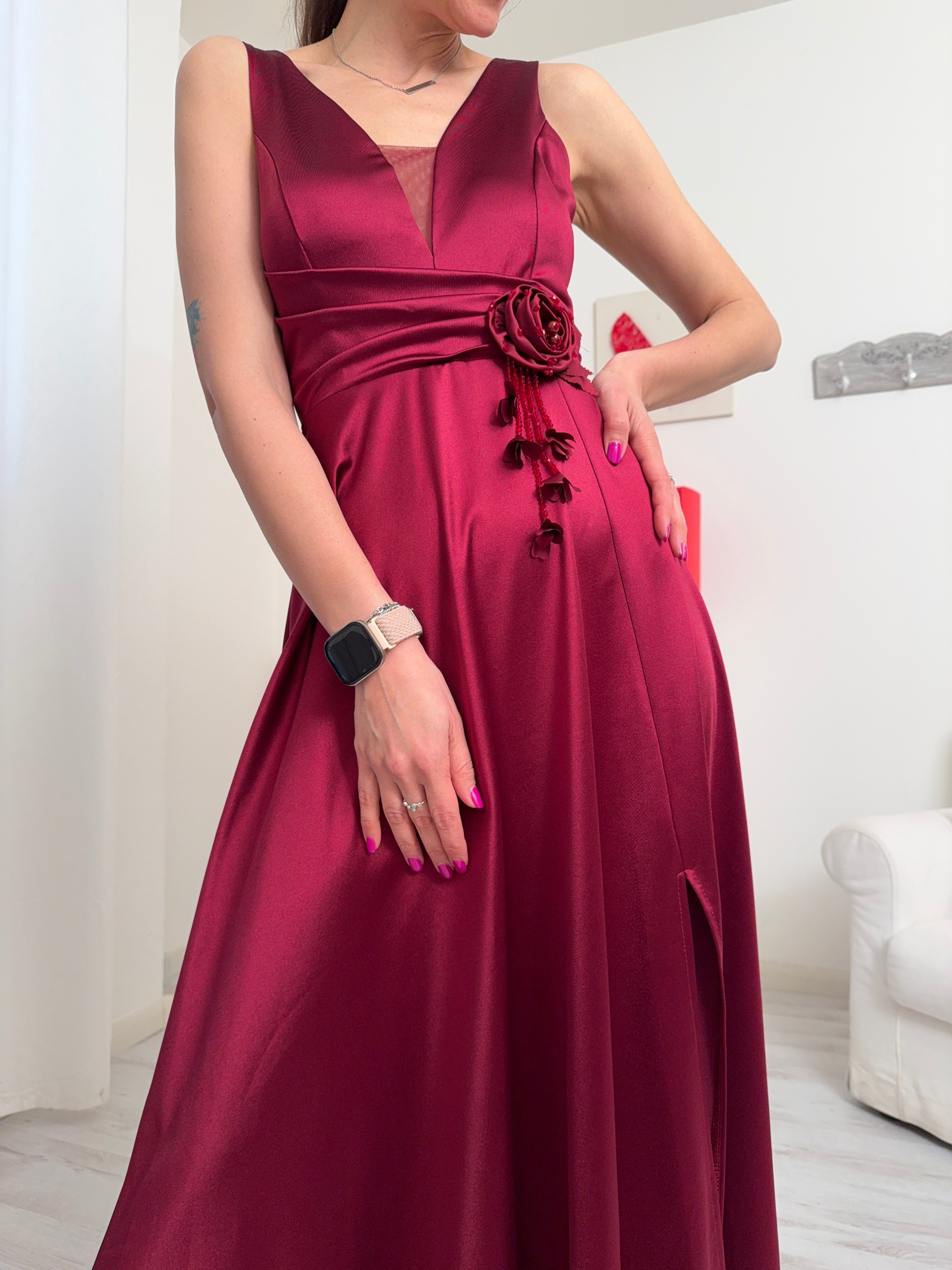 Descrizione: Abito tipo raso senza maniche con scollo a V, seno imbottito ed arriccio sotto il seno. Piccolo spacco nella gonna davanti, cerniera a scomparsa nella schiena e applicazione di fiorellino davanti.