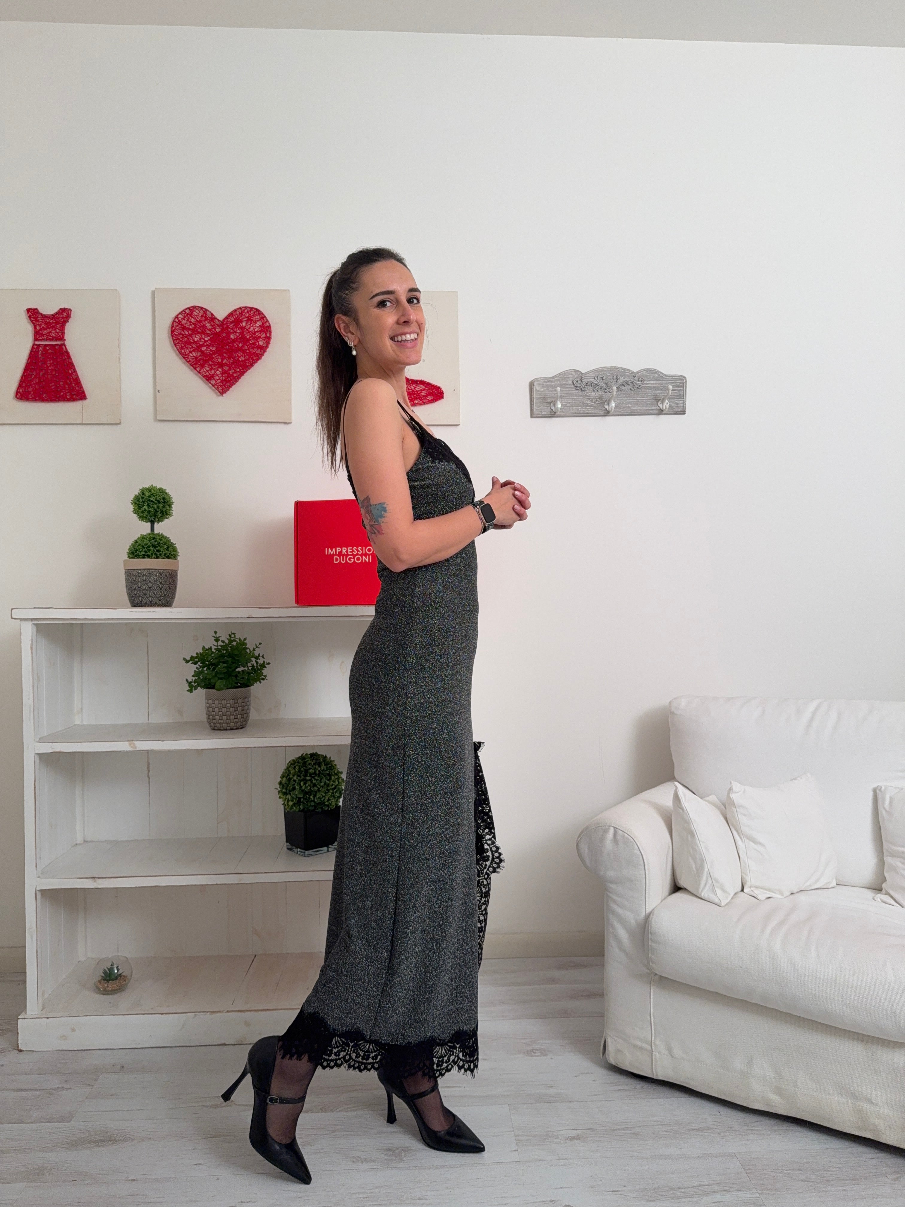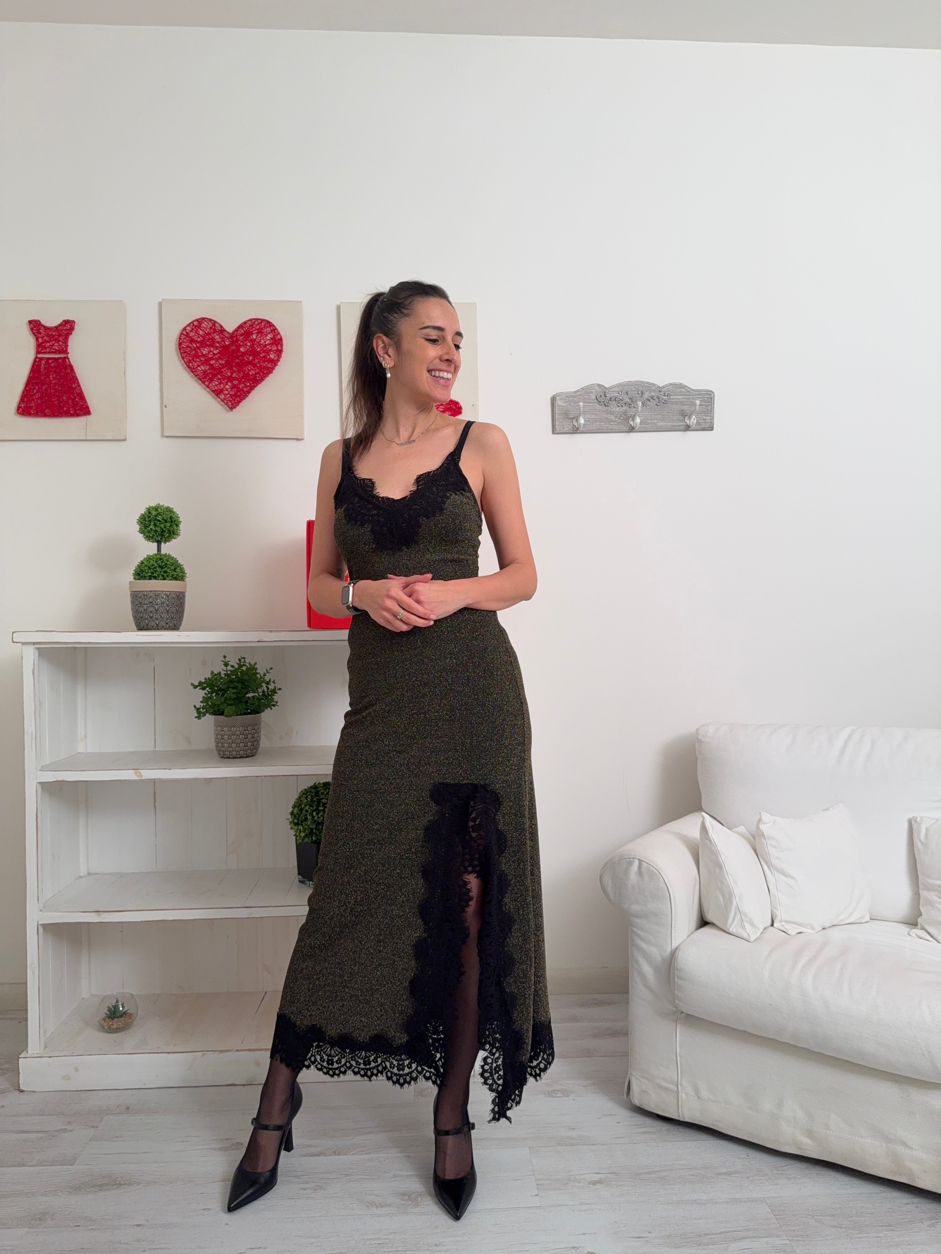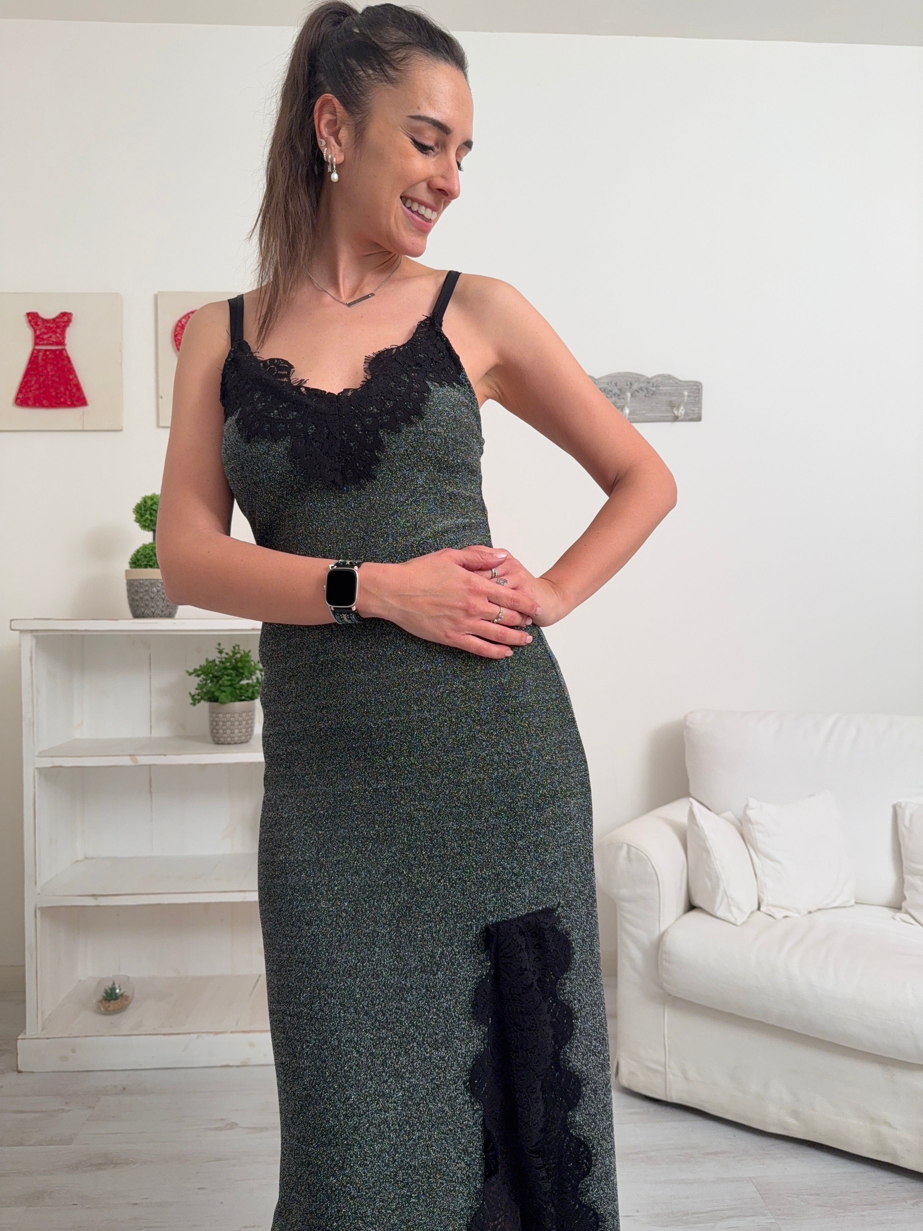 Descrizione: Abito lungo a canotta in lurex con pizzo, scollo a V, spalline regolabili e spacco su un lato.