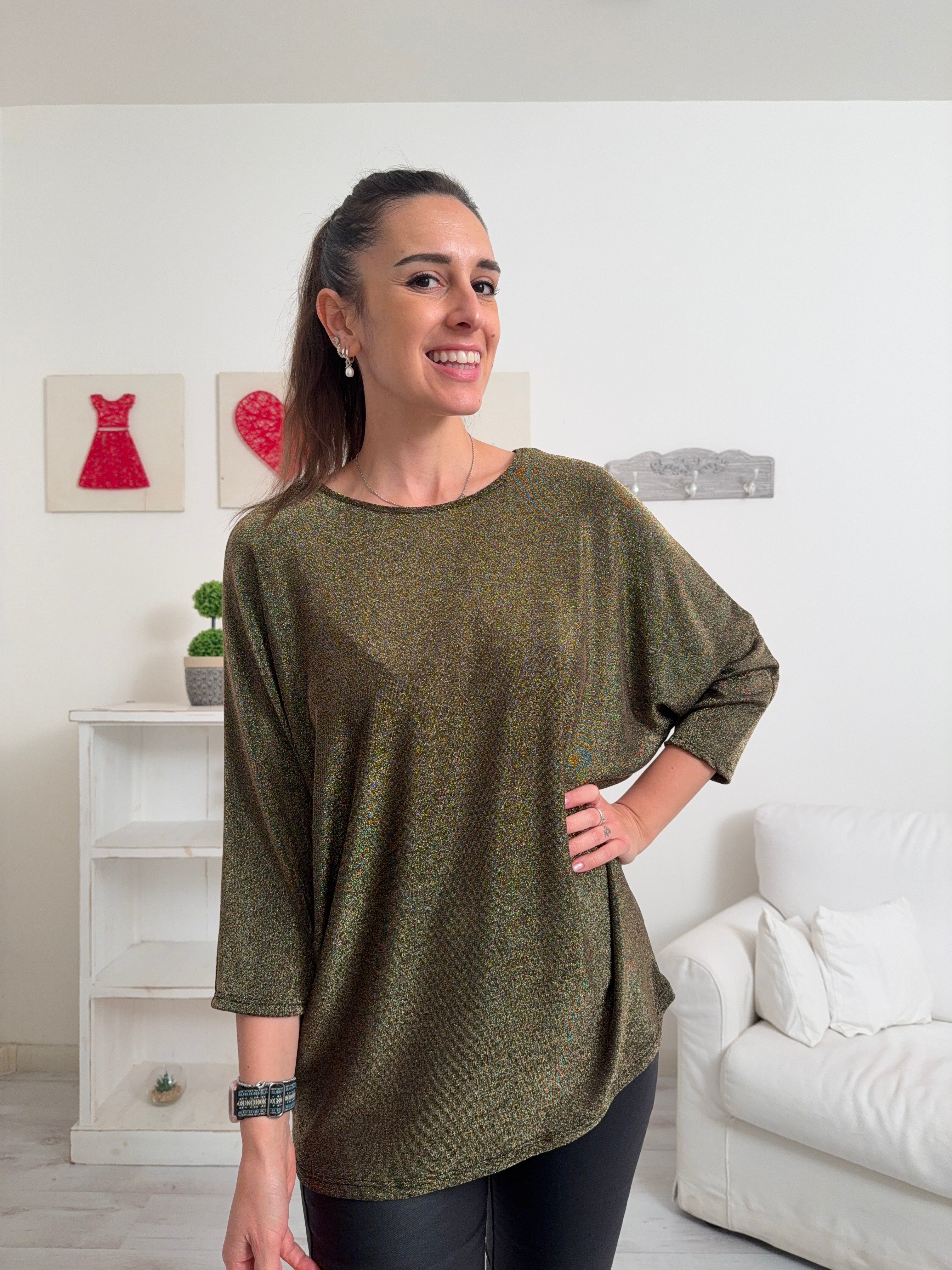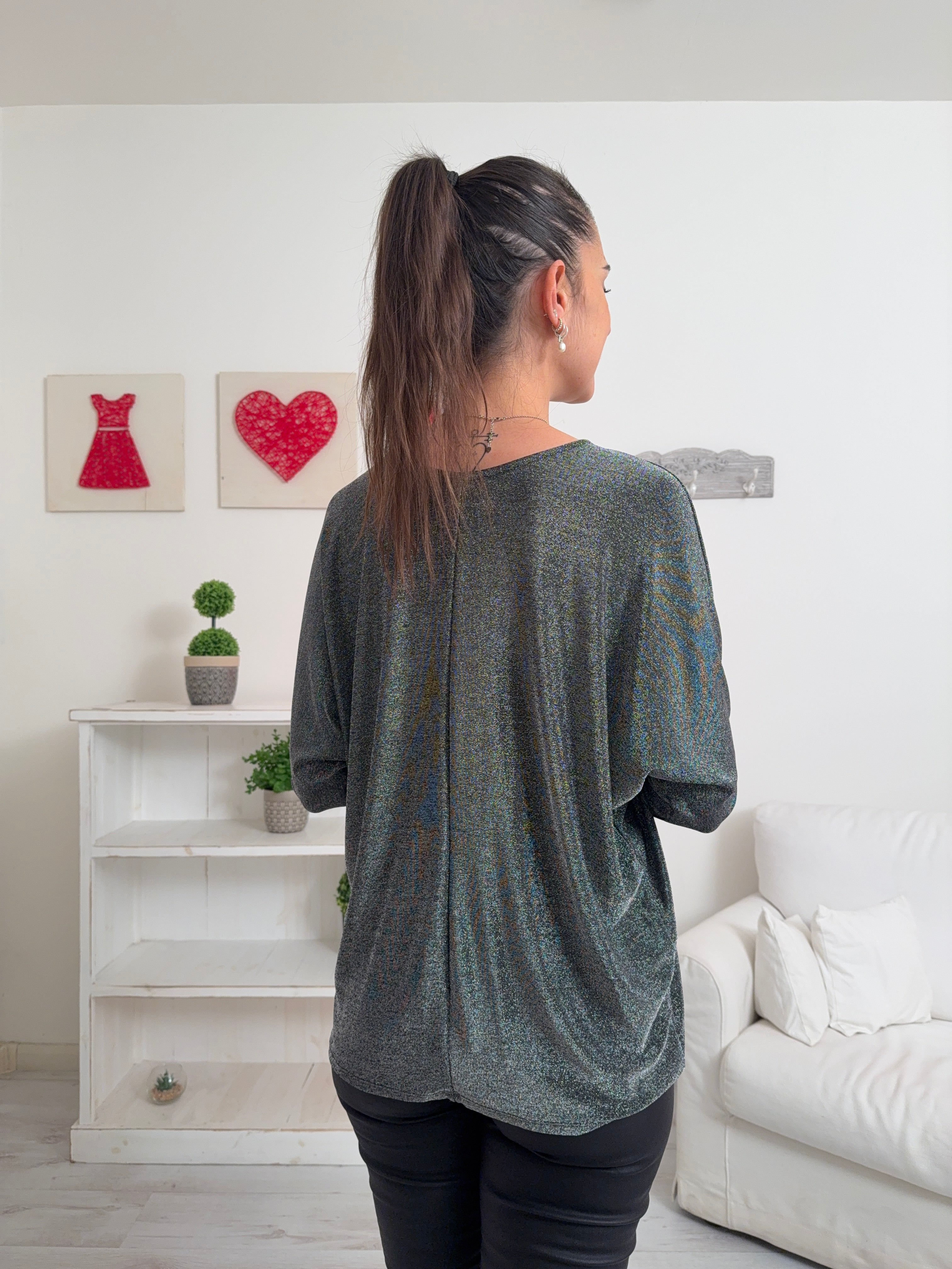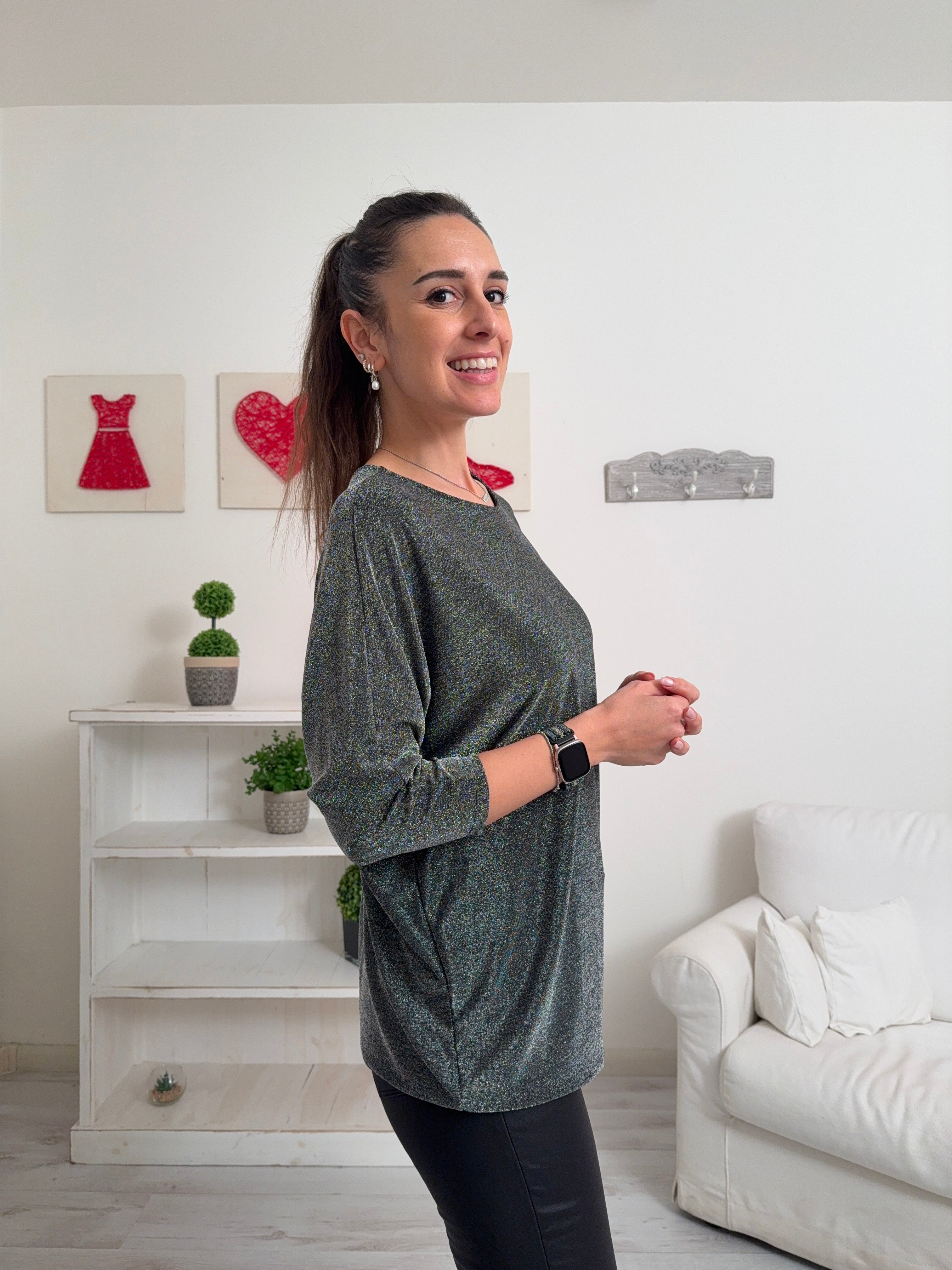 Descrizione: Blusa over elasticizzata in lurex con collo tondo e manica lunga a pipistrello.