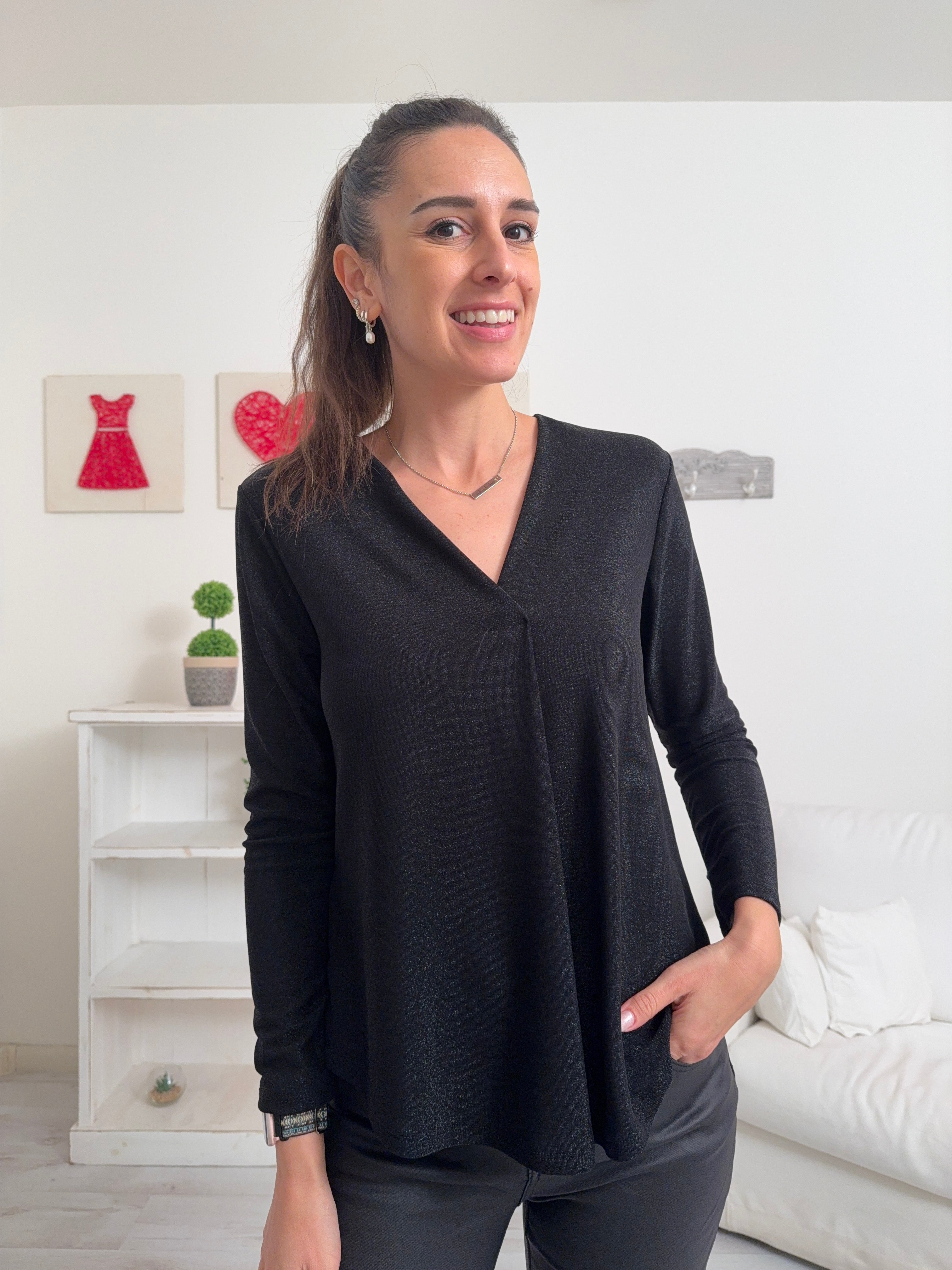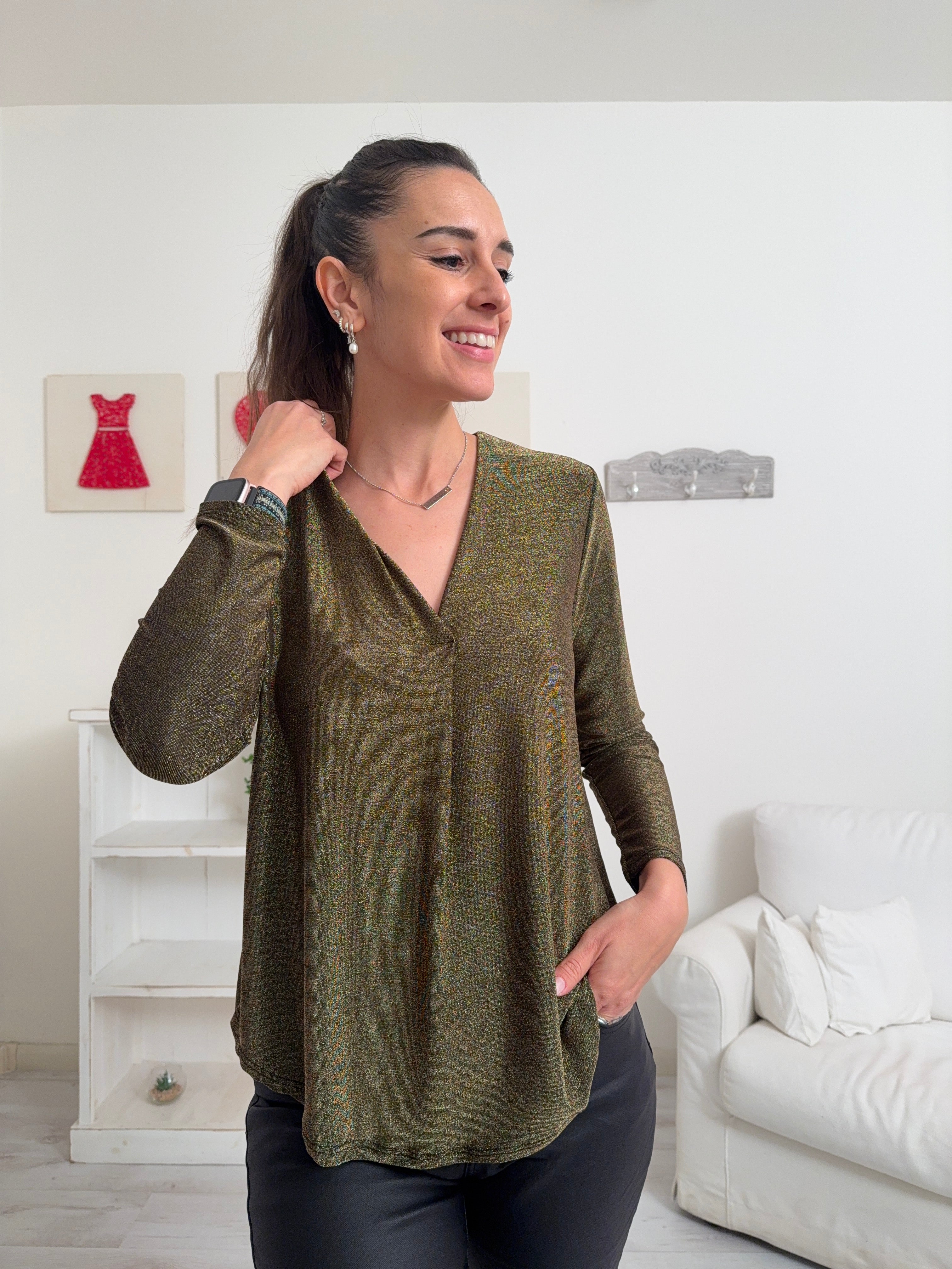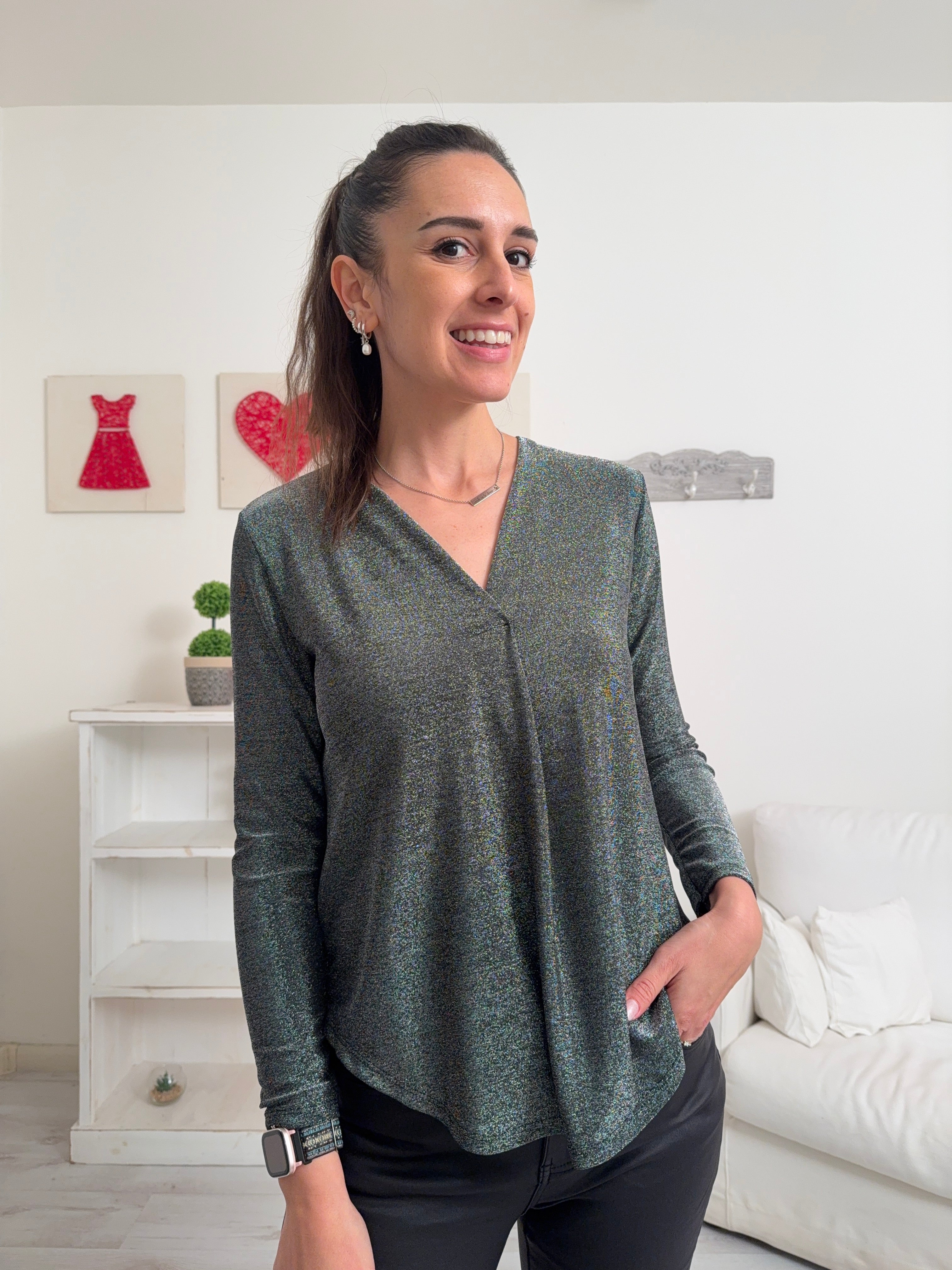 Descrizione: Blusa elasticizzata in lurex con scollo a V e manica lunga.