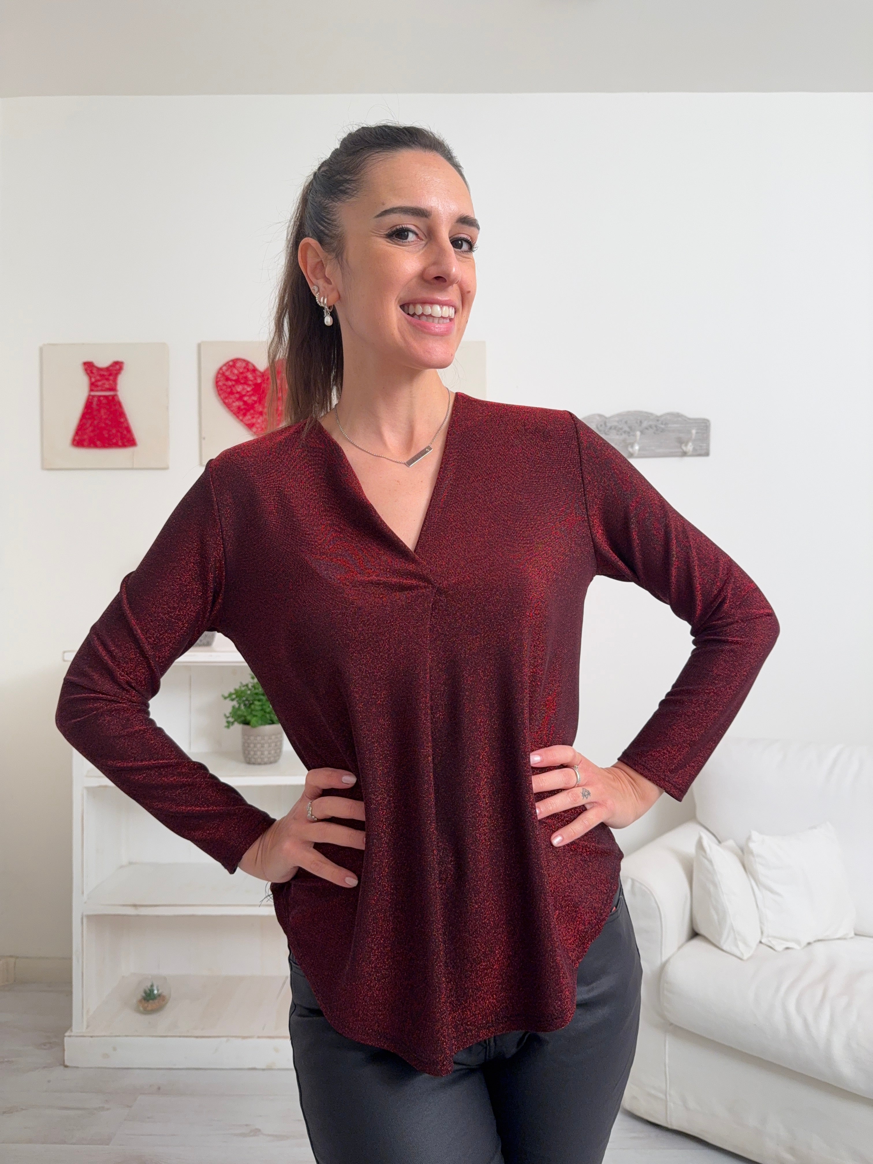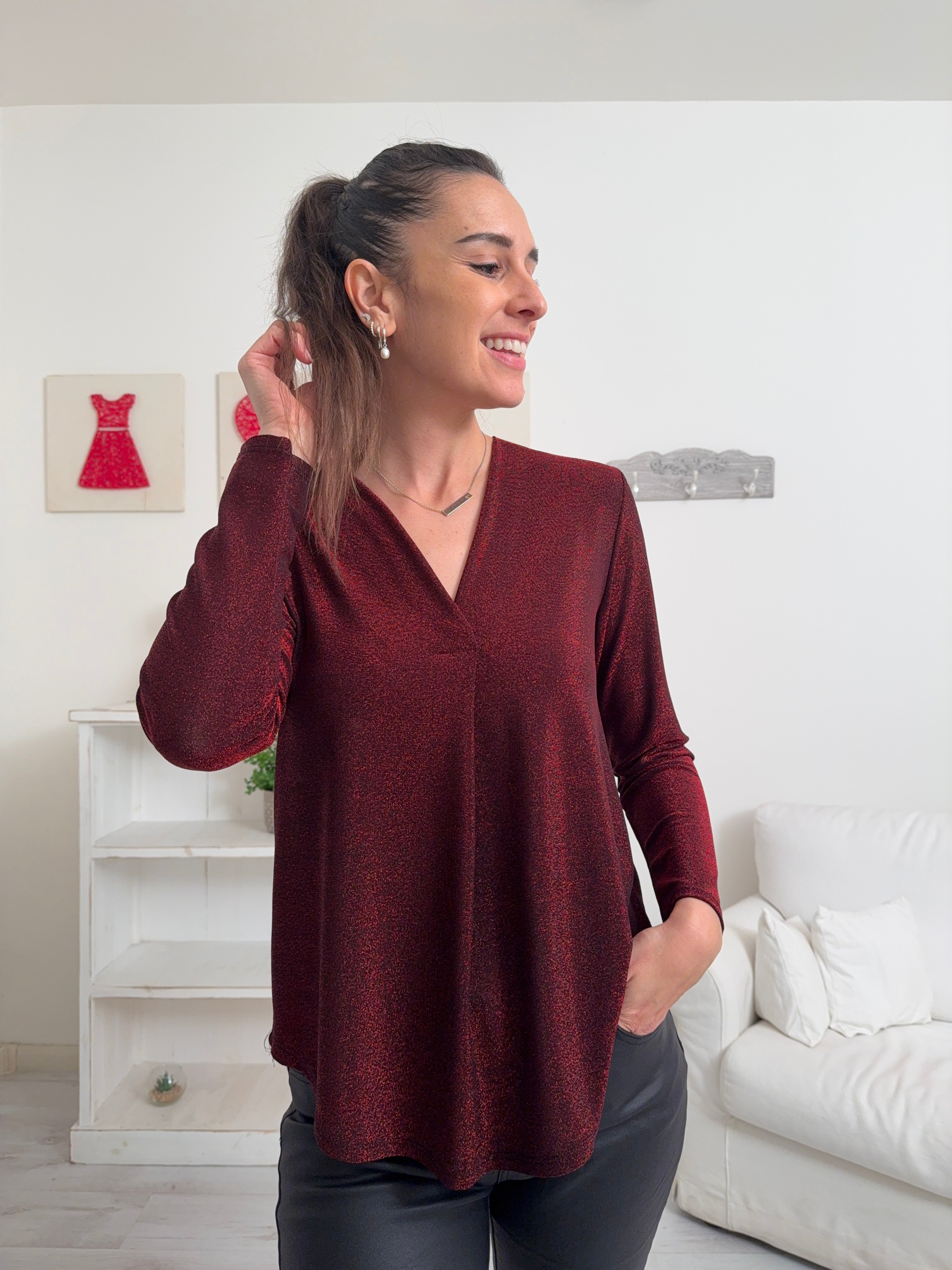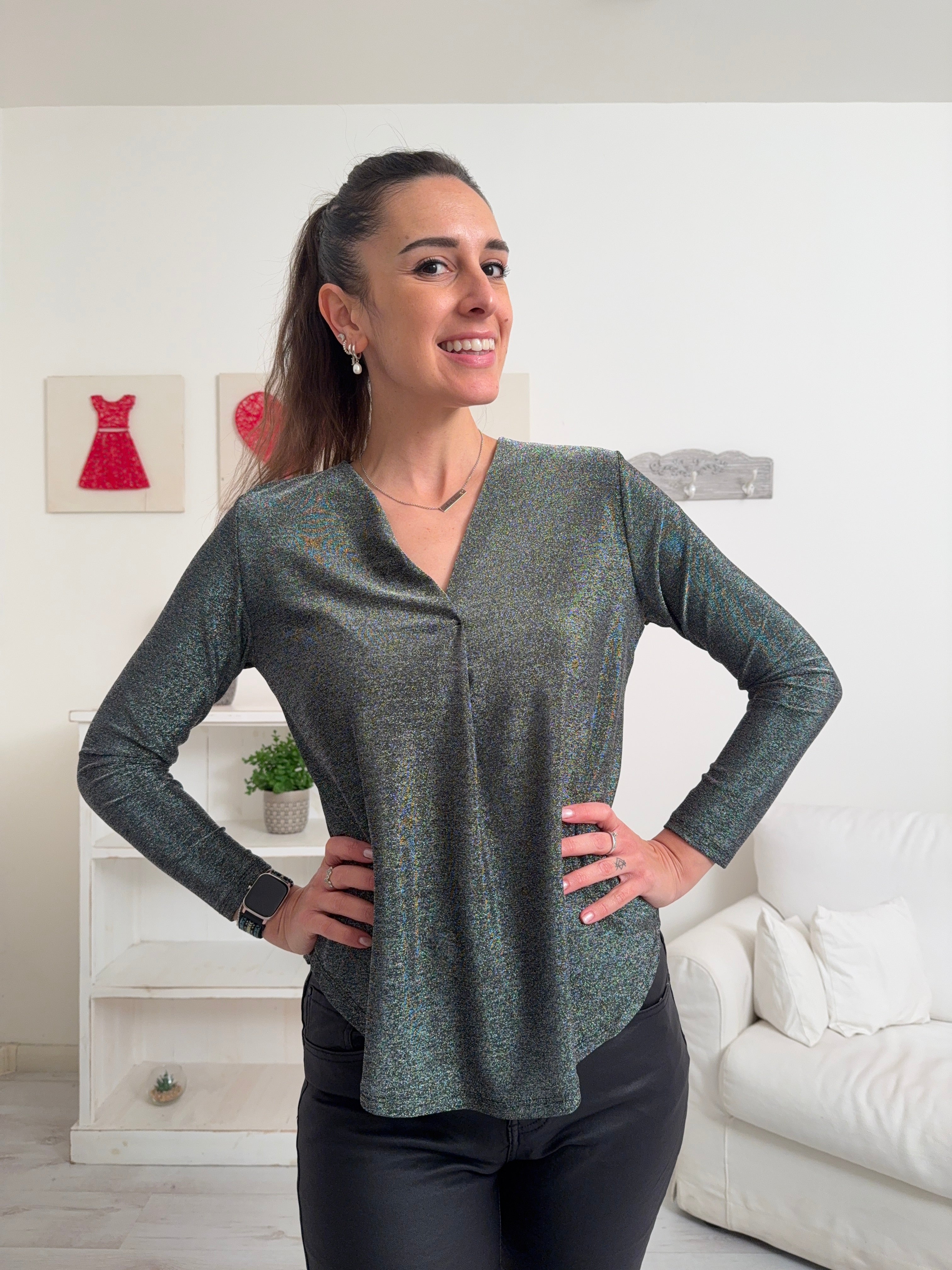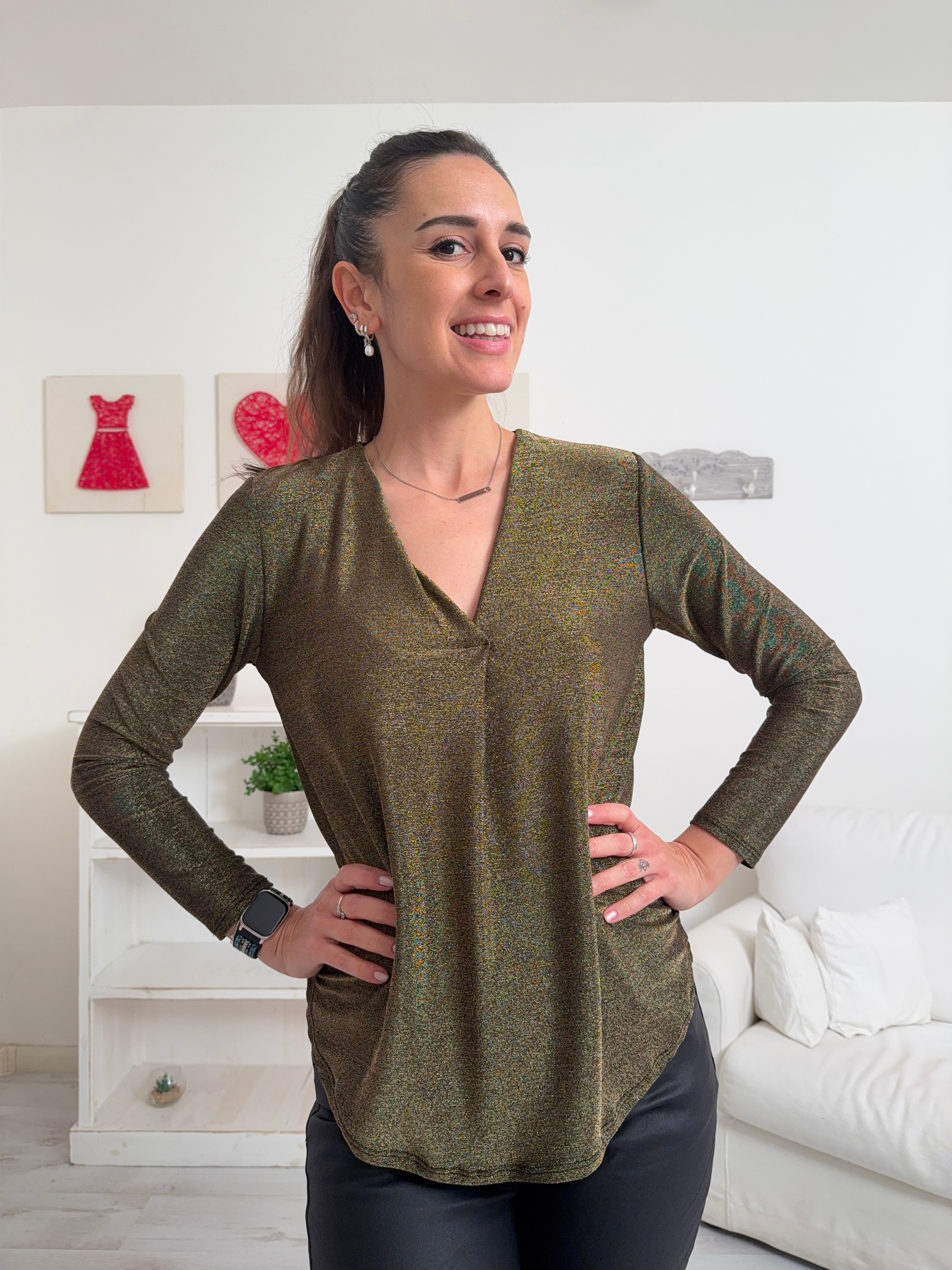 Descrizione: Blusa elasticizzata in lurex con scollo a V e manica lunga.