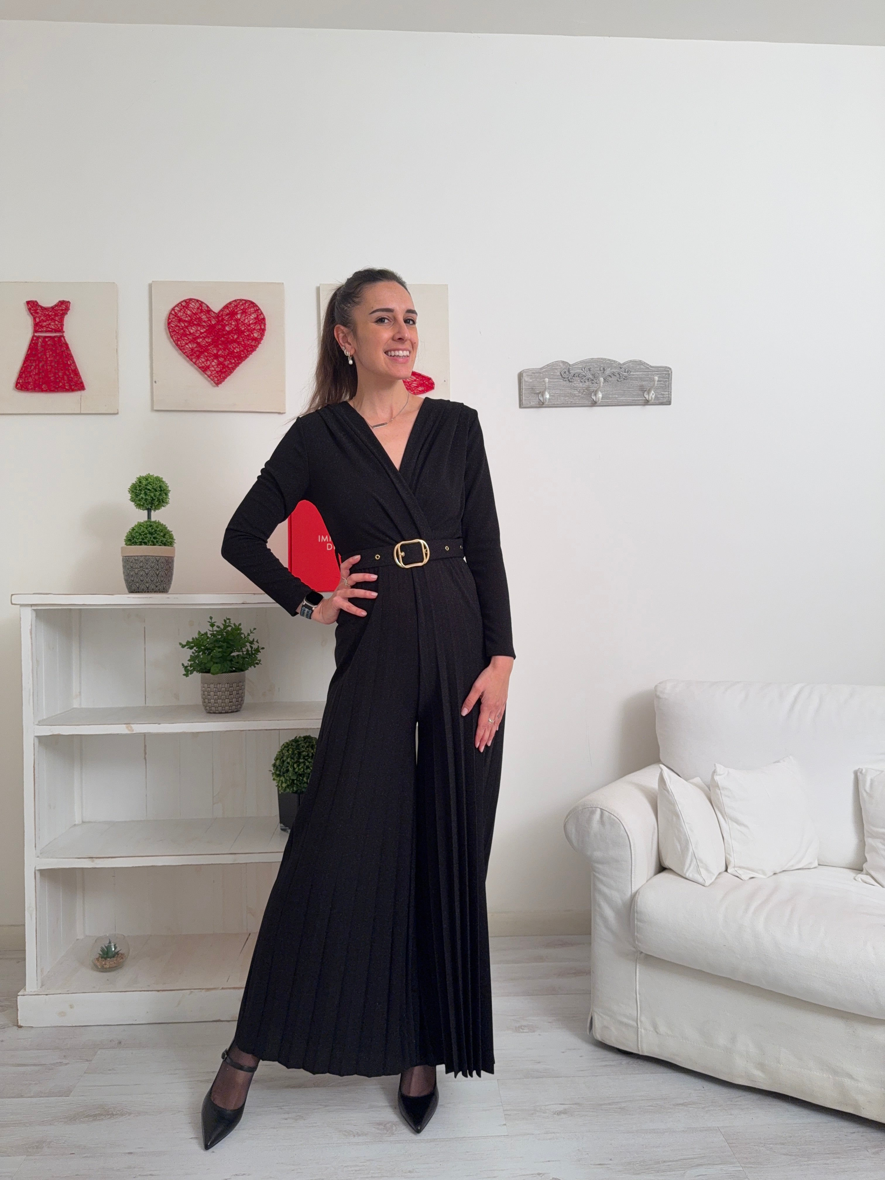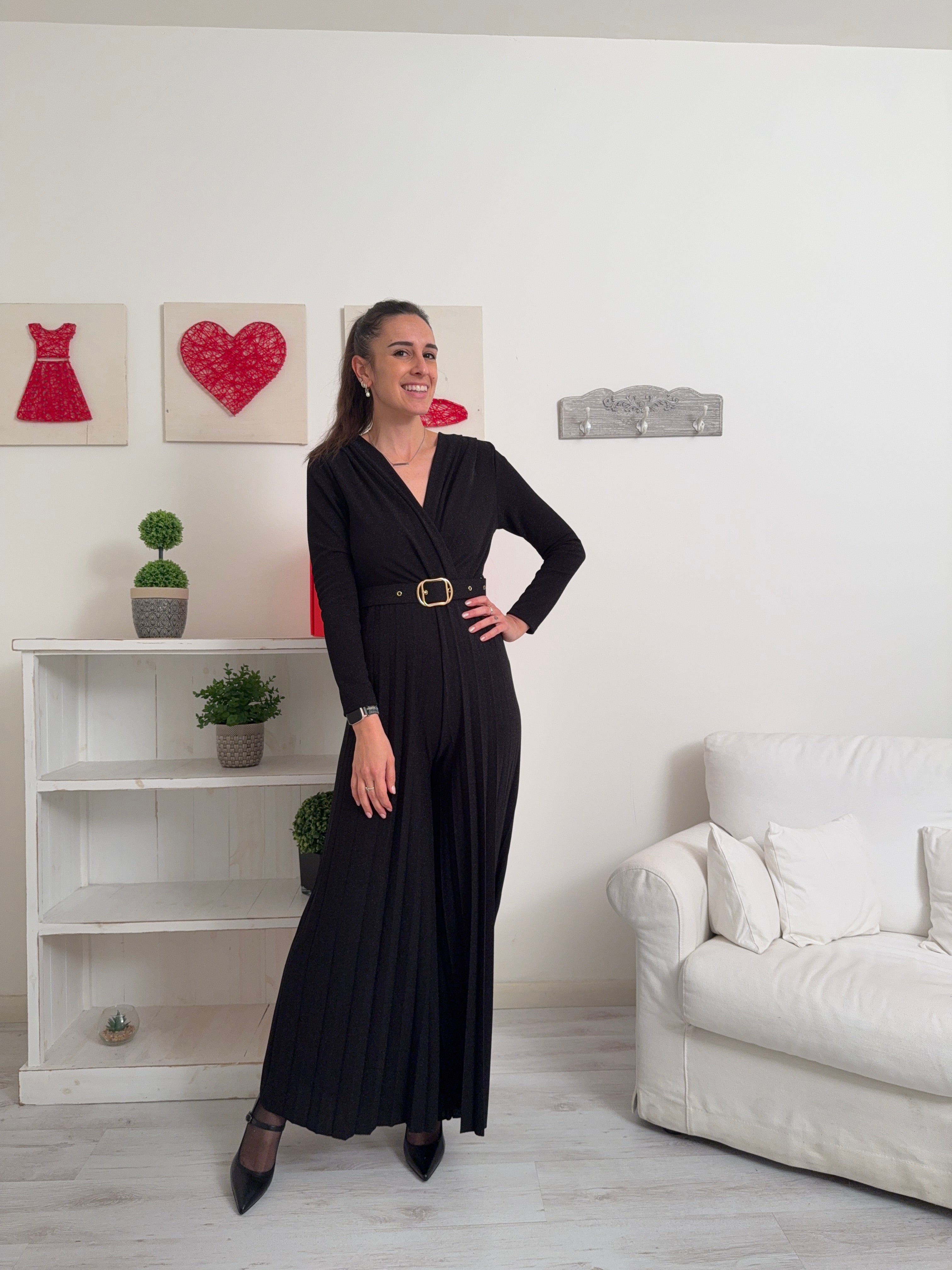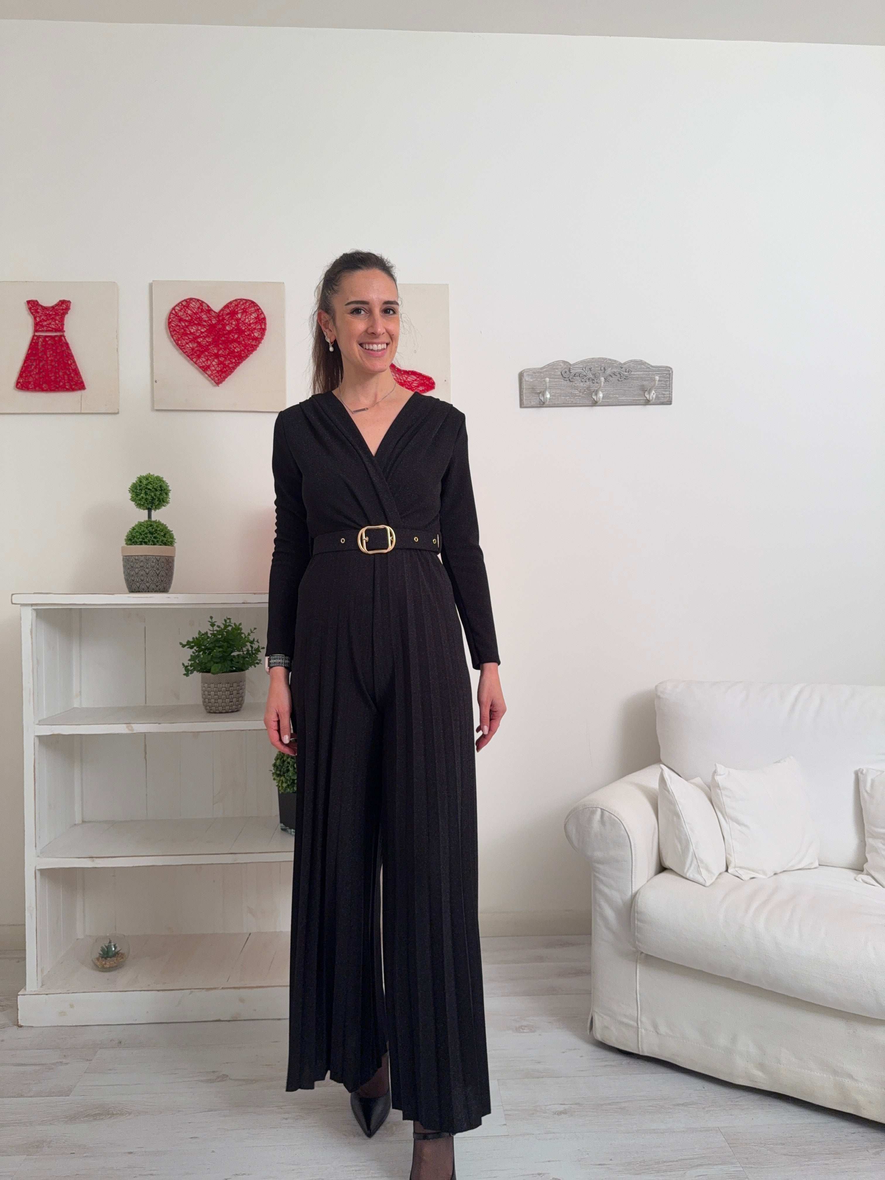 Descrizione: Tuta lunga a in lurex a maniche lunghe con scollo a V ad incrocio, cintura ed elastico in vita e gamba plissettata.