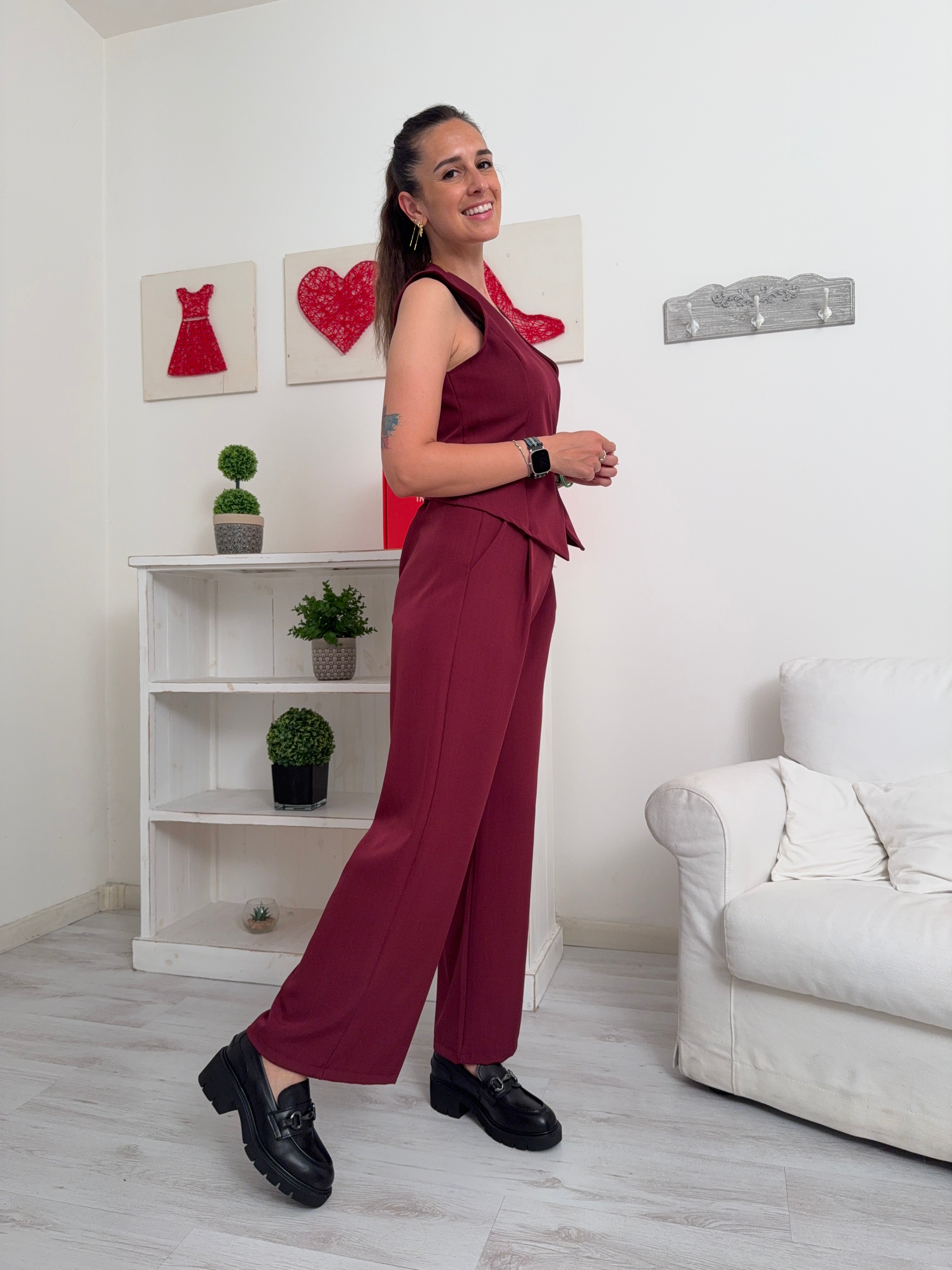Descrizione: Completo a composto da gilet senza maniche con chiusura con laccio, e pantalone a palazzo con elastico in vita, due tasche laterali e passanti per cintura.