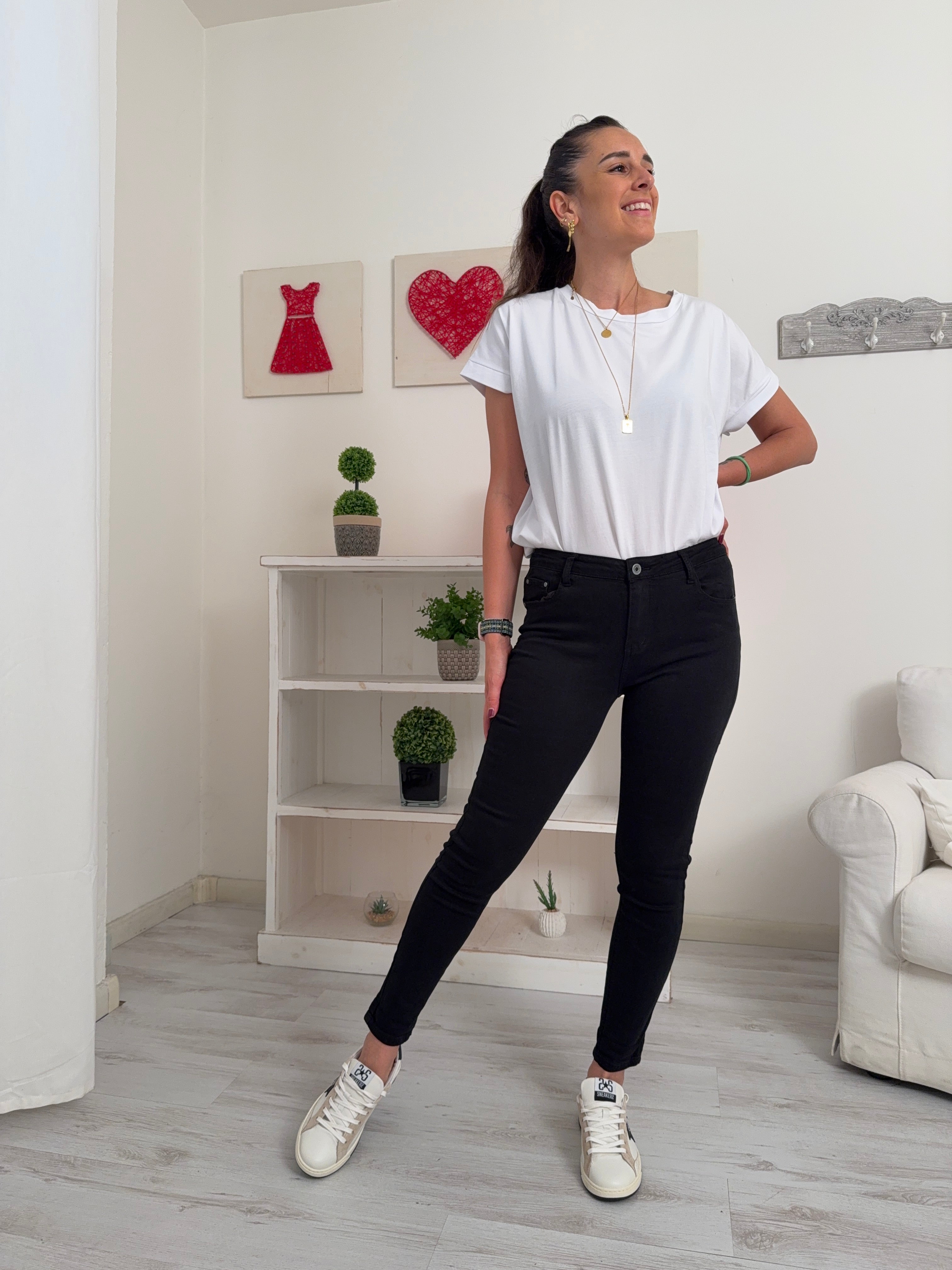 Descrizione: Jeans a vita alta  leggermente elasticizzato. Chiusura con 1 bottone e cerniera. Due tasche davanti e due tasche dietro.
