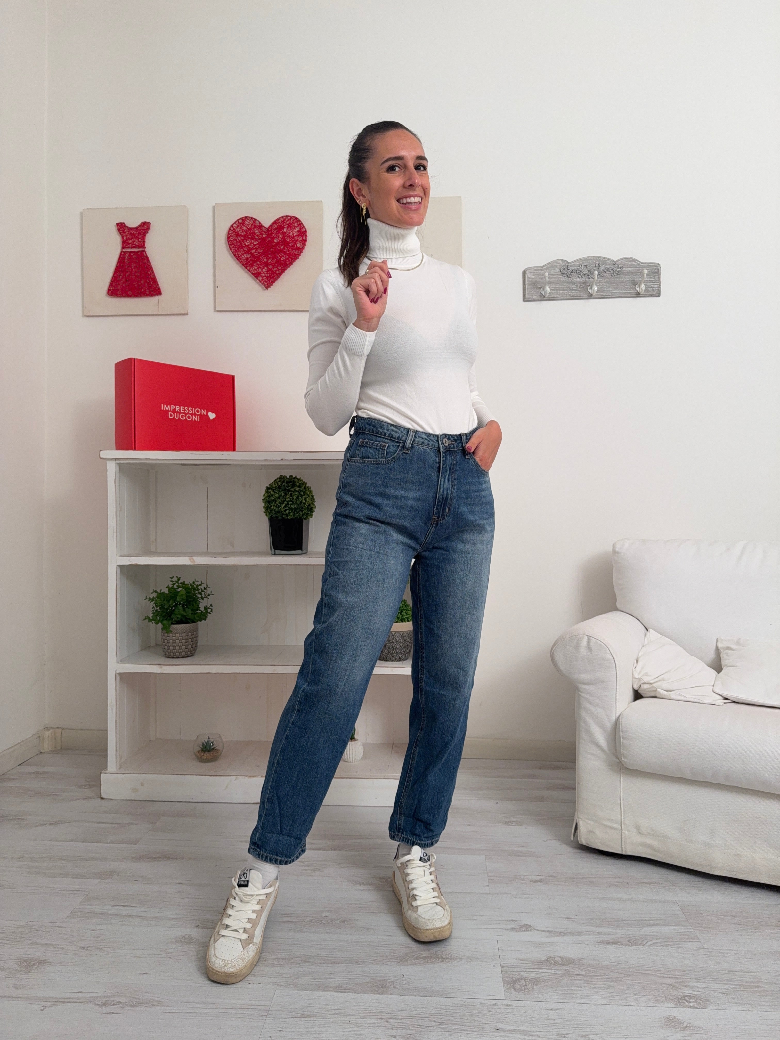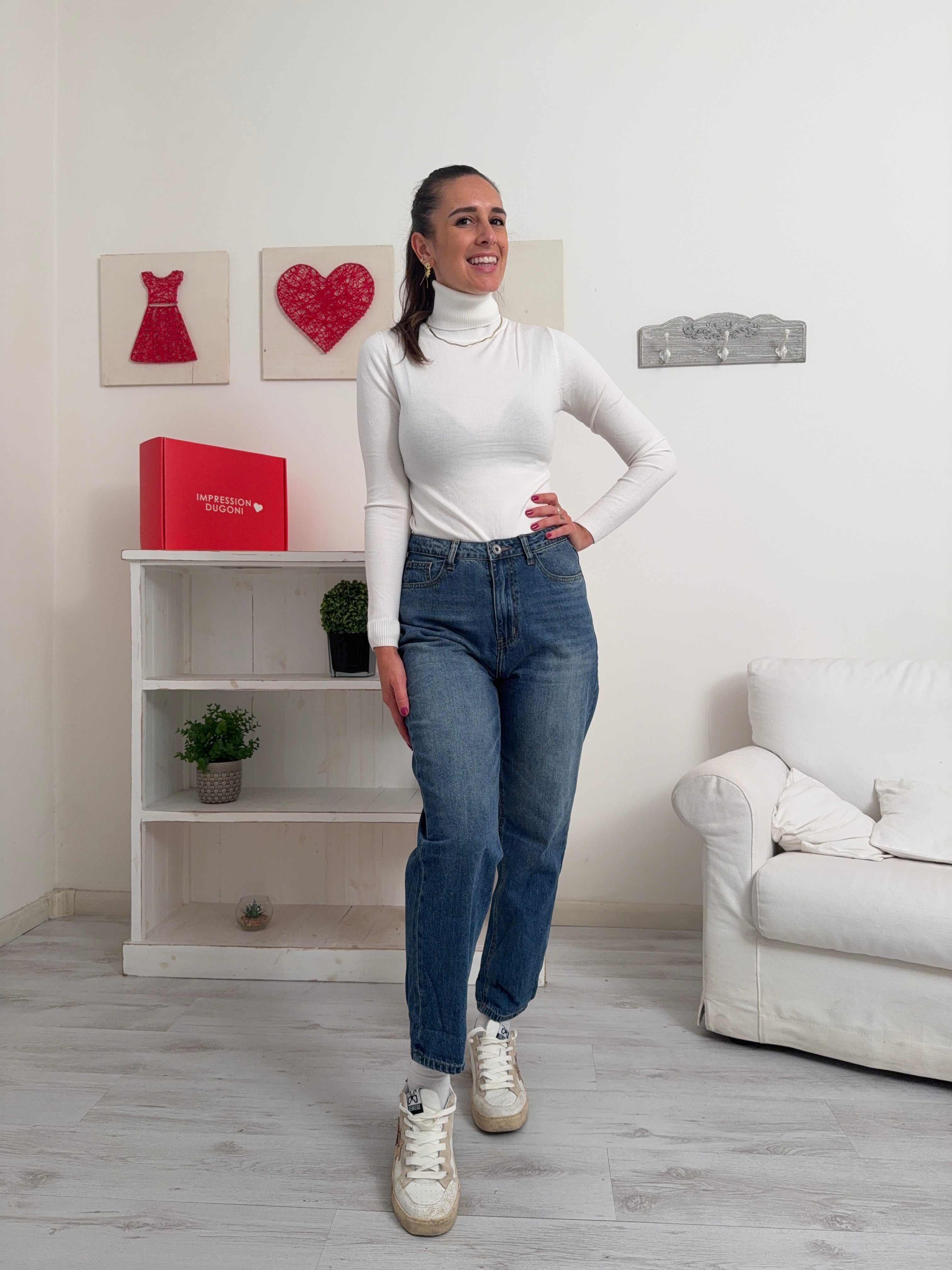 Descrizione: Jeans a vita alta taglio regular non elasticizzati. Chiusura con 1 bottone e cerniera. Due tasche davanti e due tasche dietro.