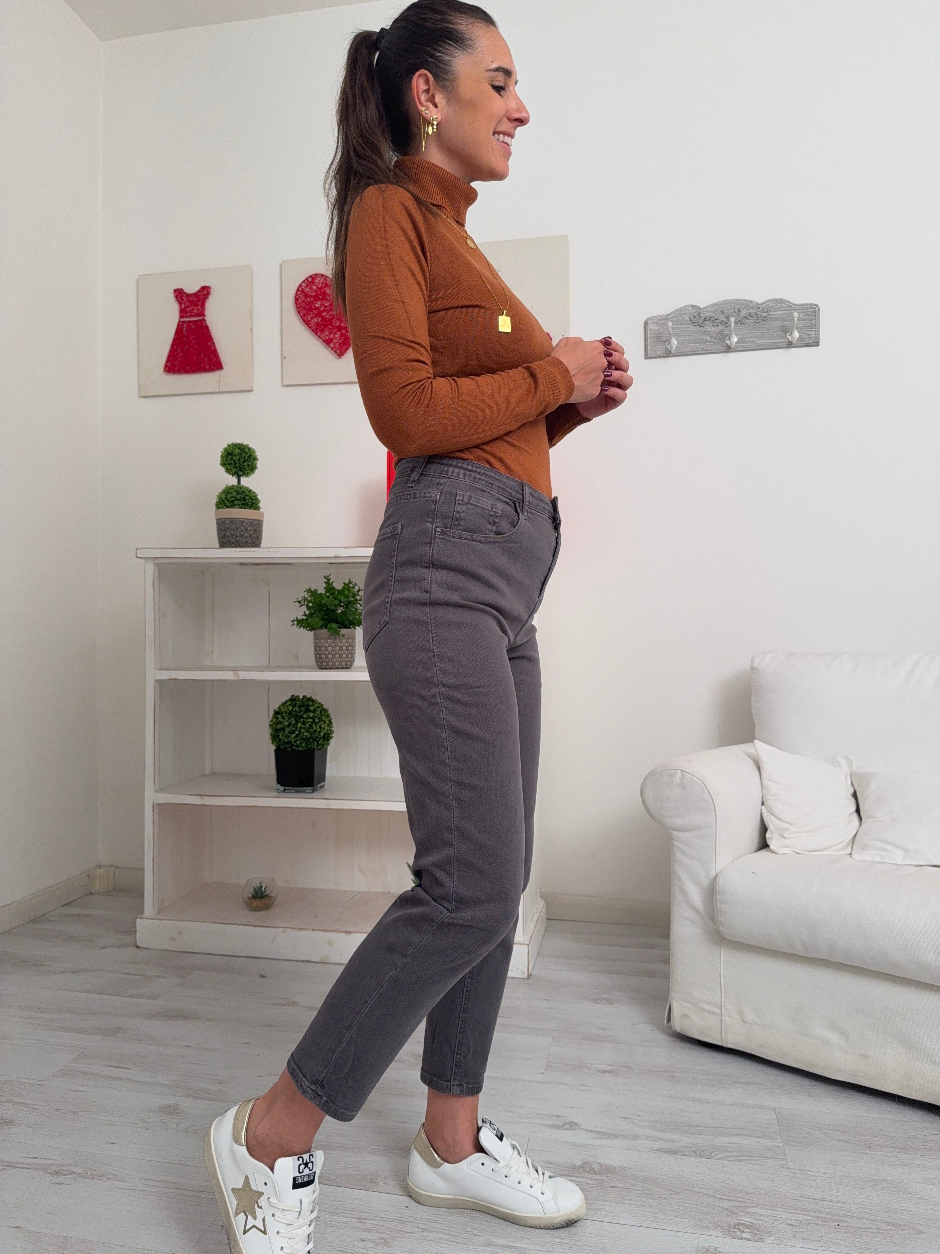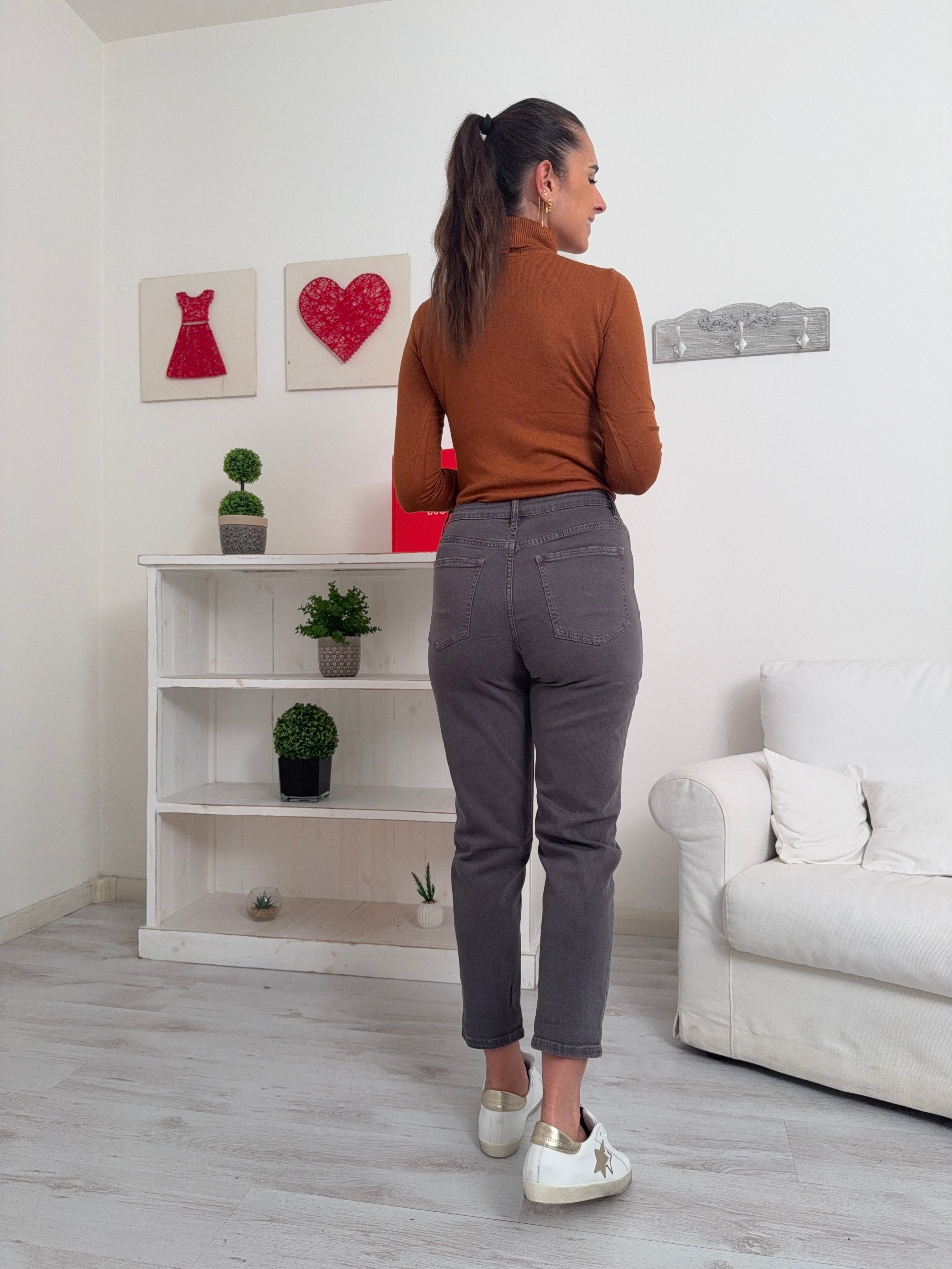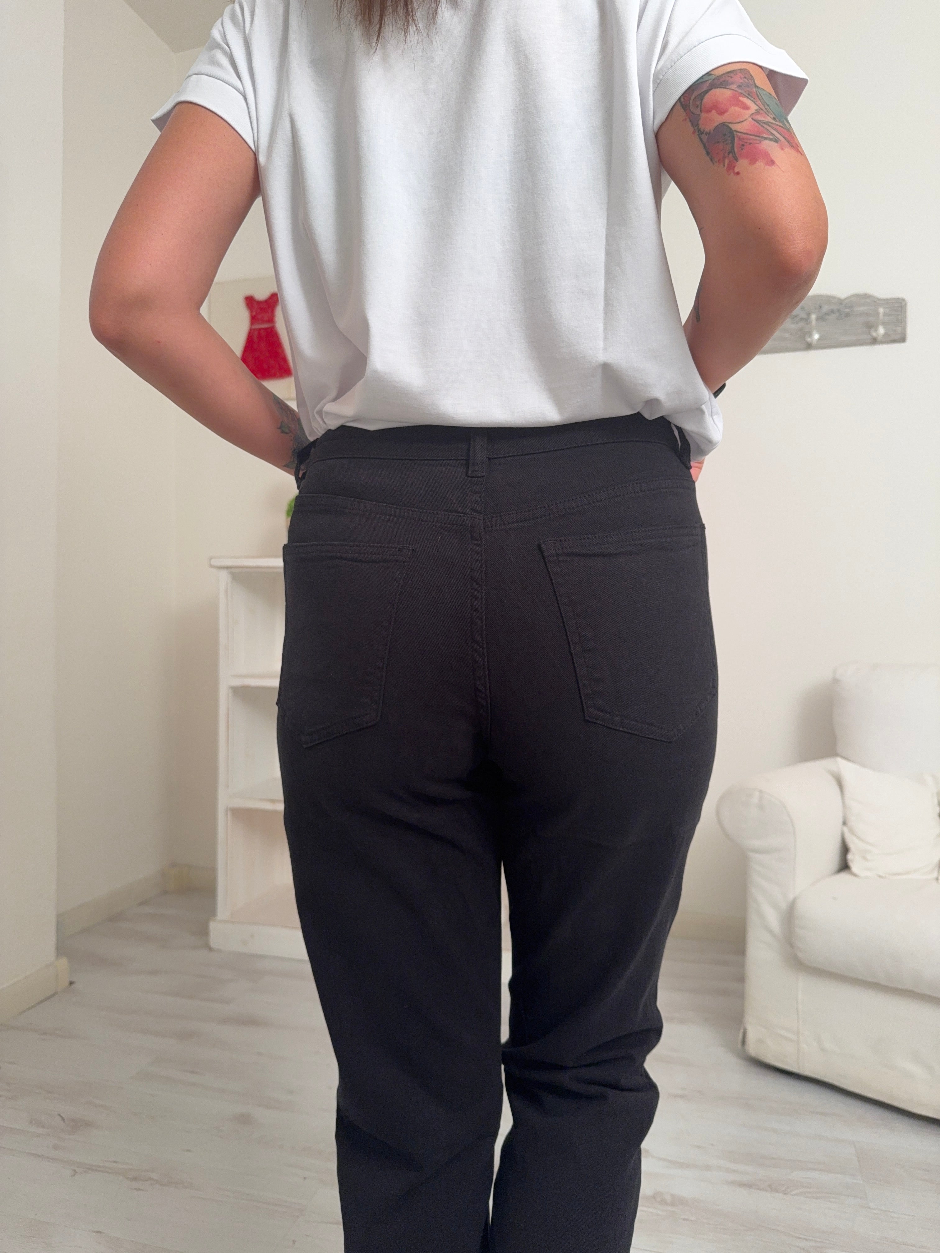 Descrizione: Pantalone a vita alta  leggermente elasticizzato. Chiusura con 1 bottone e cerniera. Due tasche davanti e due tasche dietro.
