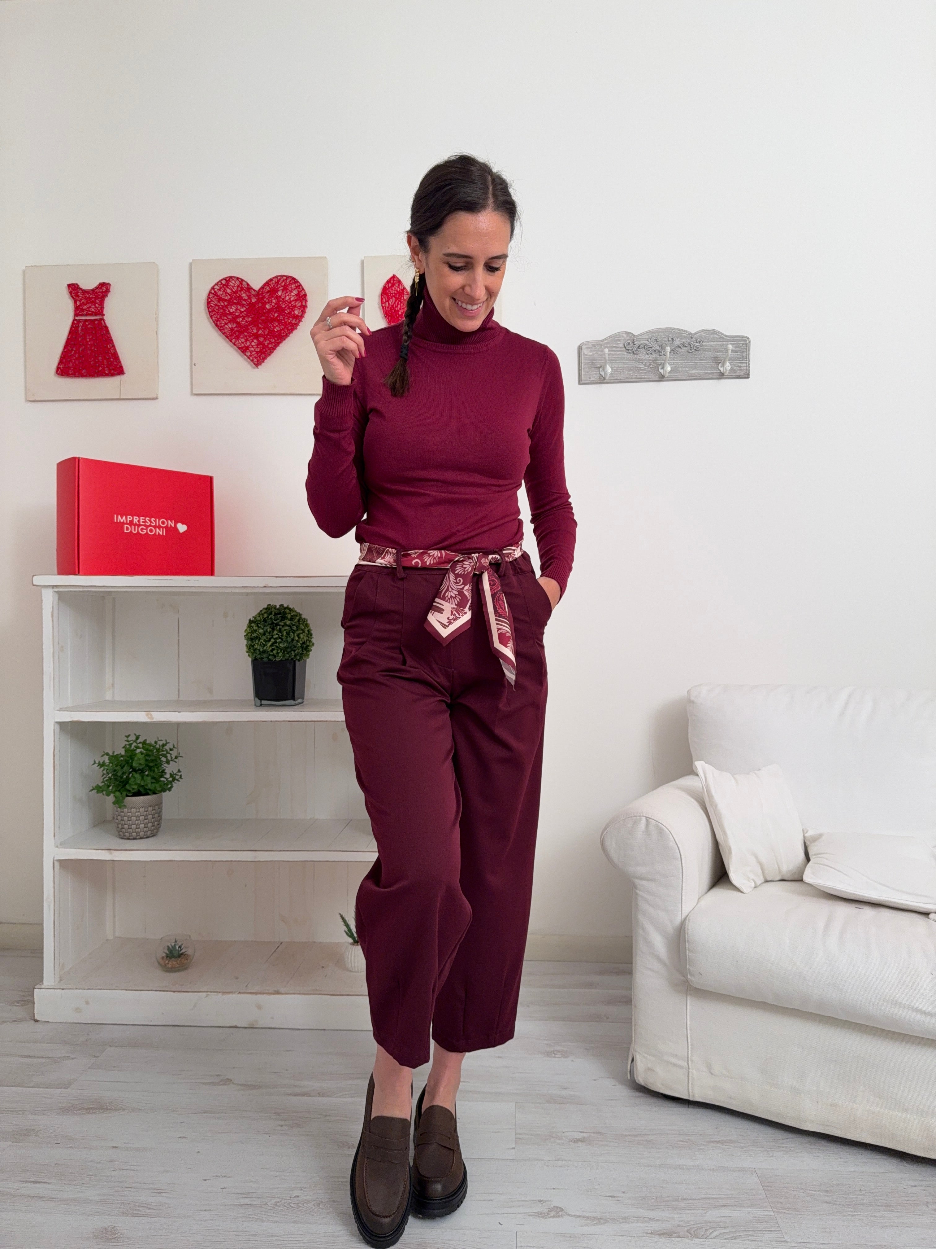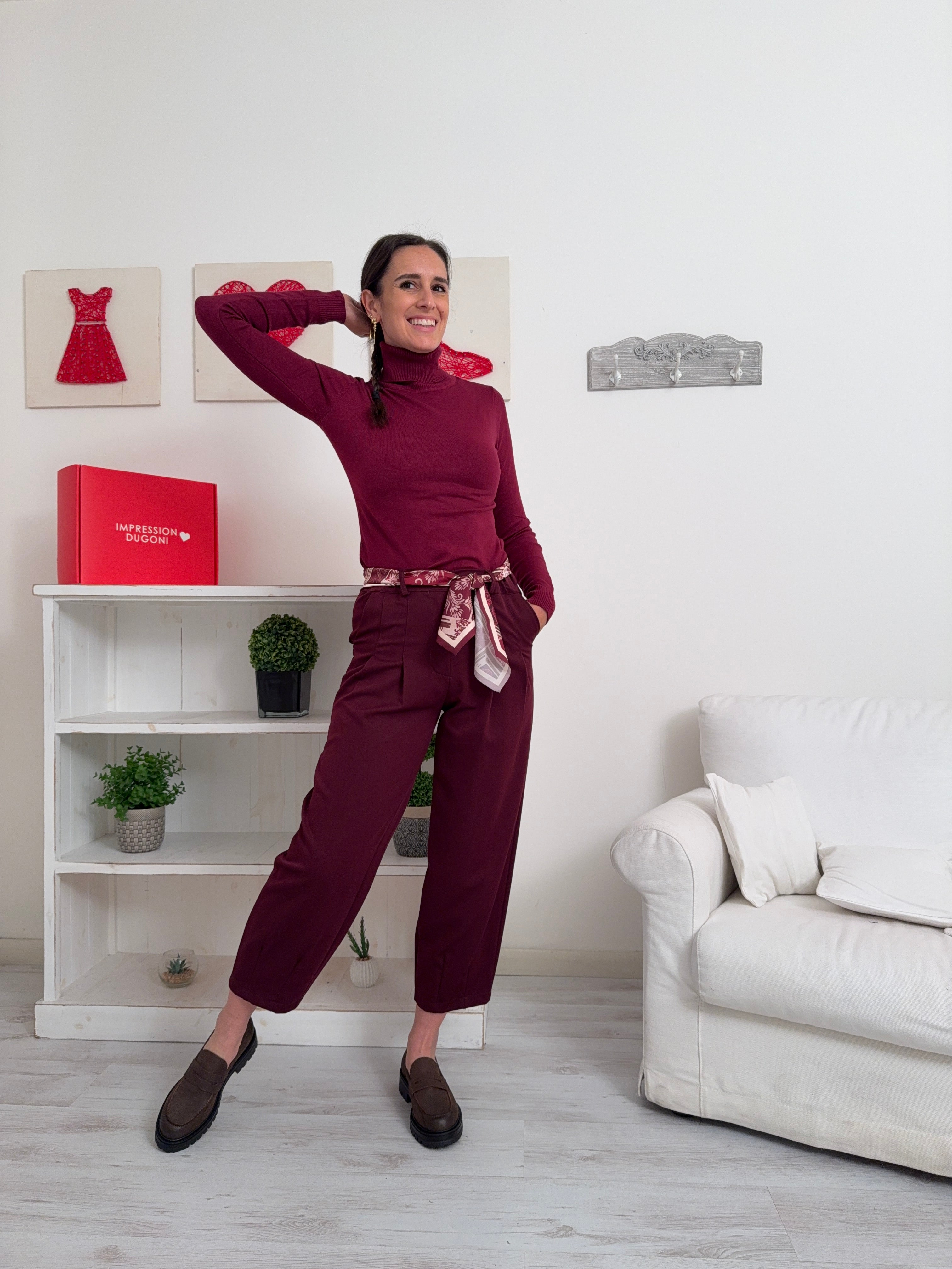 Descrizione: Pantalone a palloncino con pinces davanti e due tasche laterali. In vita elastico, foulard con fiocco e chiusura con cerniera e bottone.