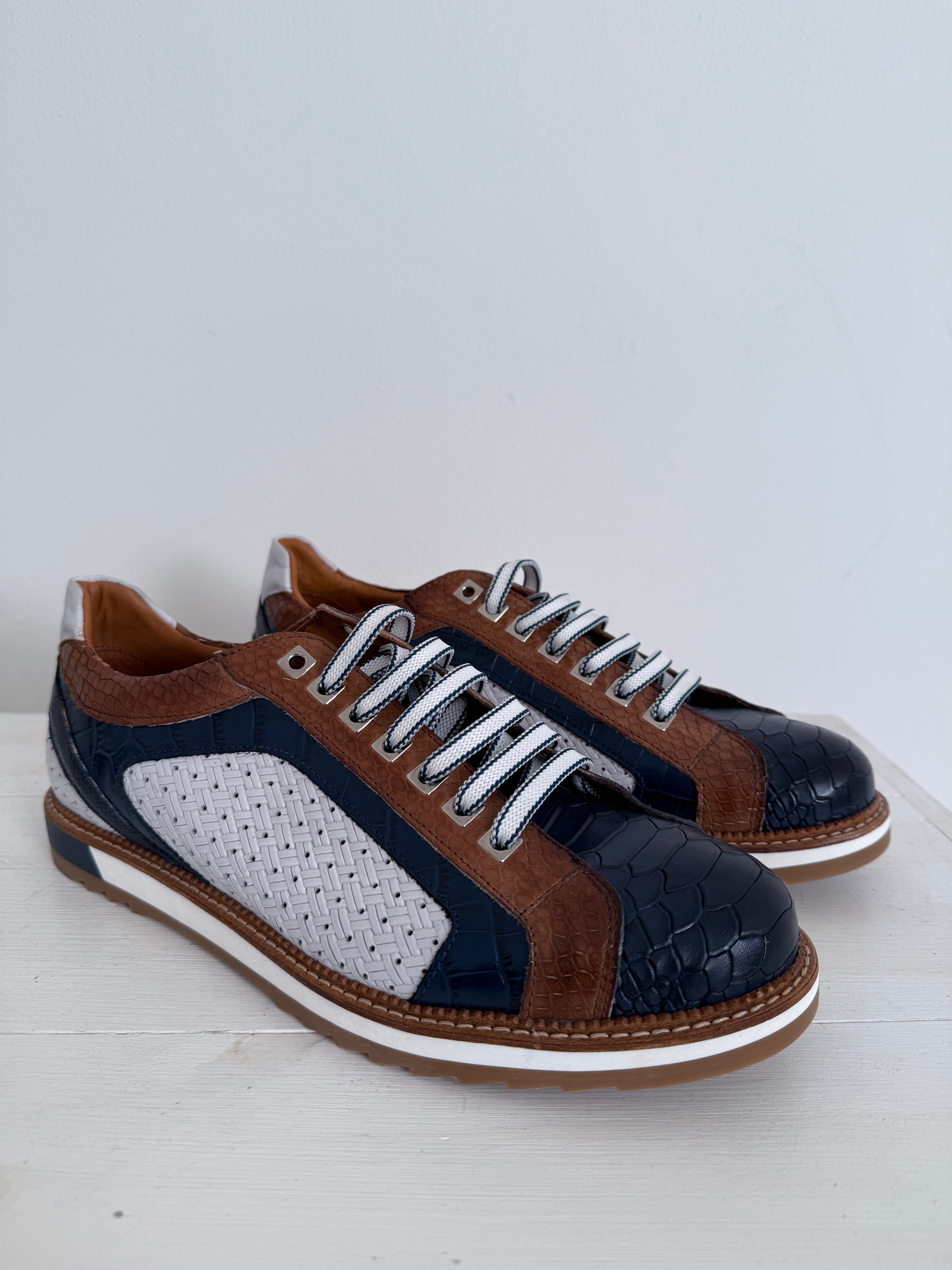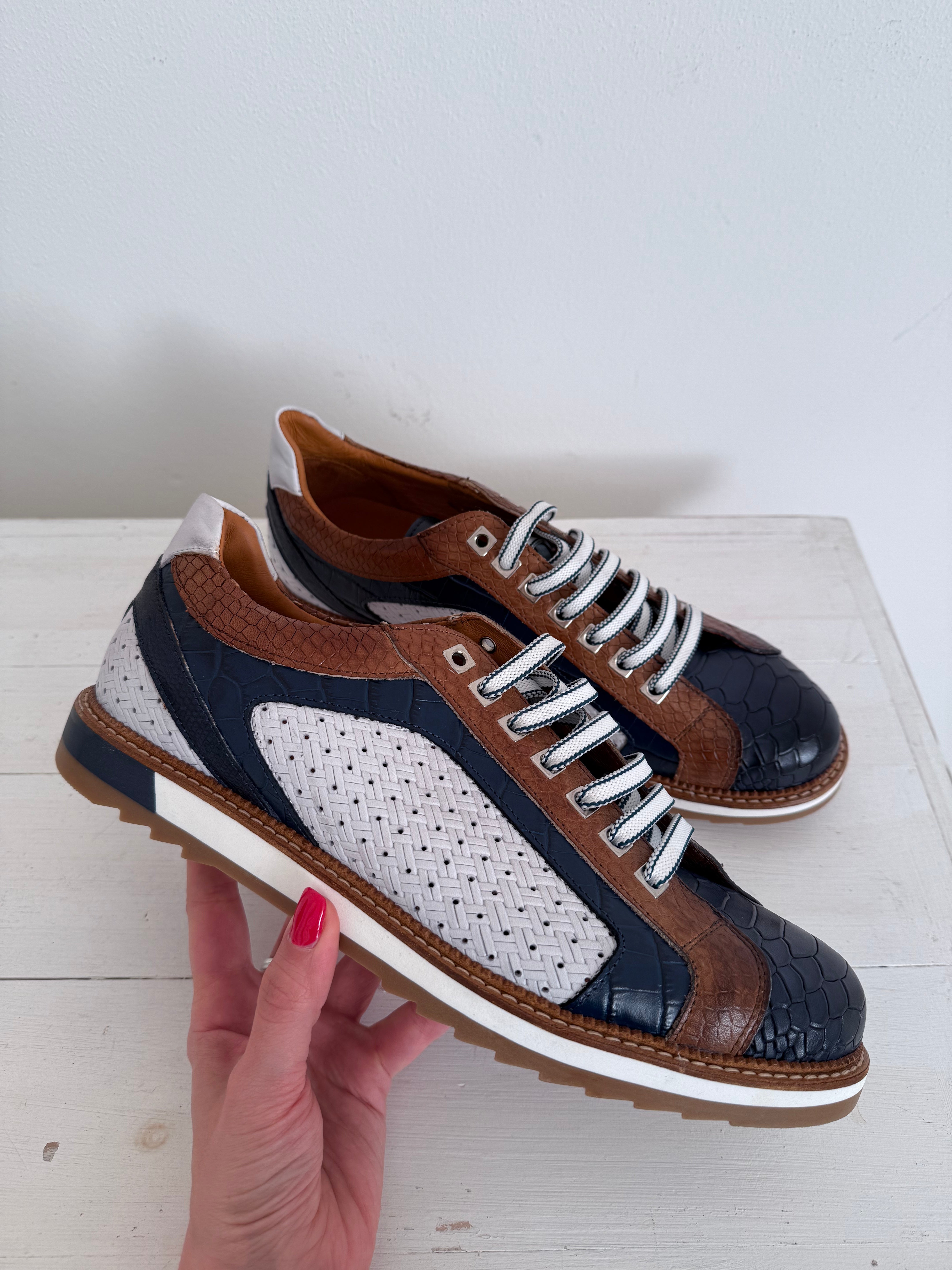 Sneaker dal design esclusivo che unisce artigianalità e modernità. Realizzata in vitello stampato con texture marine, si distingue per il mix di tonalità legno, marrone e dettagli blu che conferiscono profondità e carattere. La lavorazione della pelle mette in risalto i contrasti materici, mentre la suola in gomma garantisce comfort e resistenza. Una calzatura versatile e ricercata, perfetta per chi desidera distinguersi con uno stile unico.