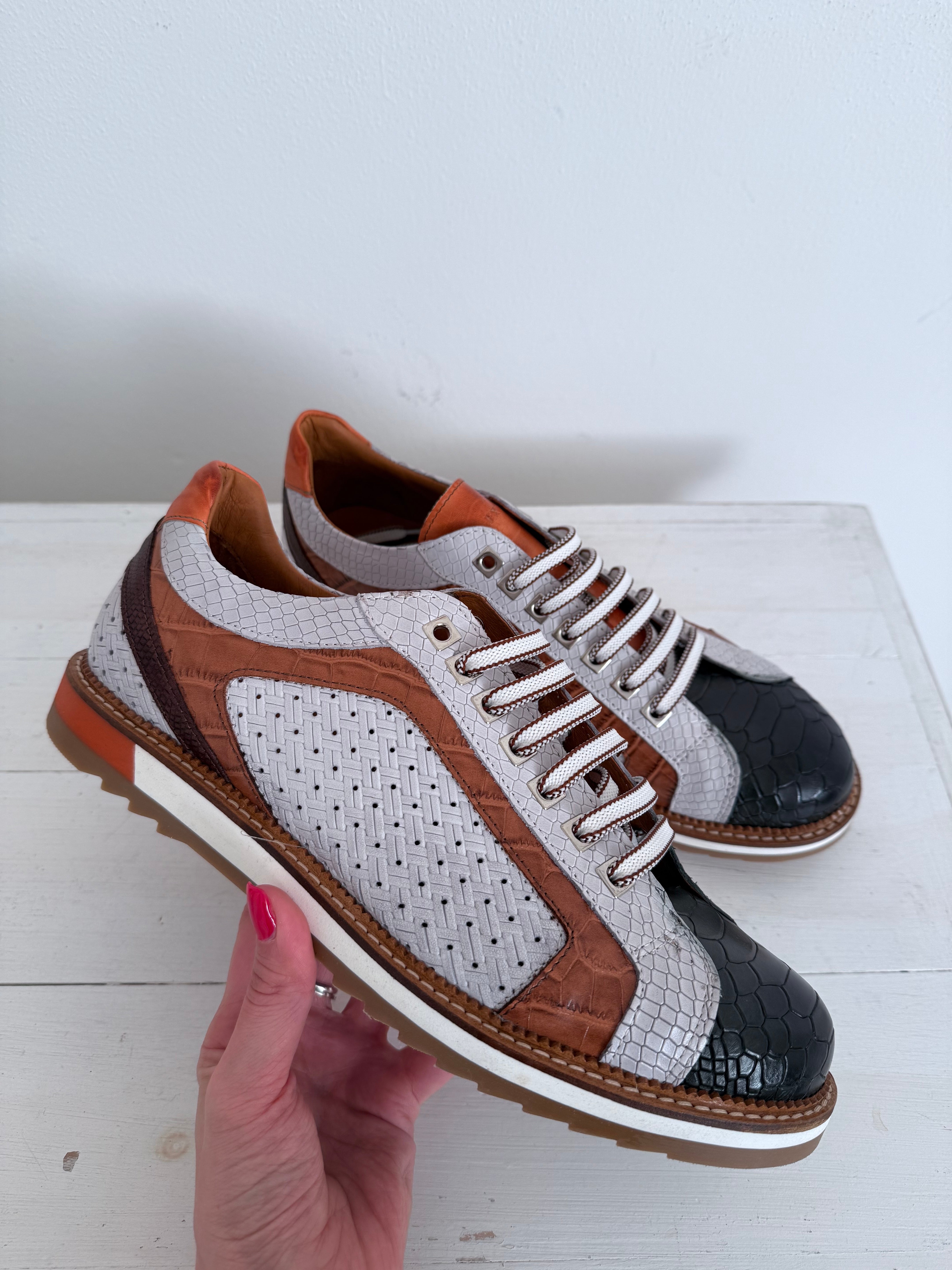 Sneaker dal design esclusivo che unisce artigianalità e modernità. Realizzata in vitello stampato con texture marine, si distingue per il mix di tonalità legno, marrone e dettagli blu che conferiscono profondità e carattere. La lavorazione della pelle mette in risalto i contrasti materici, mentre la suola in gomma garantisce comfort e resistenza. Una calzatura versatile e ricercata, perfetta per chi desidera distinguersi con uno stile unico.