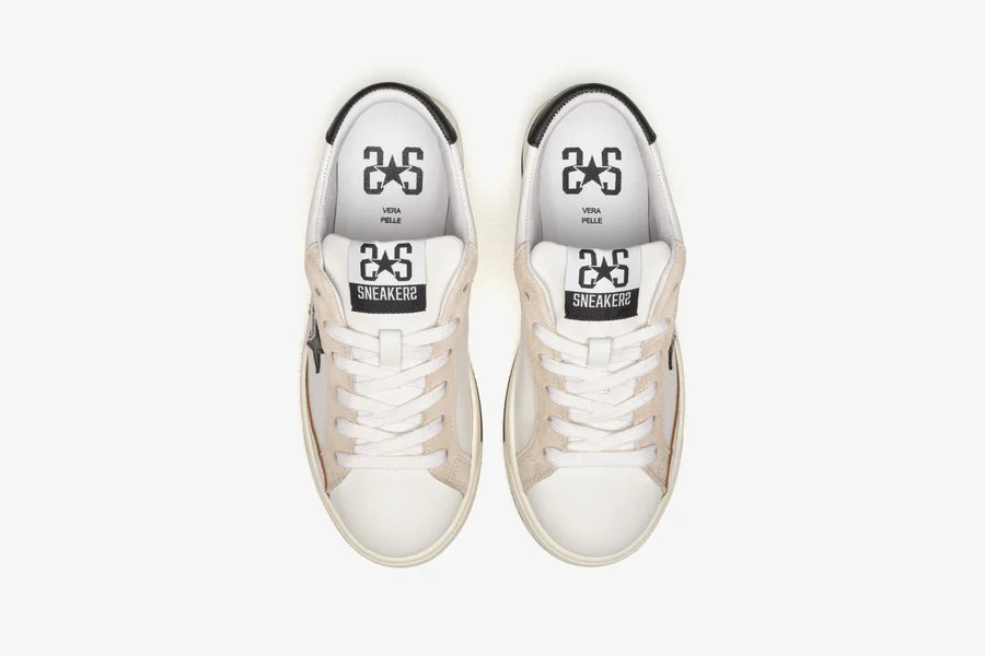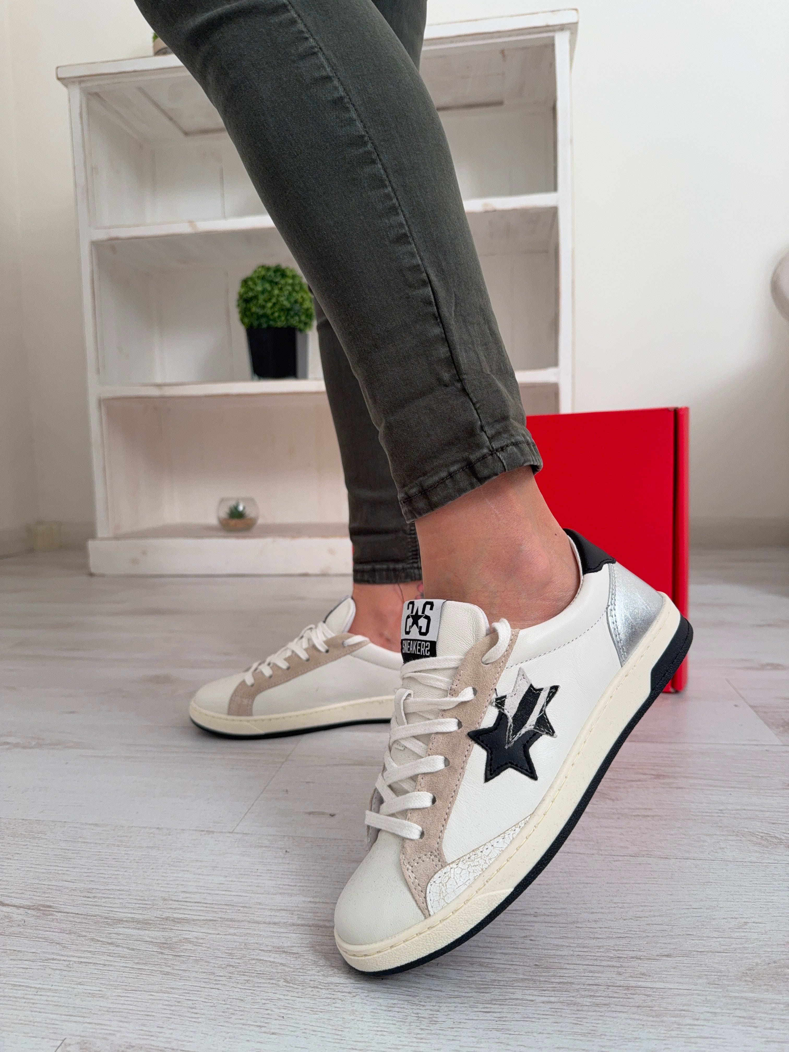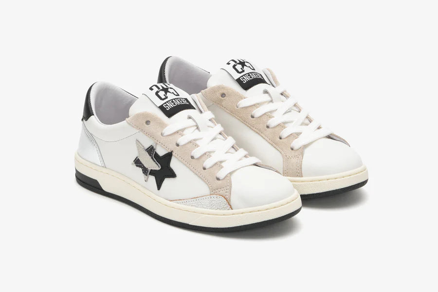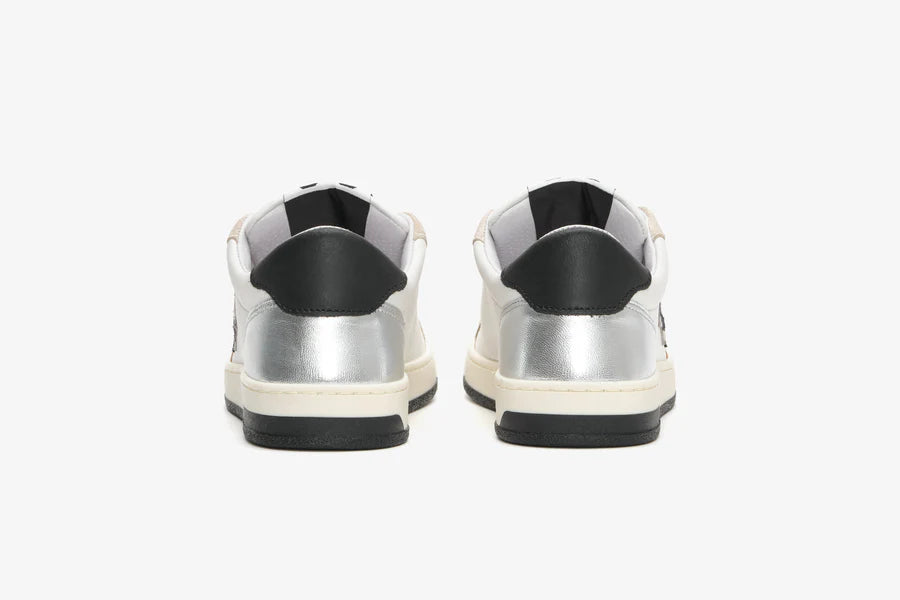 Sneakers now star in pelle bianca con dettagli in beige, nero, e argento zebrato