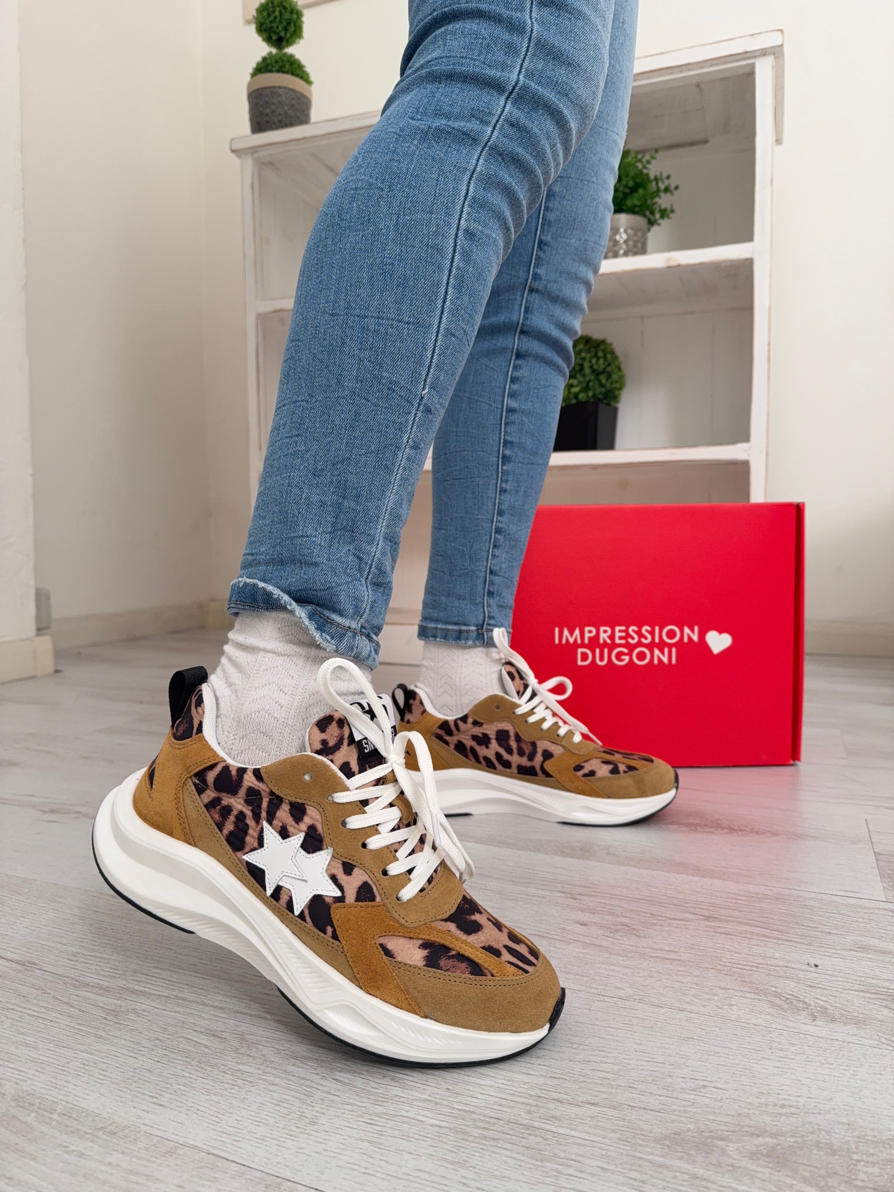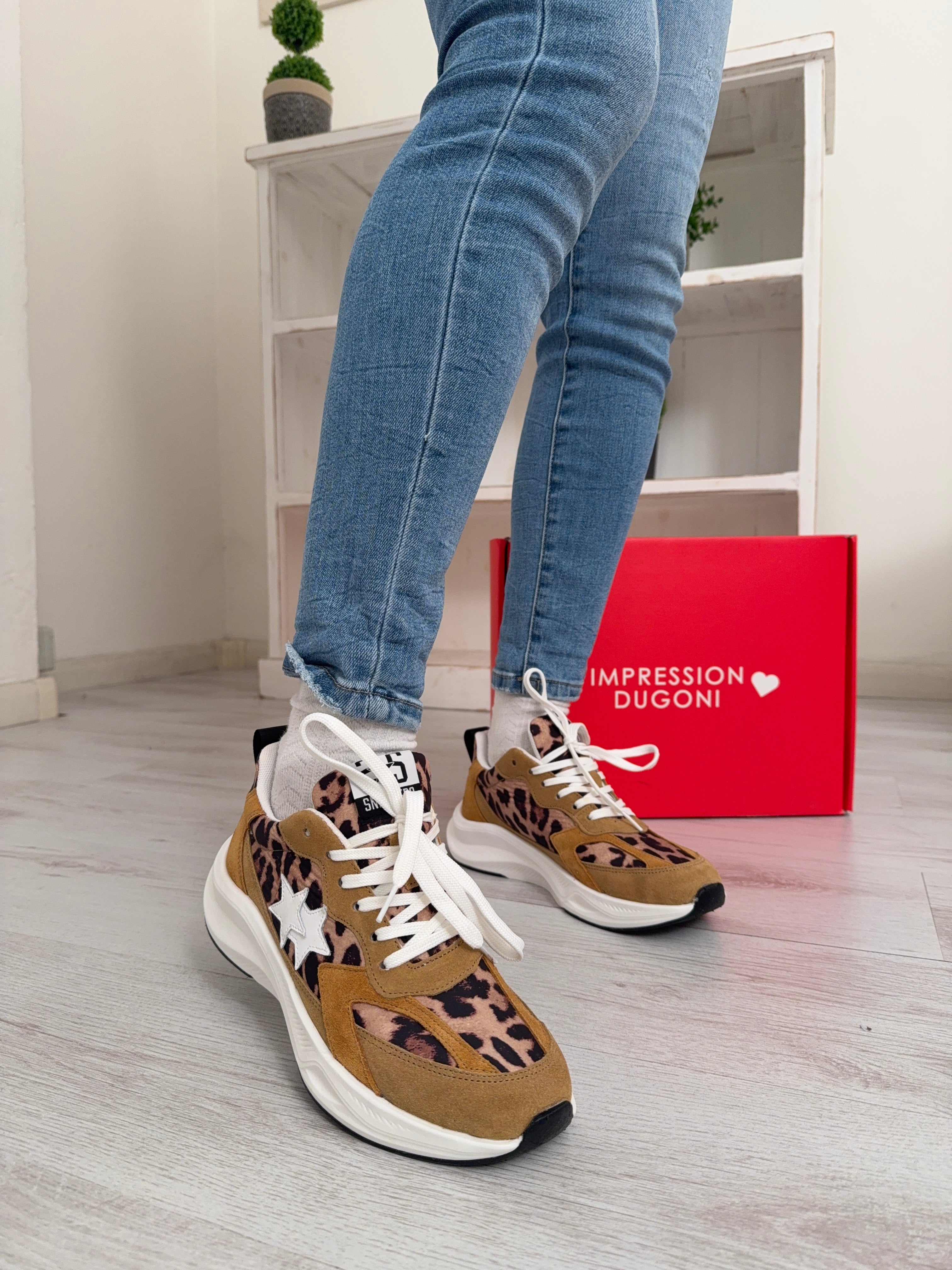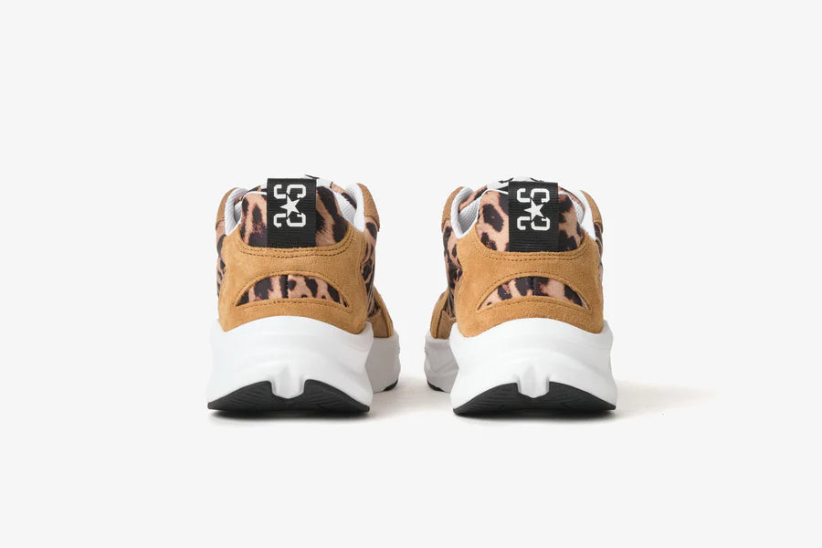 La tomaia in nylon leggero e resistente è valorizzata dalla stampa leopardata, decisa e di tendenza, mentre i dettagli in crosta color taupe aggiungono profondità materica e un contrasto elegante, creando un perfetto equilibrio tra stile urban e ricercatezza. L’iconica stella laterale completa il design con un accento distintivo.