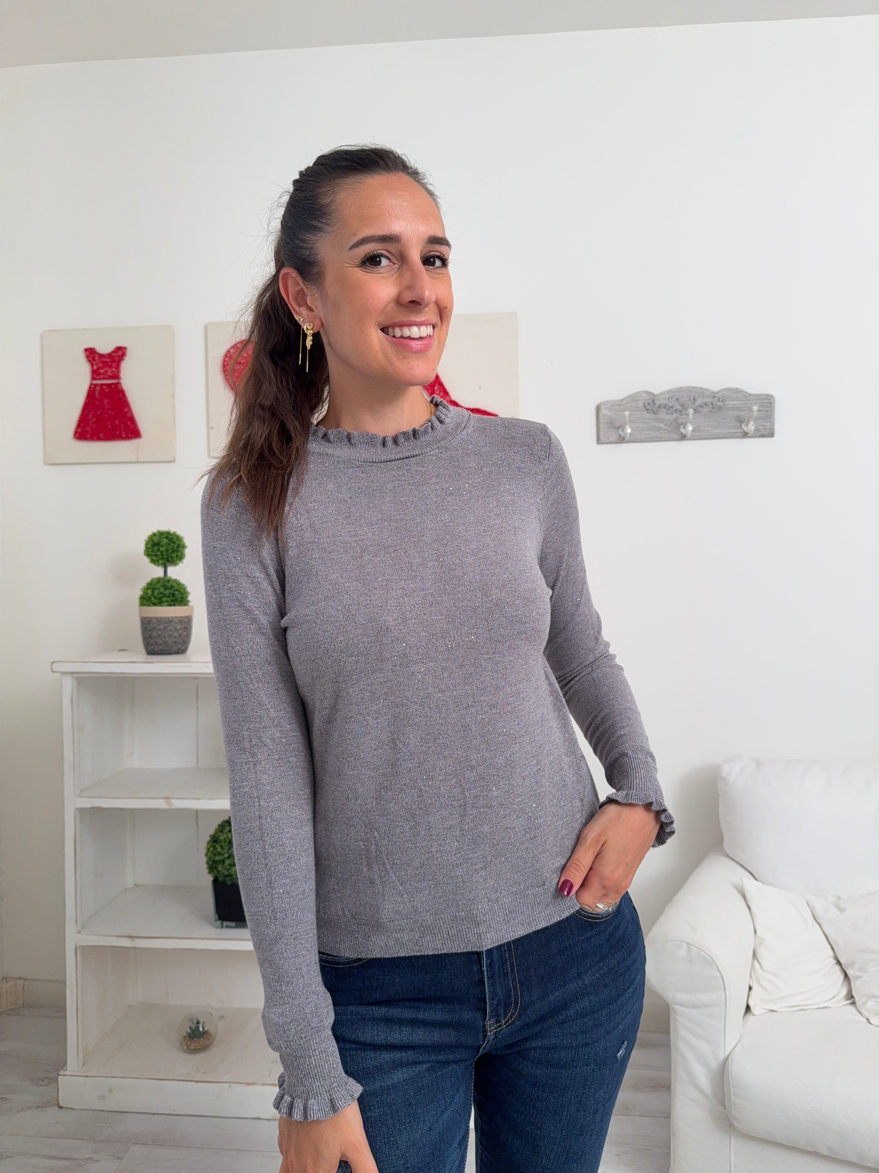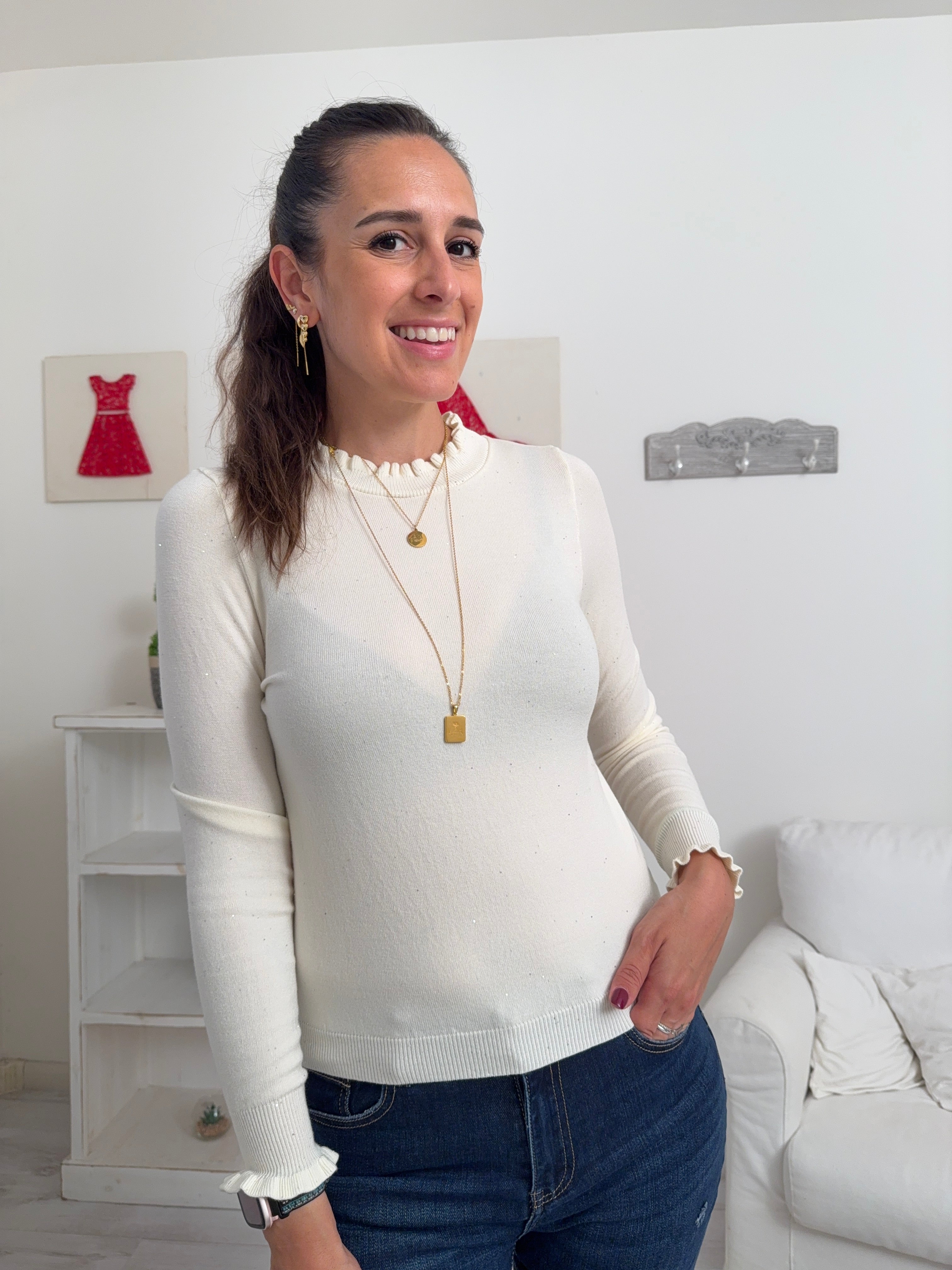 Descrizione: Maglioncino leggero con maniche lunghe con polsini ondulati e collo tondo ondulato. Piccole paillettes fini sparse