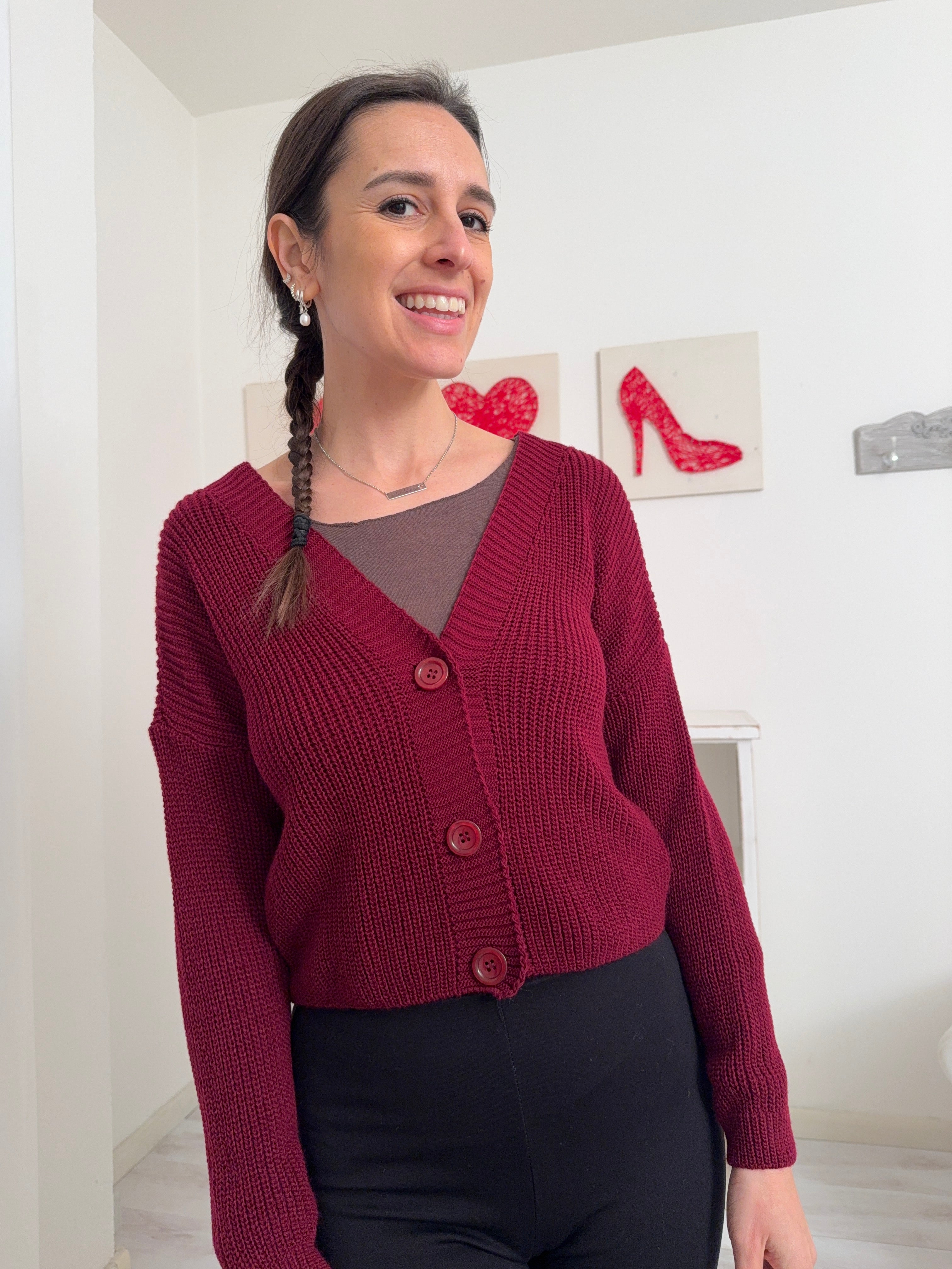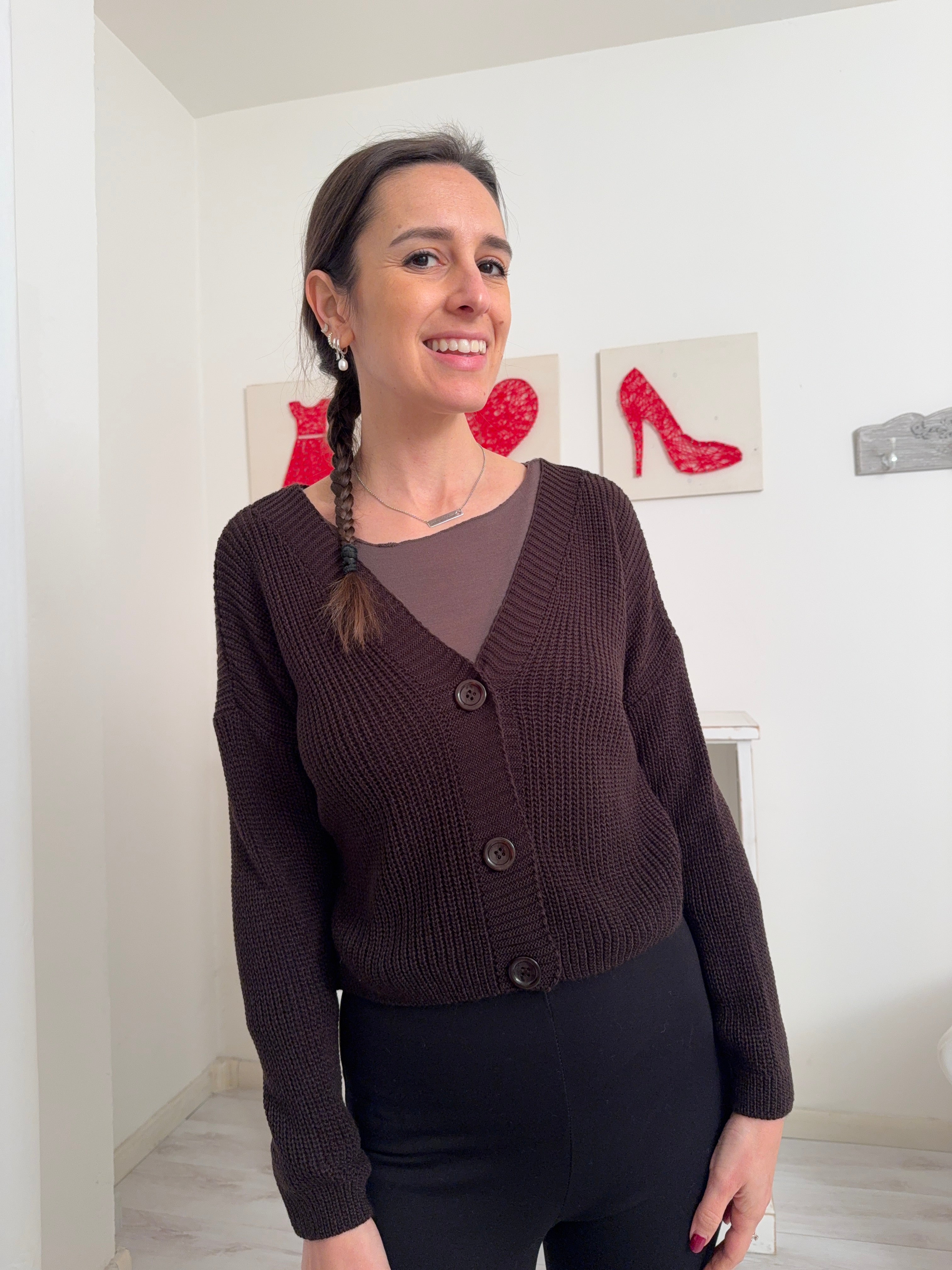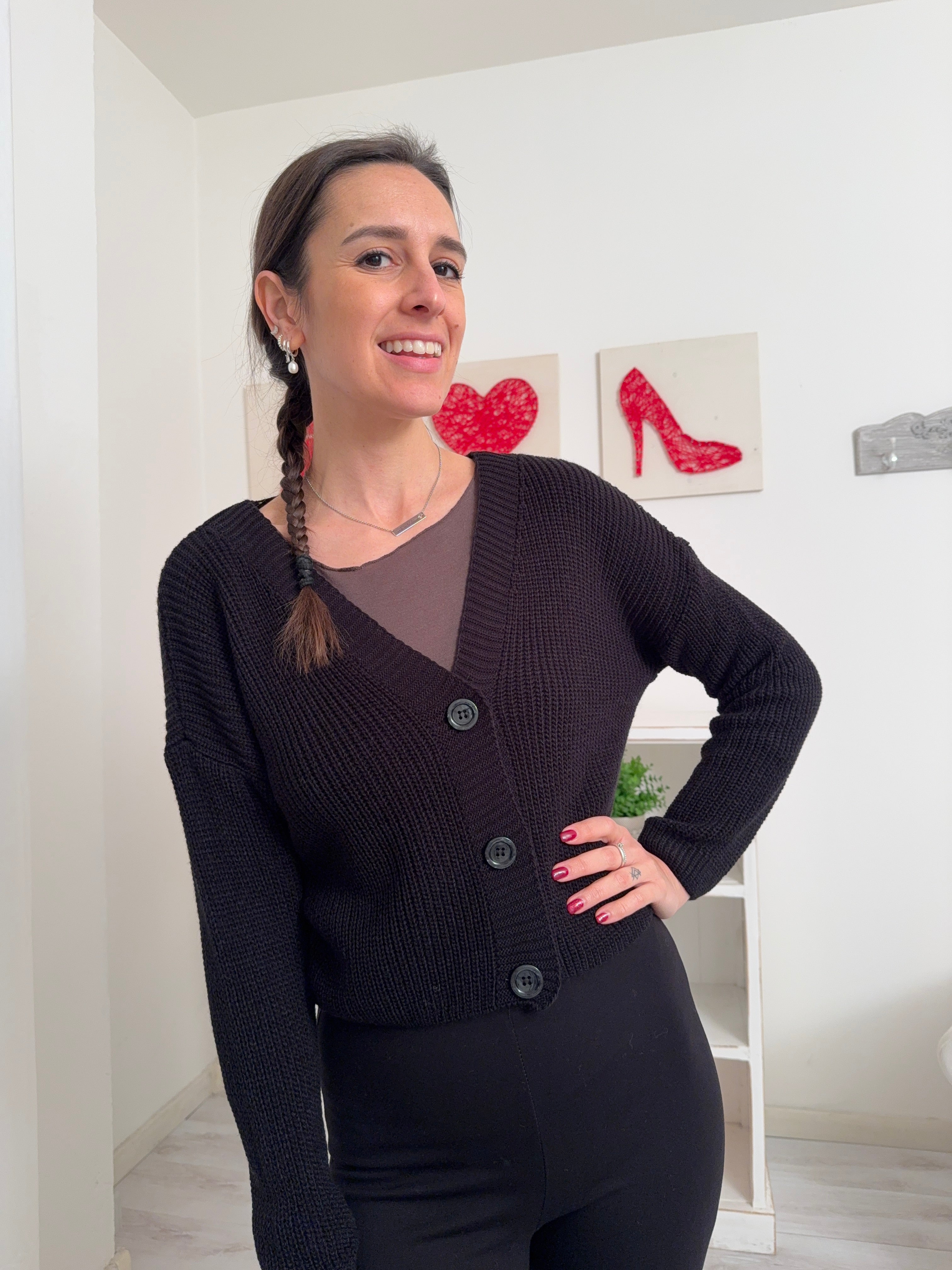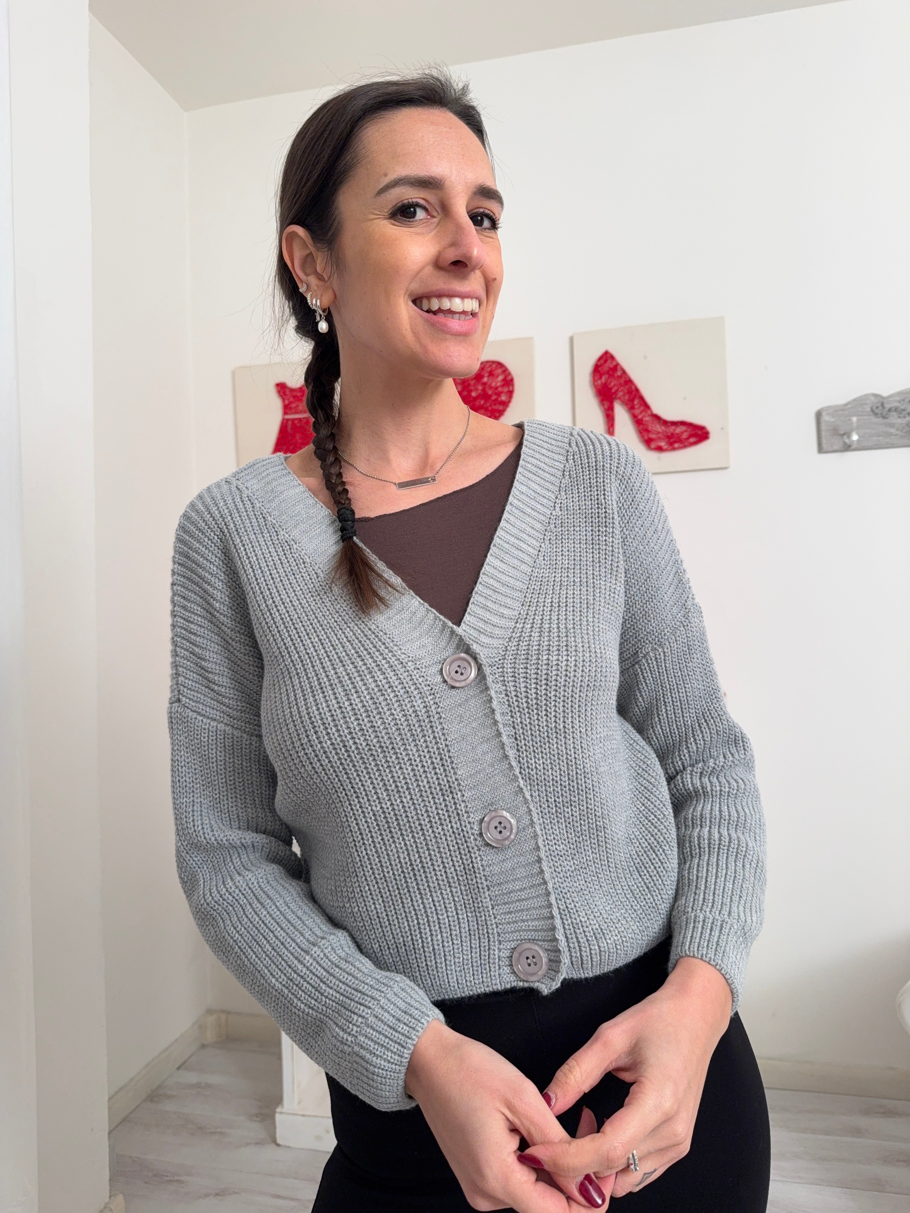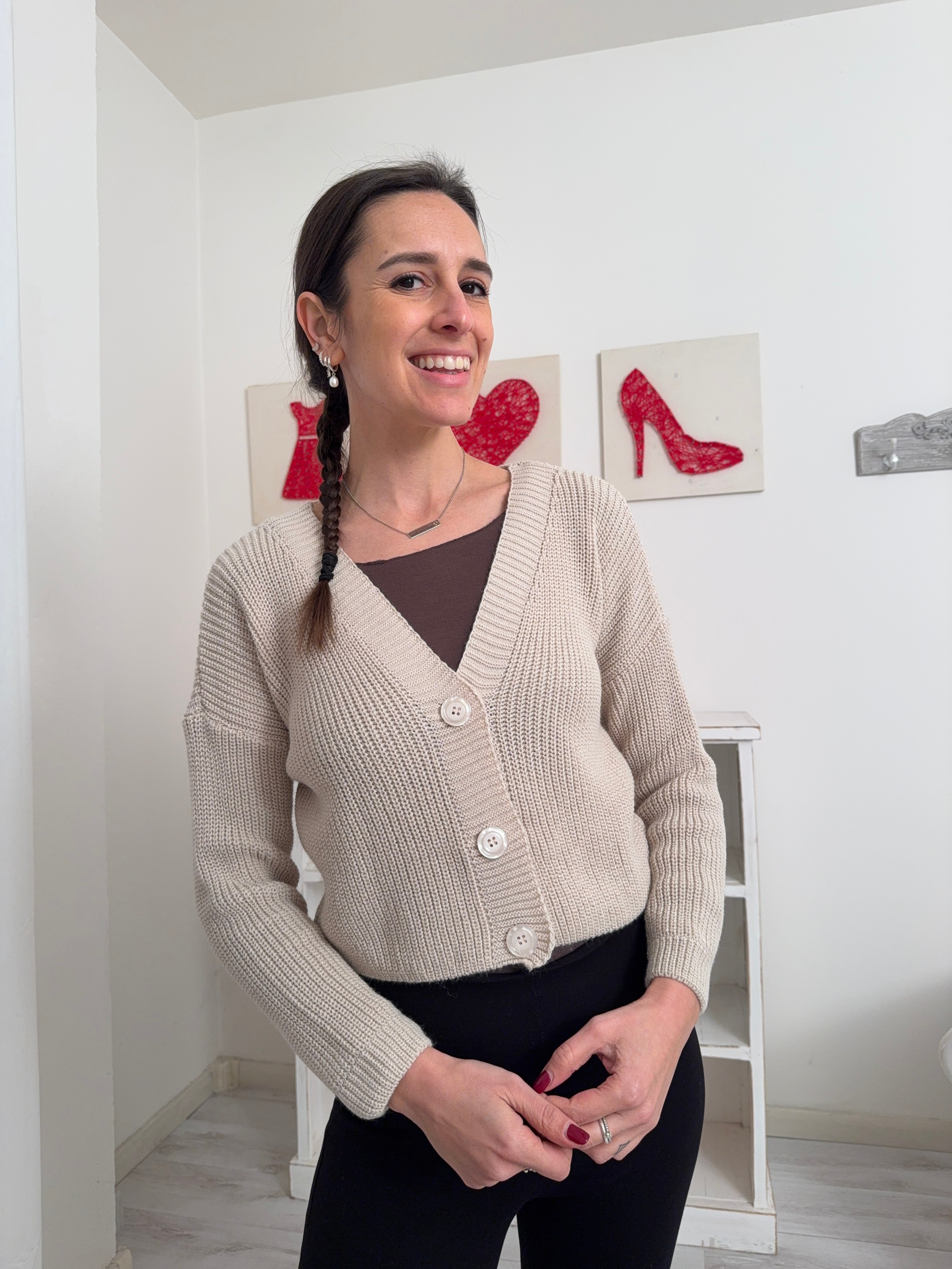 Descrizione: Cardigan leggermente crop con manica lunga e tre bottoni.